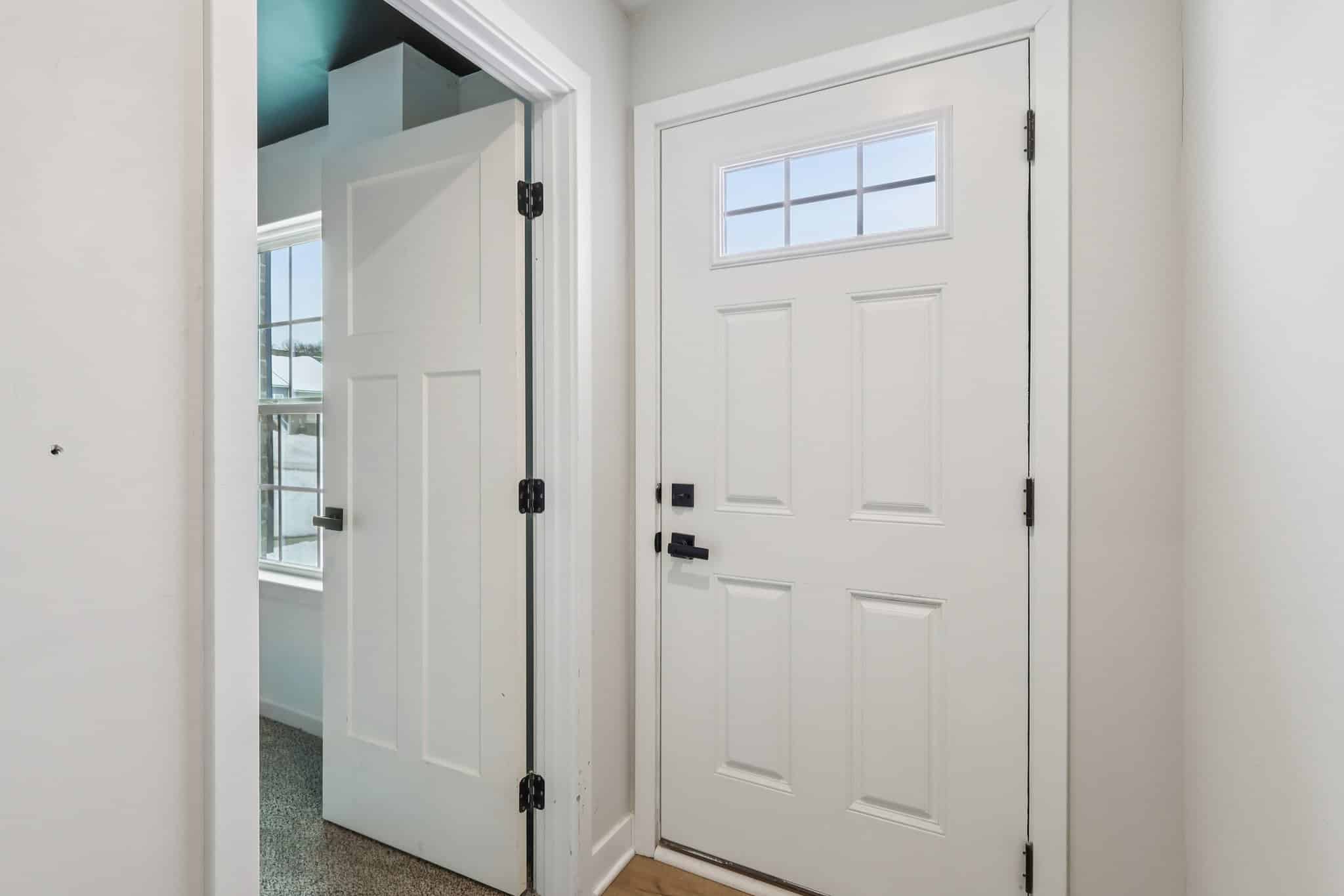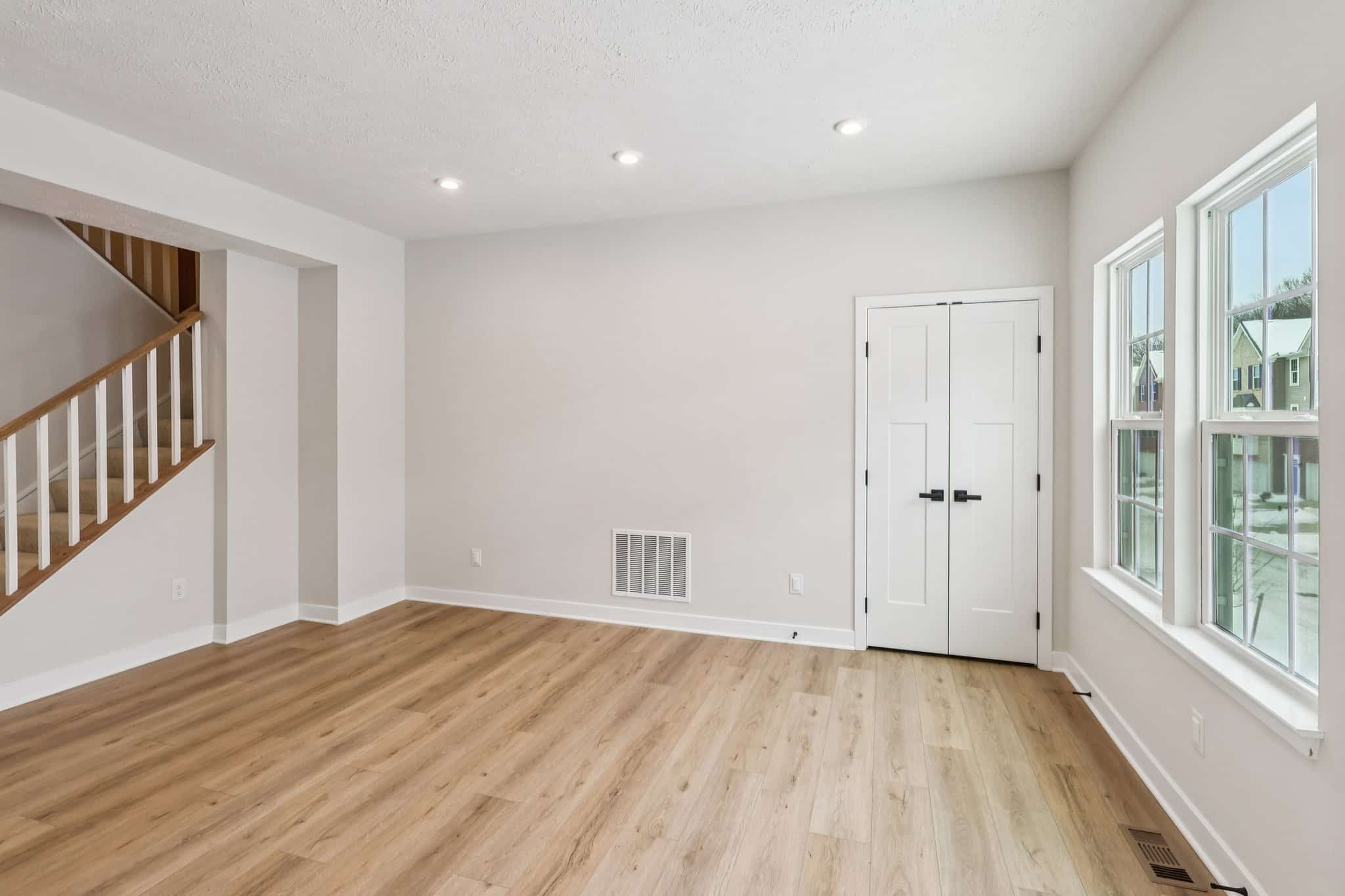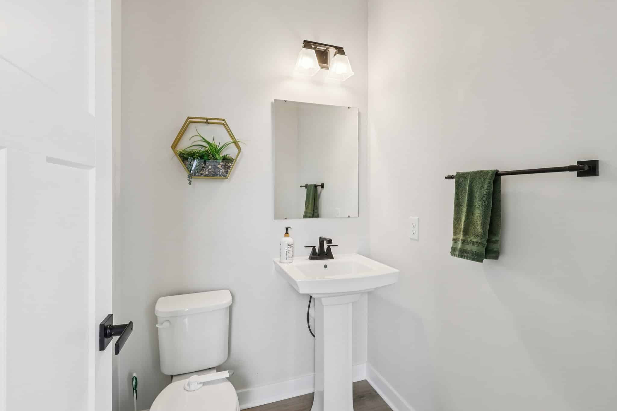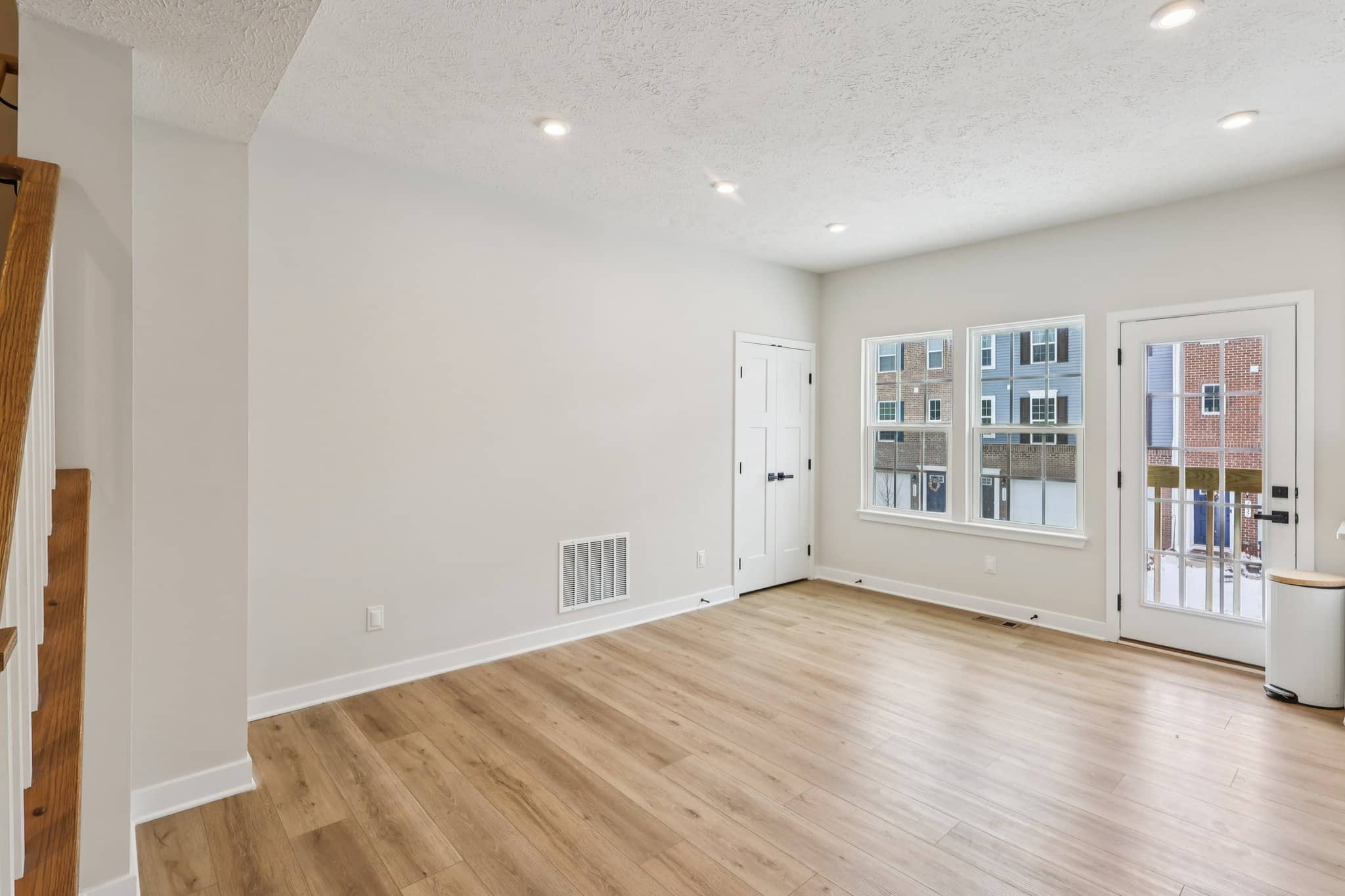 The living room features multiple windows and a soaring ceiling, along with a charming alcove that’s perfectly suited for a home office, reading nook, or creative workspace. A half bathroom on the main level adds extra convenience for guests.