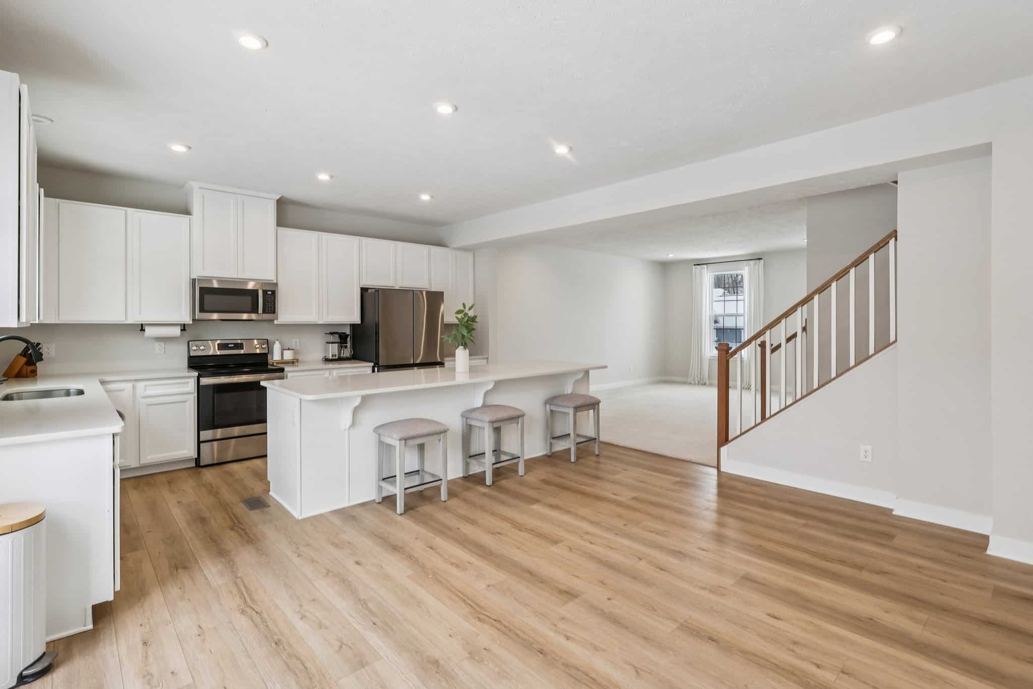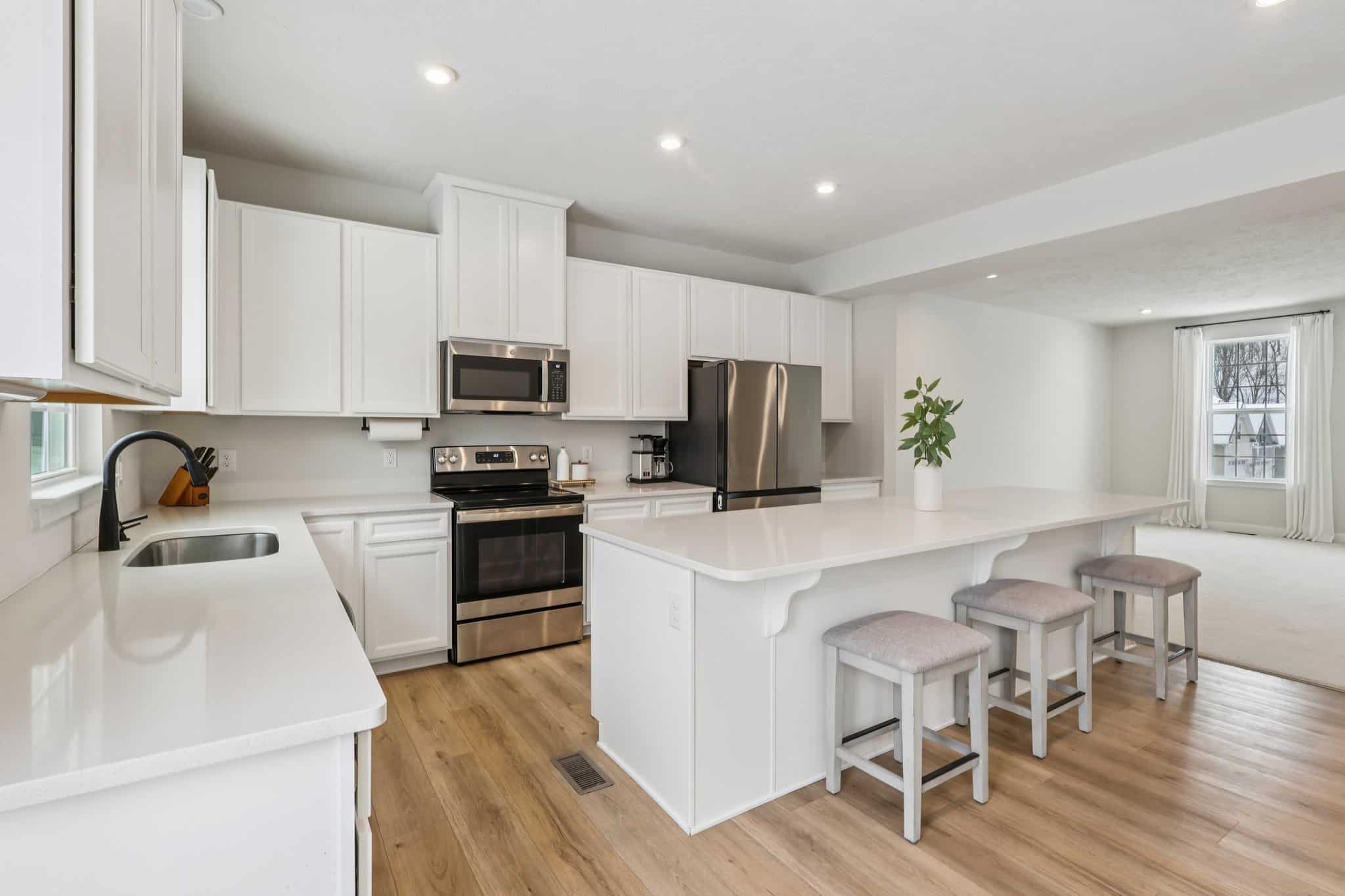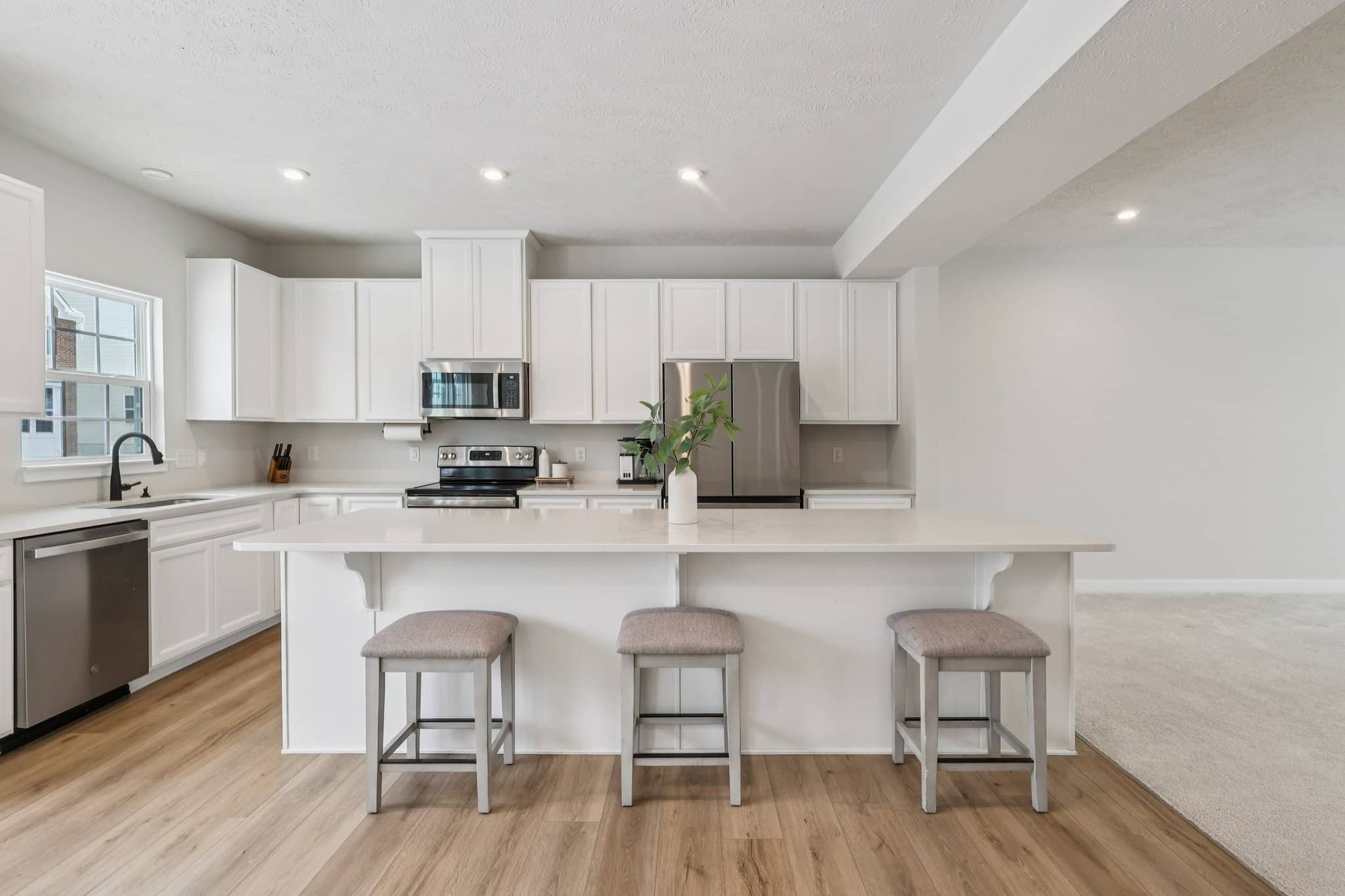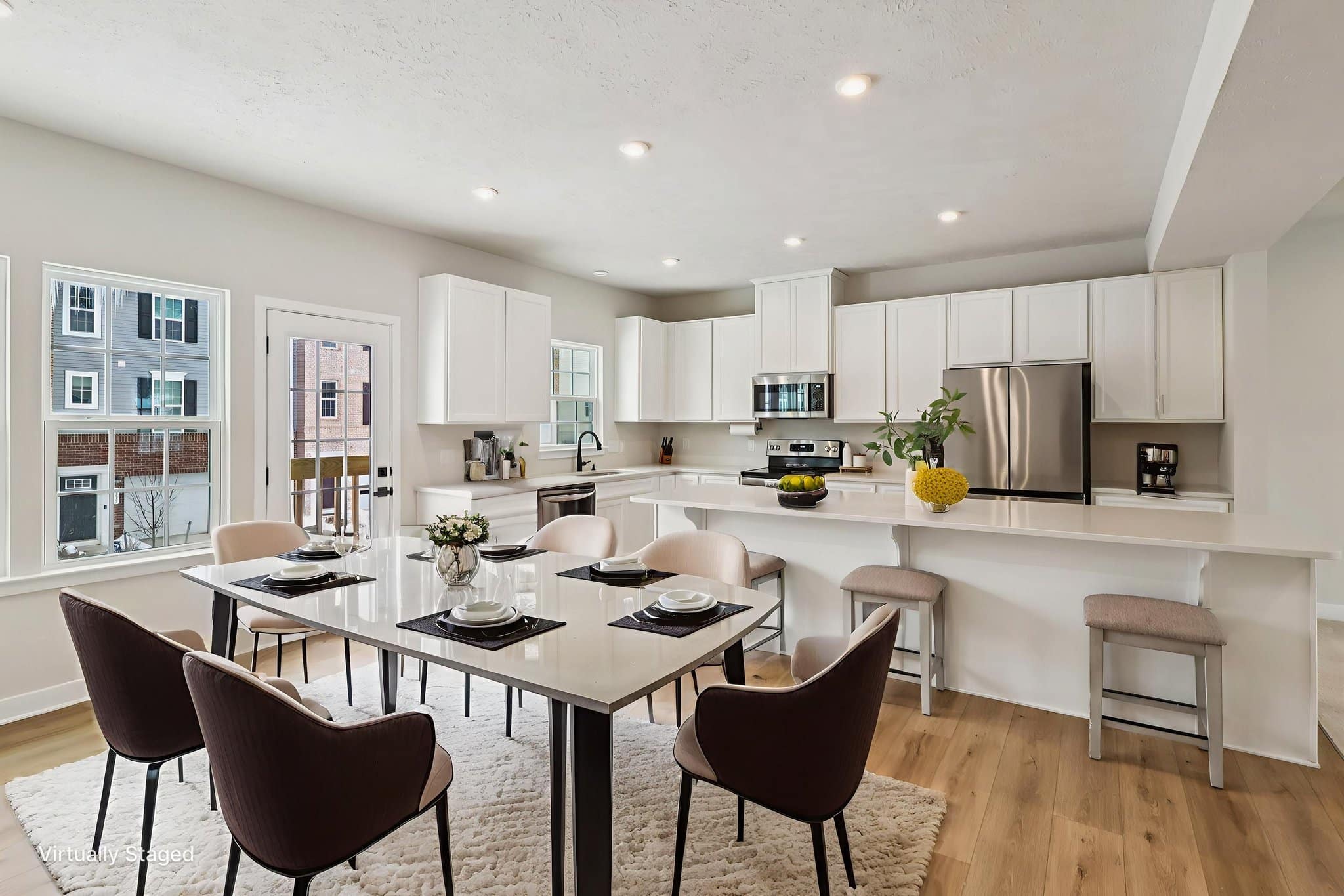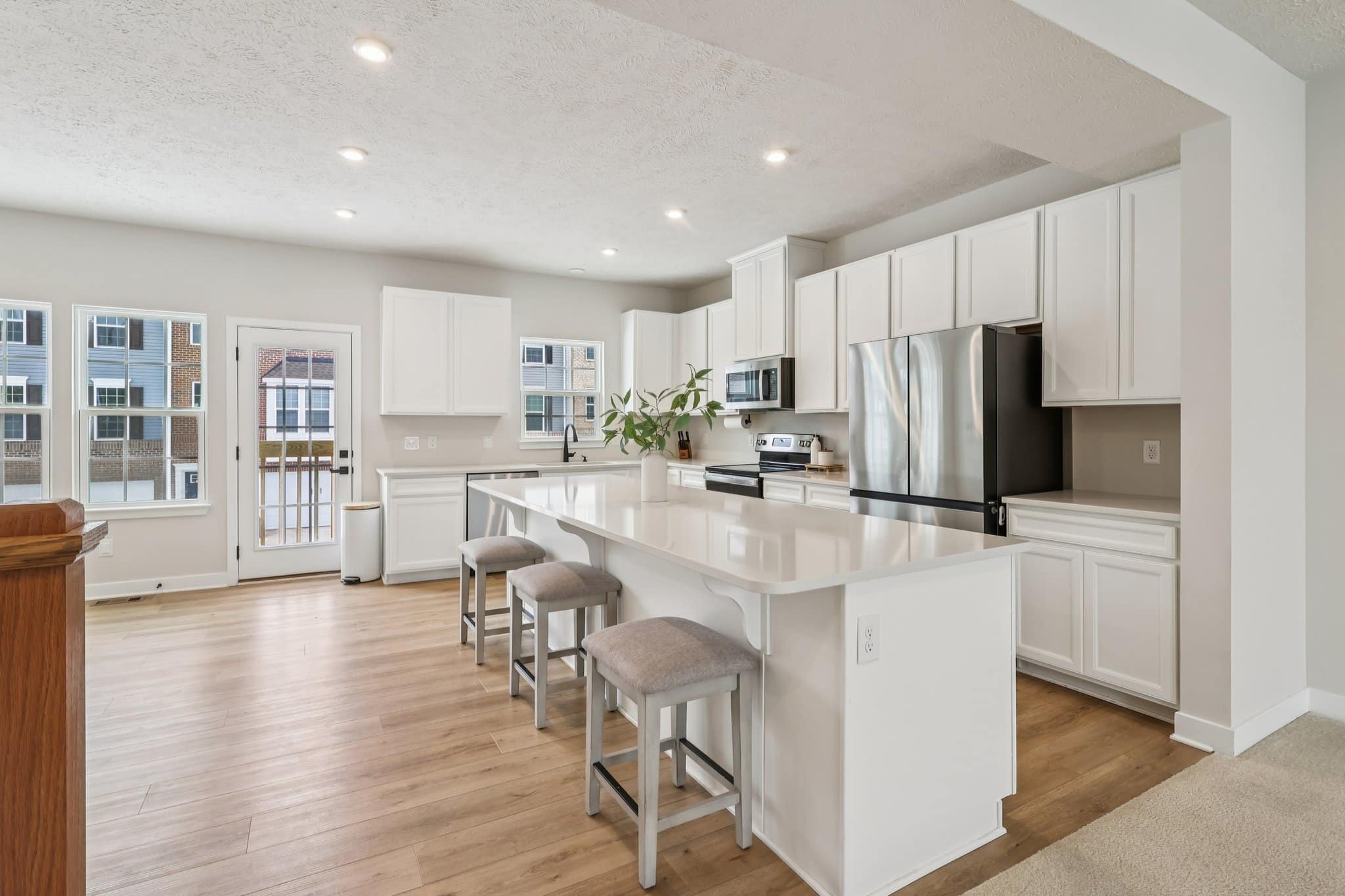 The heart of the home is the well-appointed kitchen, complete with an expansive center island/breakfast bar, Quartz countertops, stainless steel appliances, and extensive cabinetry—ideal for both everyday living and entertaining. Adjacent to the kitchen, the spacious dining area is filled with natural light and offers convenient access to the outdoors, making indoor-outdoor gatherings effortless once a balcony deck is installed.