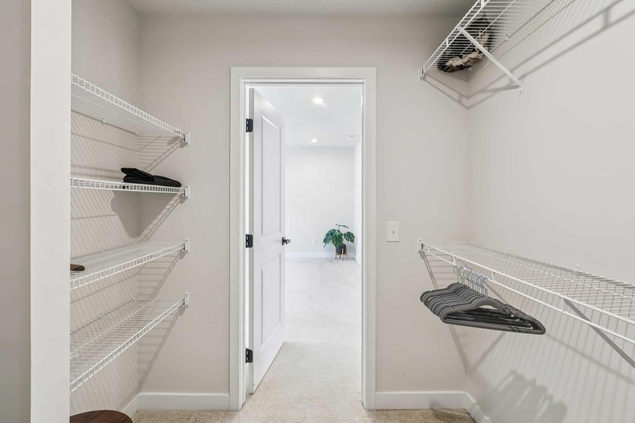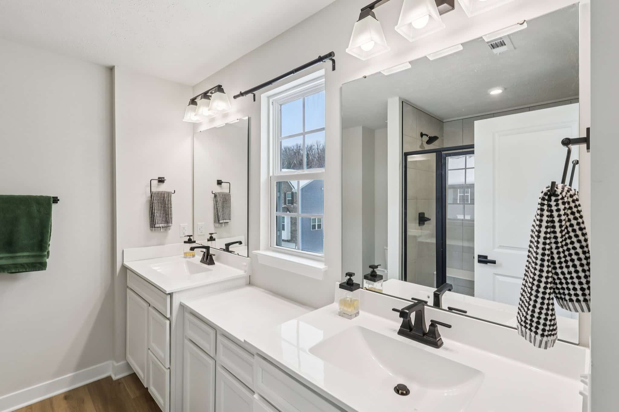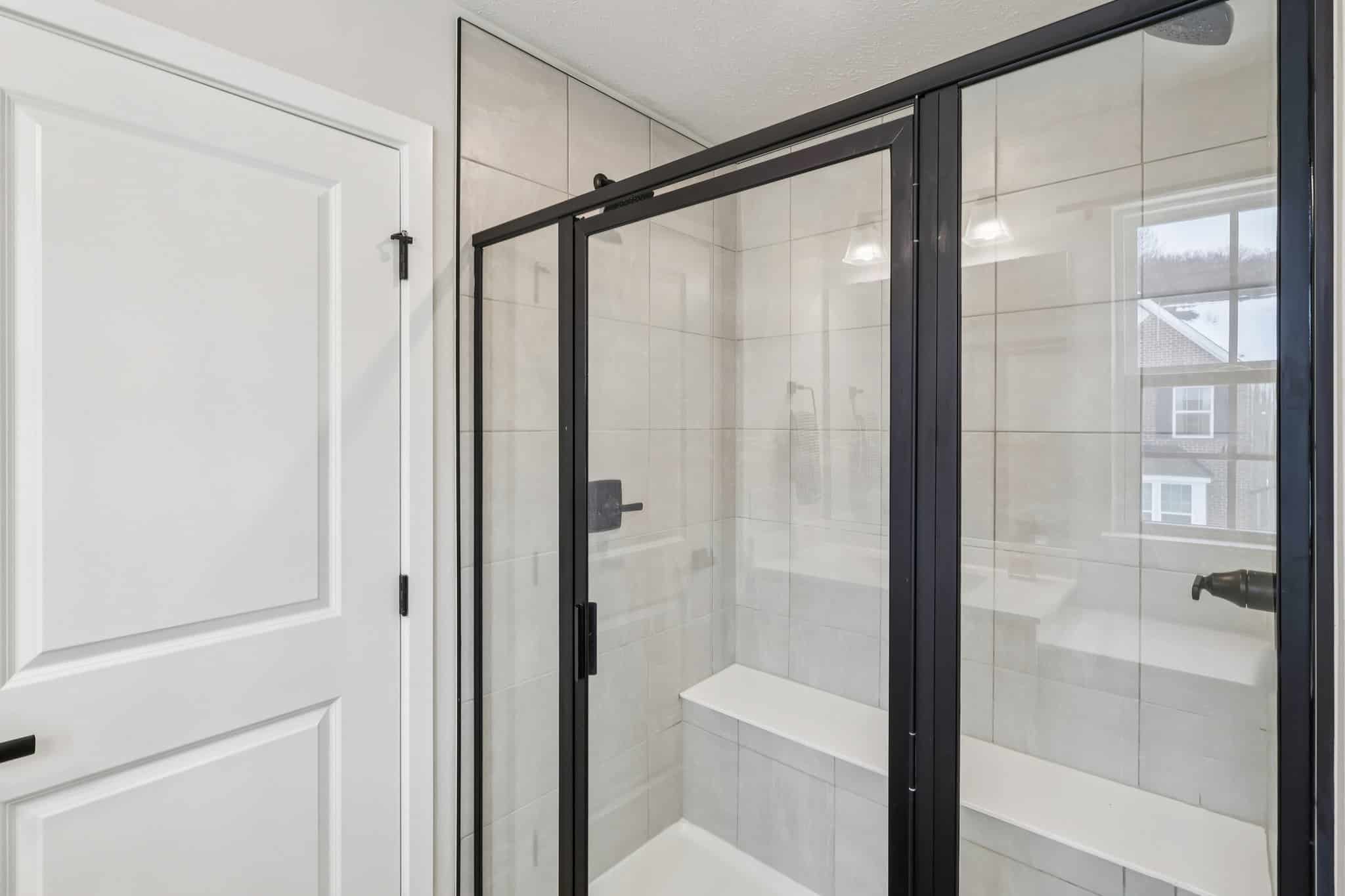 Upstairs, the primary suite serves as a relaxing retreat, featuring a walk-in closet and an ensuite bathroom with double sinks and a shower with built-in seating.