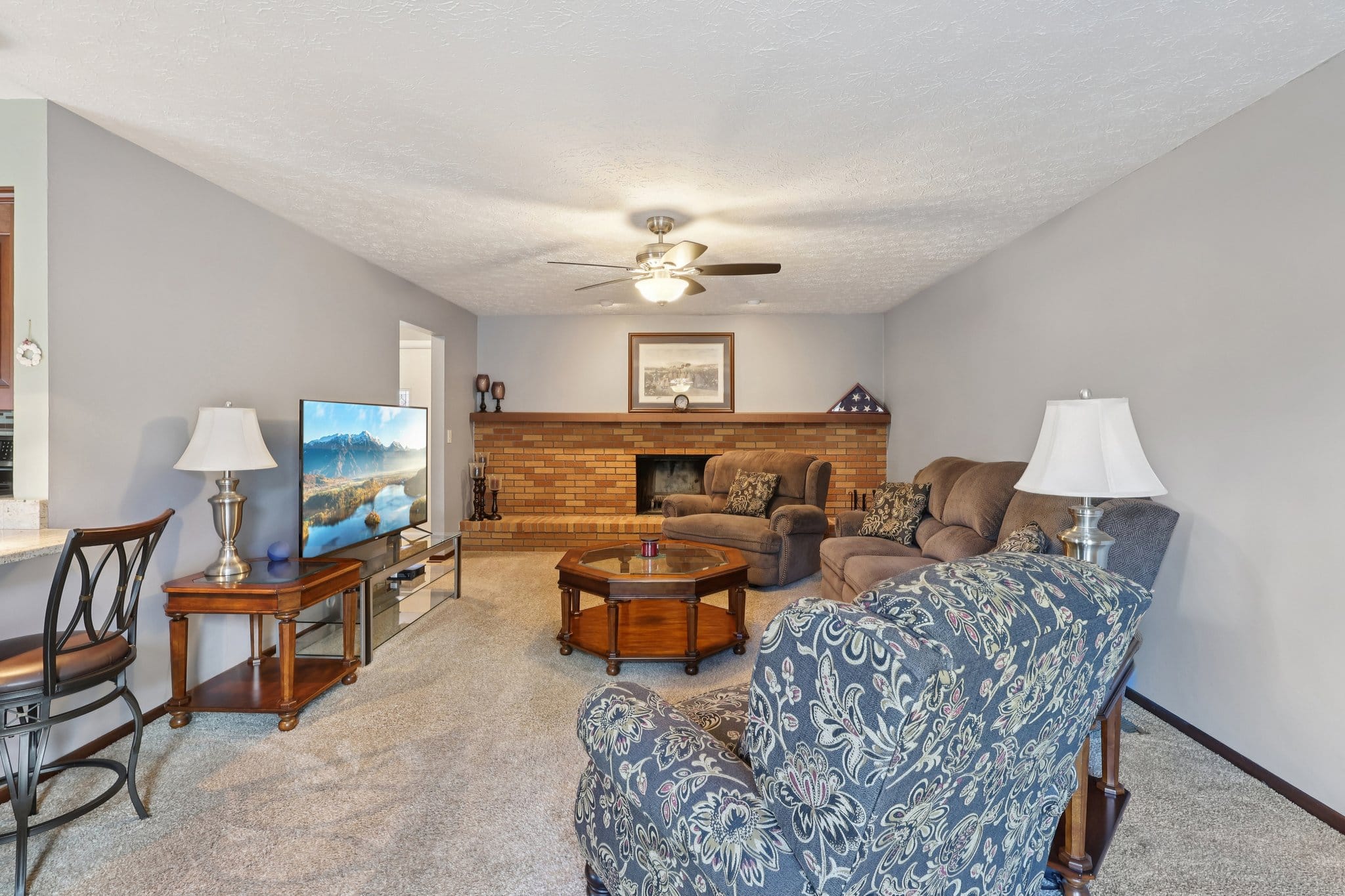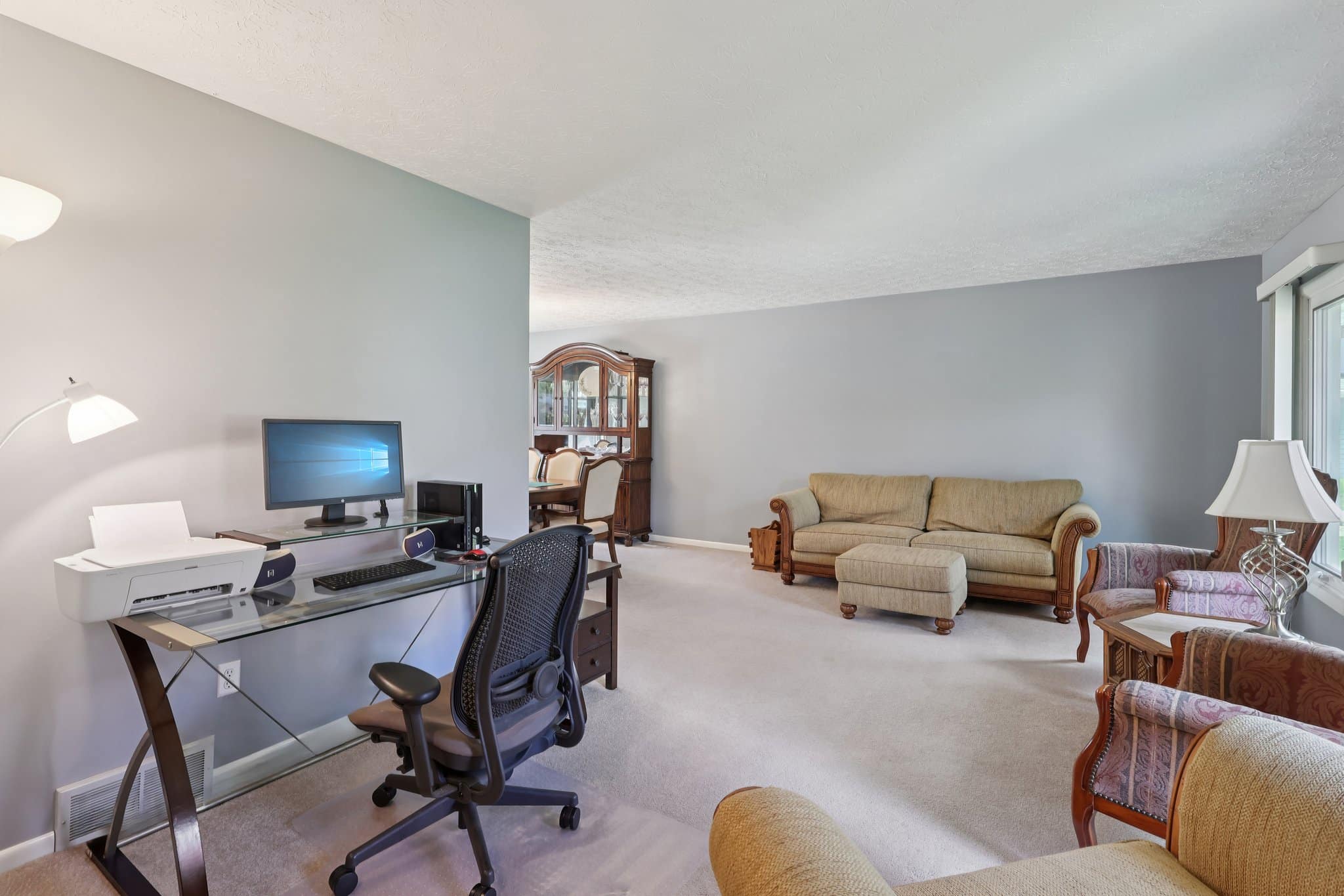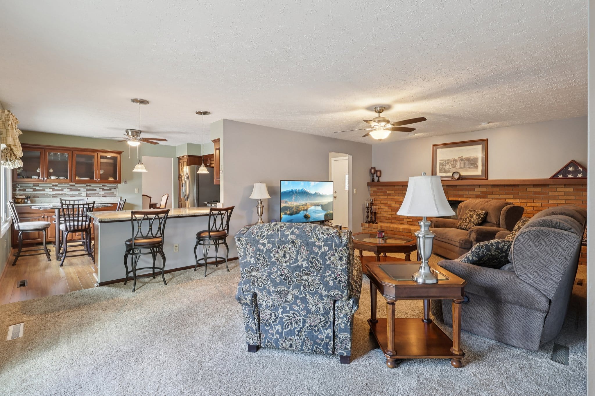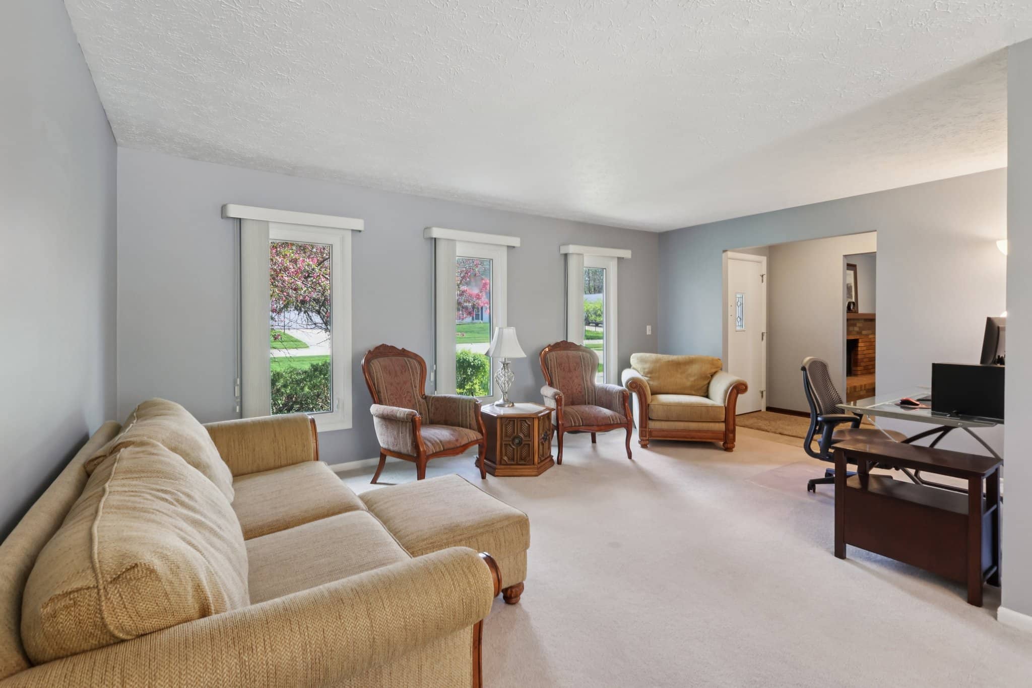 The spacious living room is filled with natural light from multiple windows and flows seamlessly into the dining room, highlighted by a large picture window-perfect for everyday living and entertaining.