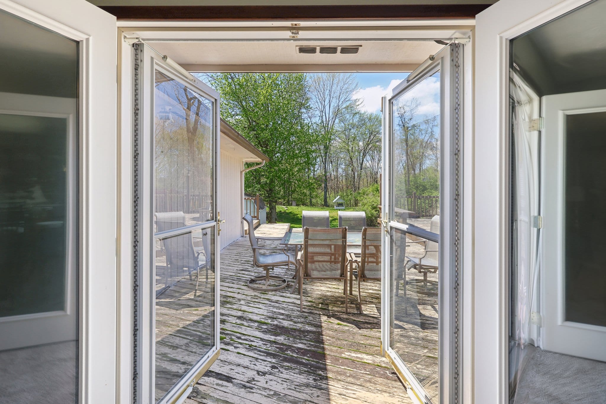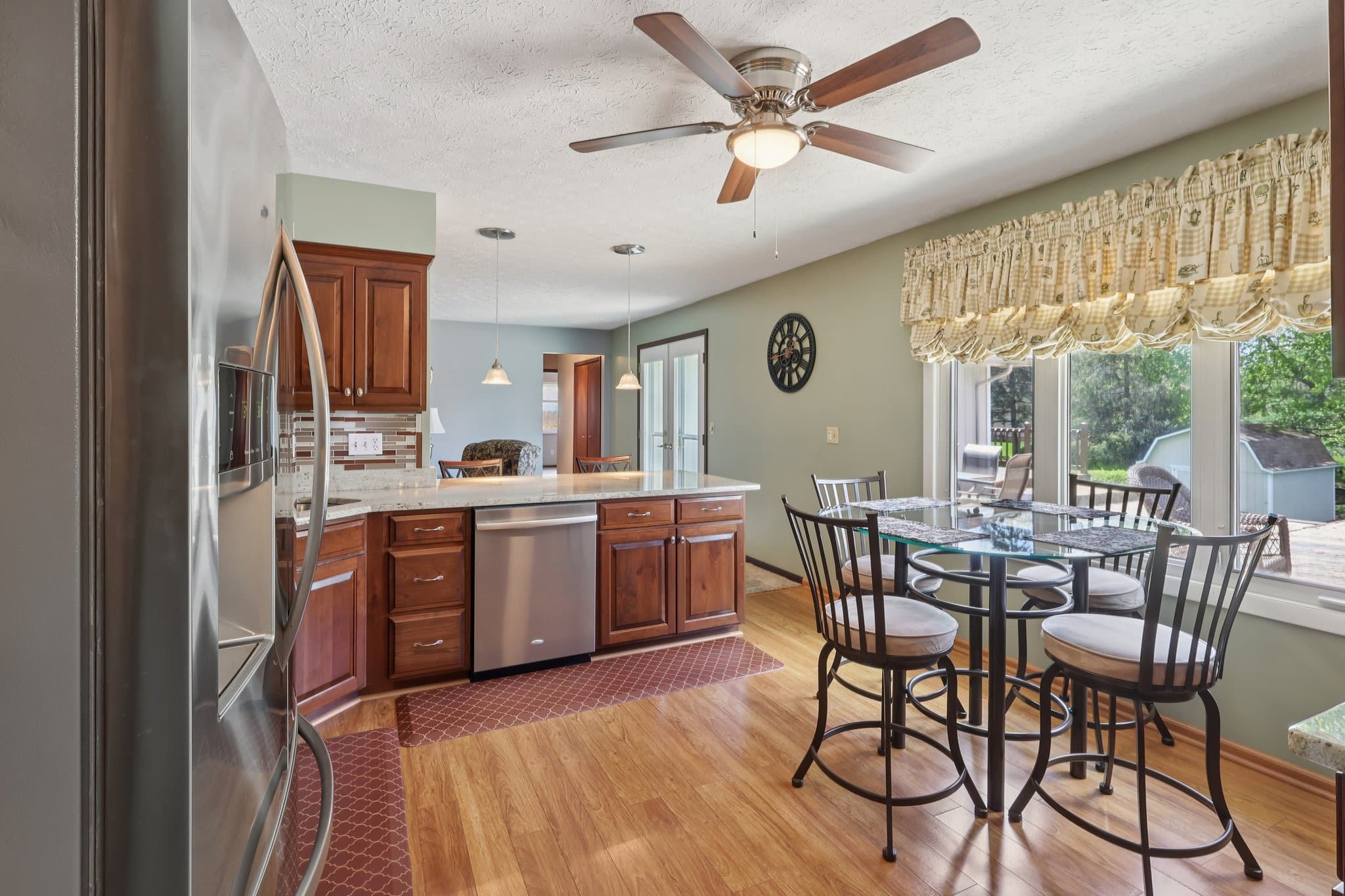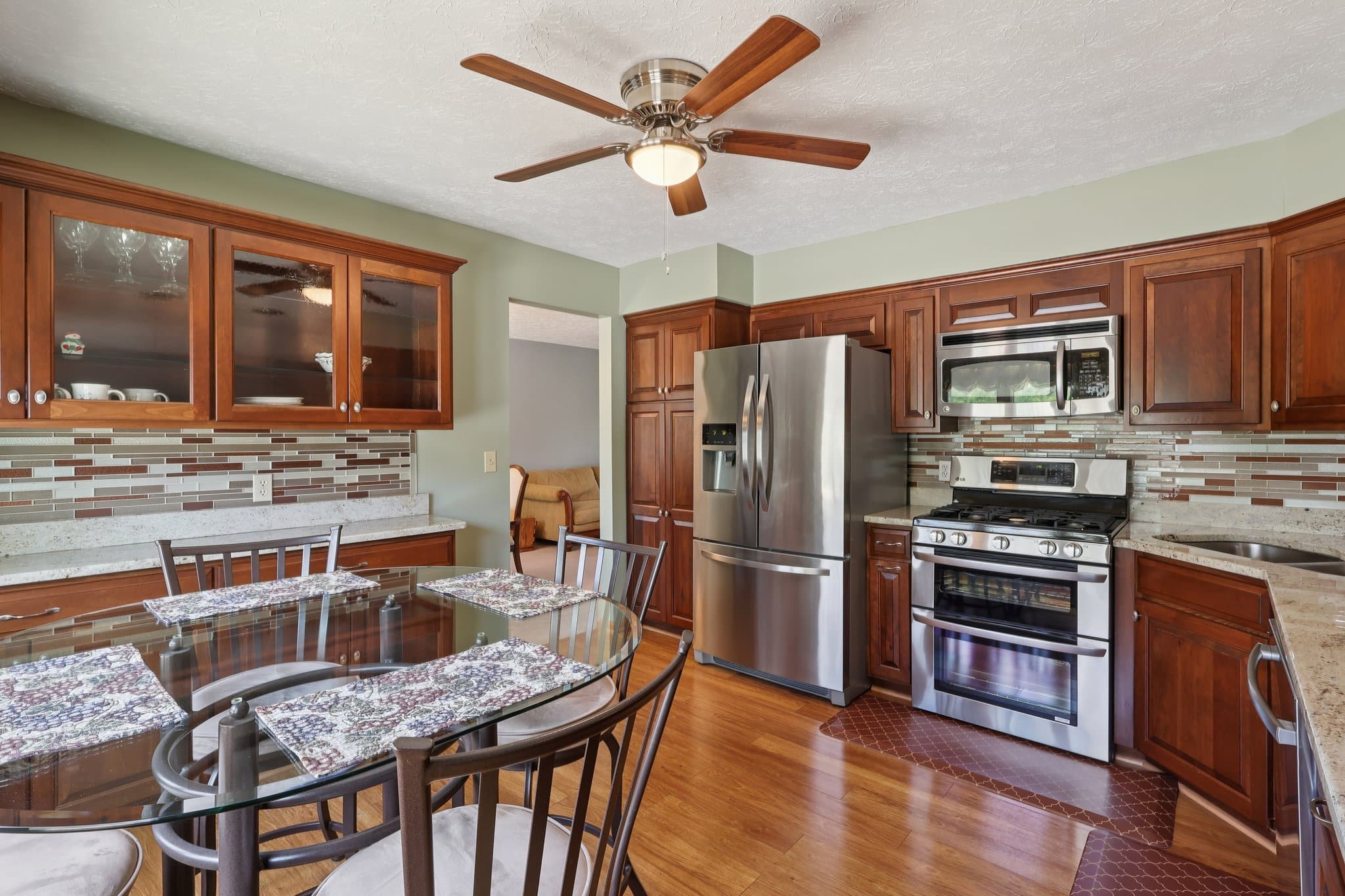 The gourmet kitchen is thoughtfully designed with extensive cabinetry, granite countertops, stainless steel appliances, and a coffee bar. Just off the kitchen, the inviting family room features a cozy brick fireplace, ceiling fan, and glass French doors that open to the expansive multi-level deck.