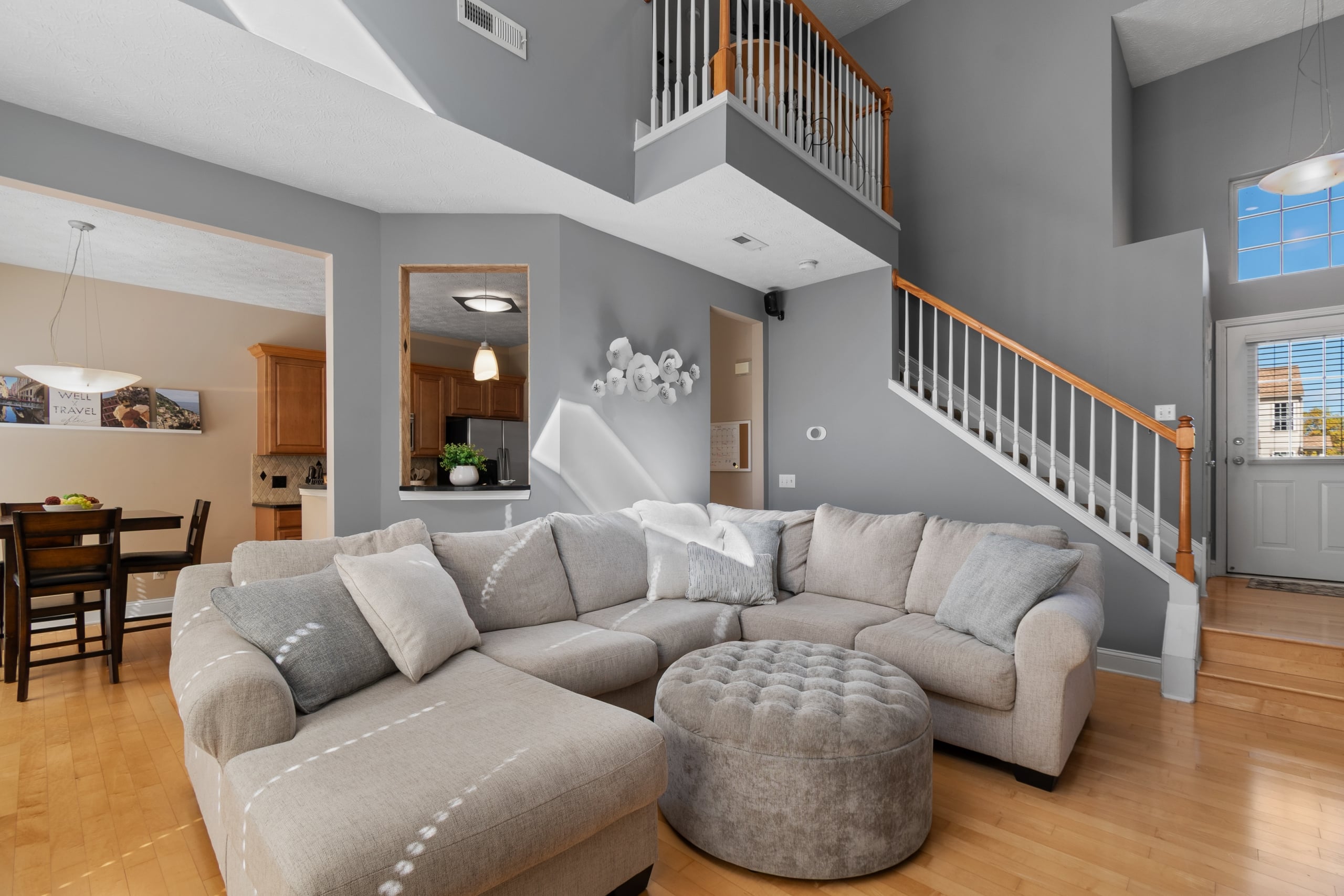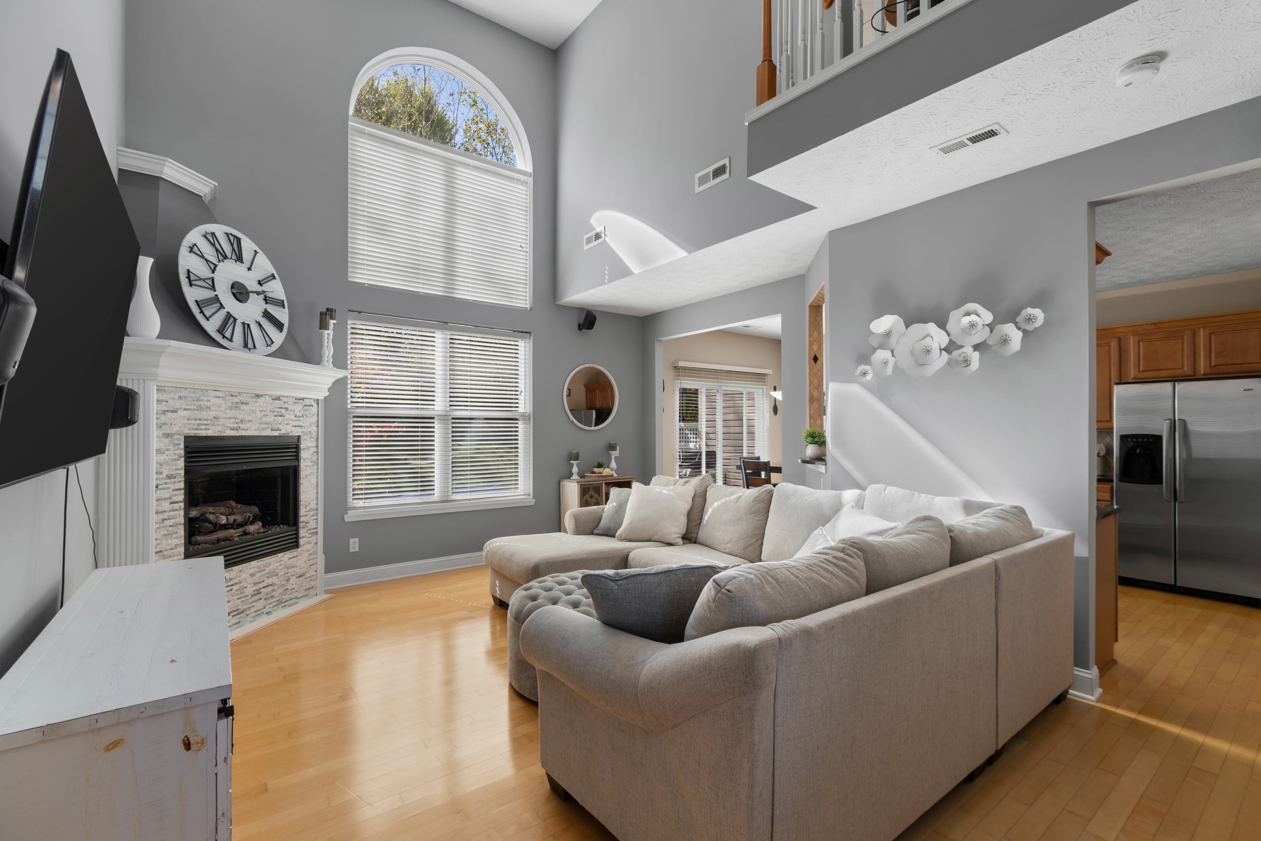 The inviting, two-story living room impresses with gleaming hardwood floors, a floor-to-ceiling window that fills the space with natural light, and a cozy gas fireplace perfect for relaxing evenings.