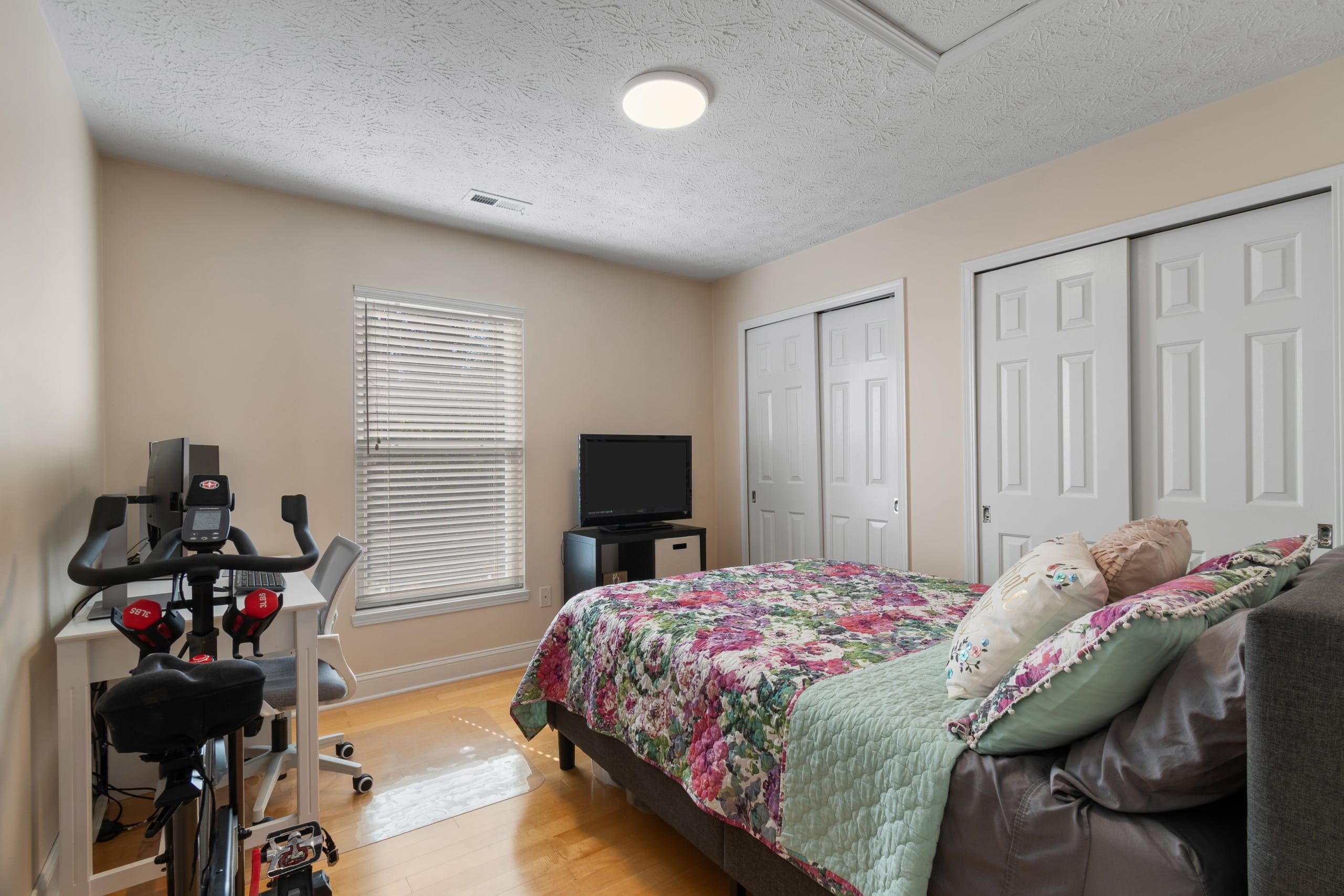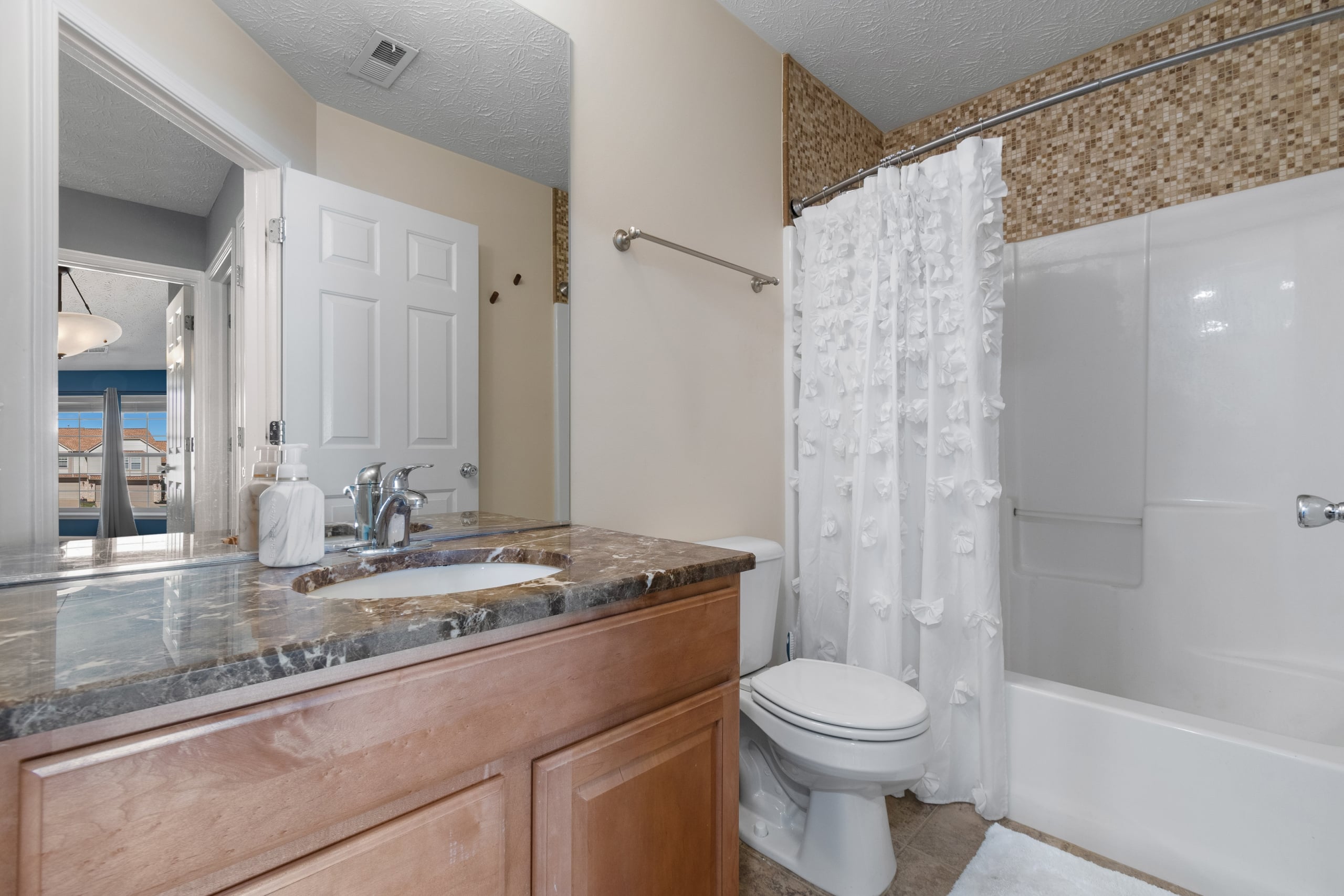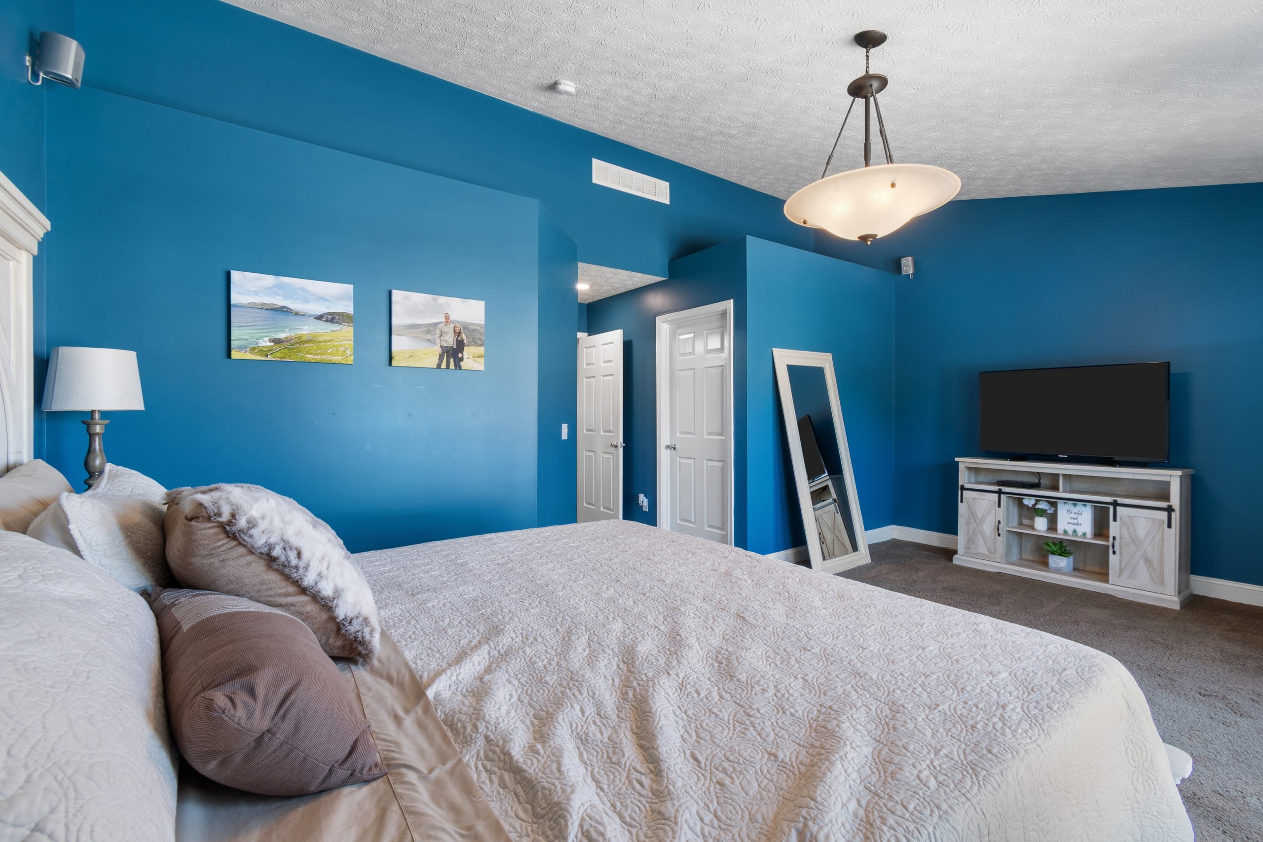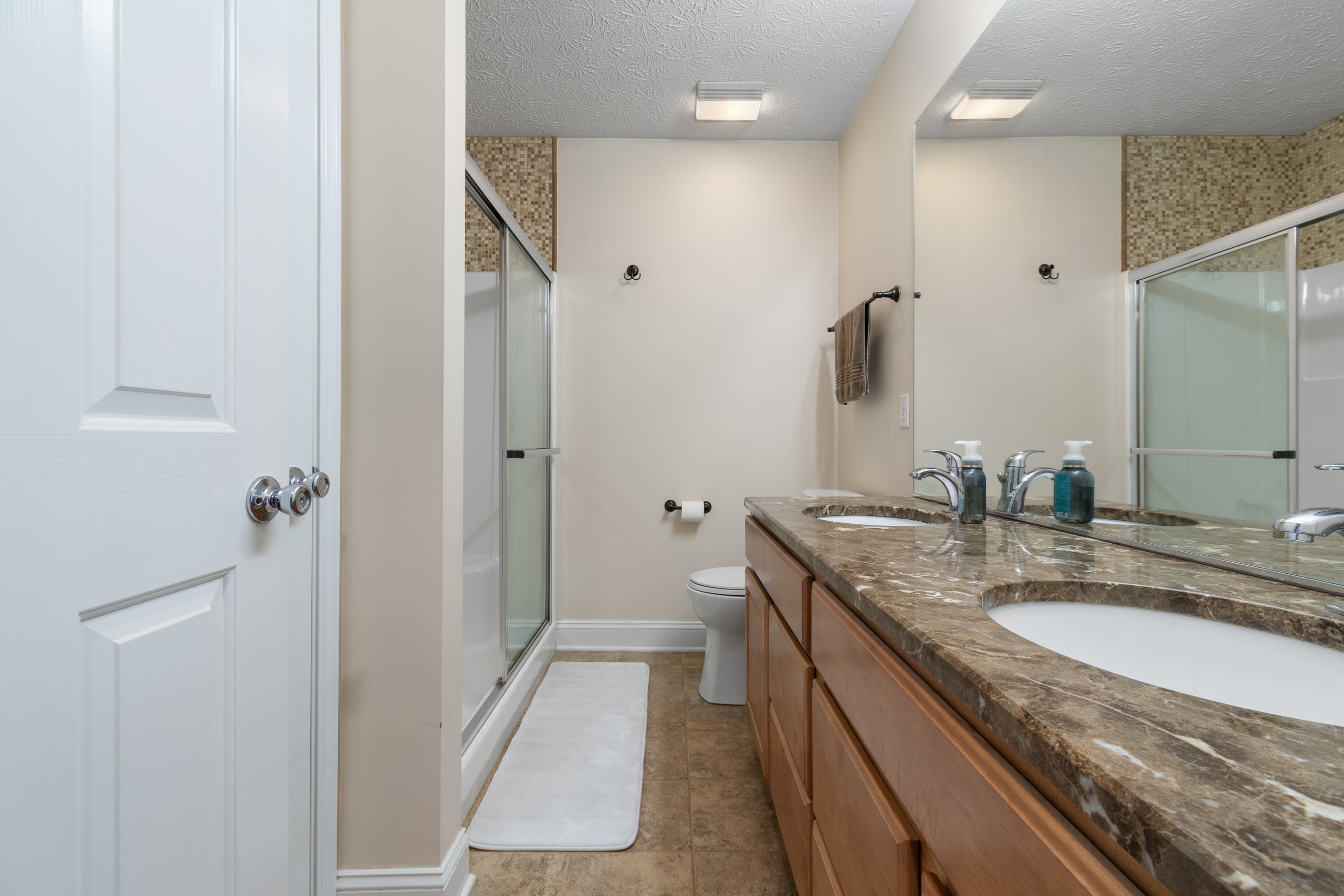Upstairs, the spacious primary bedroom features a vaulted ceiling, large windows, and an ensuite bathroom complete with double sinks and granite countertops.