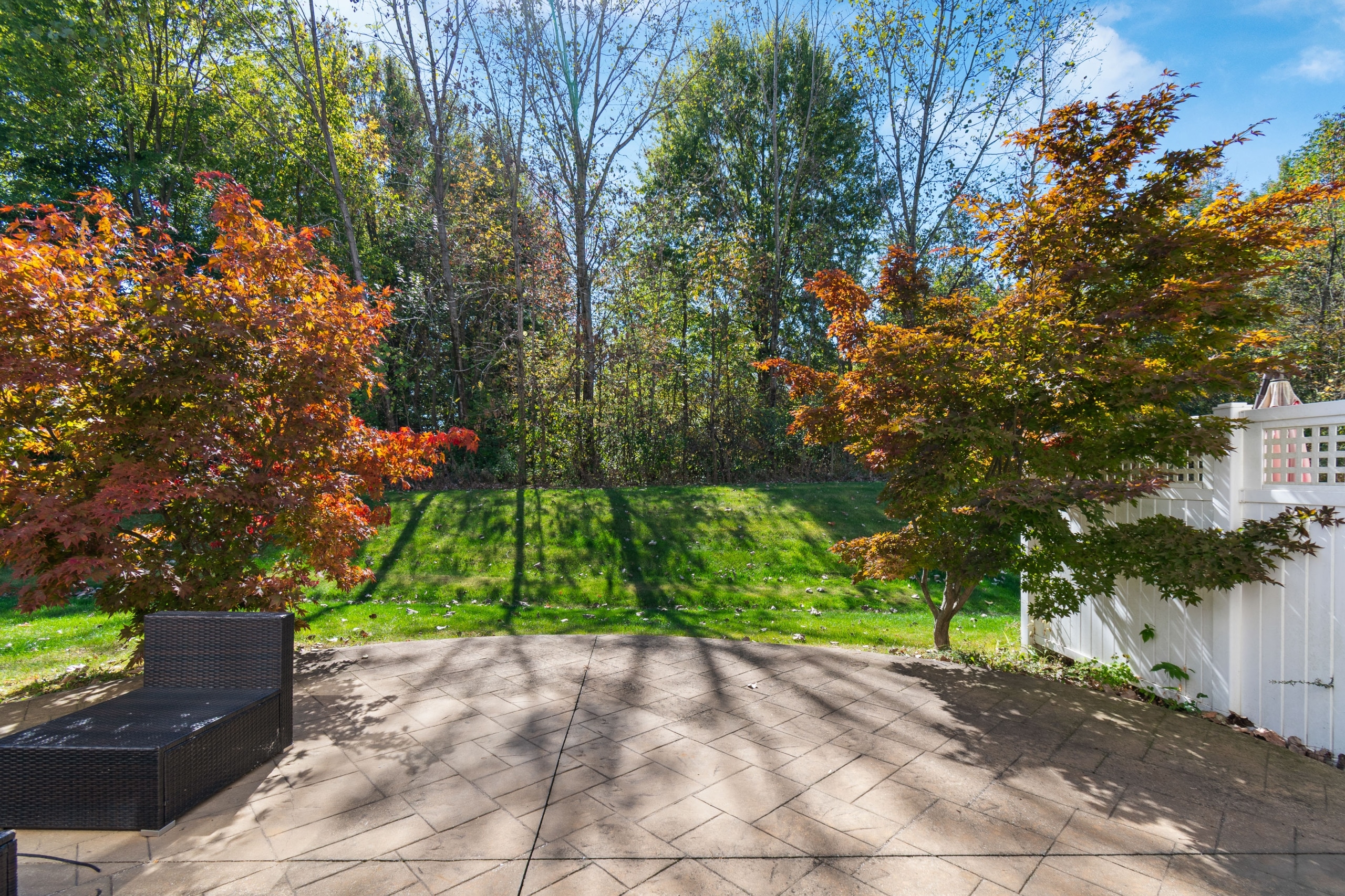 A stamped concrete patio can be accessed through the sliding doors off the kitchen, and overlooks peaceful greenspace.