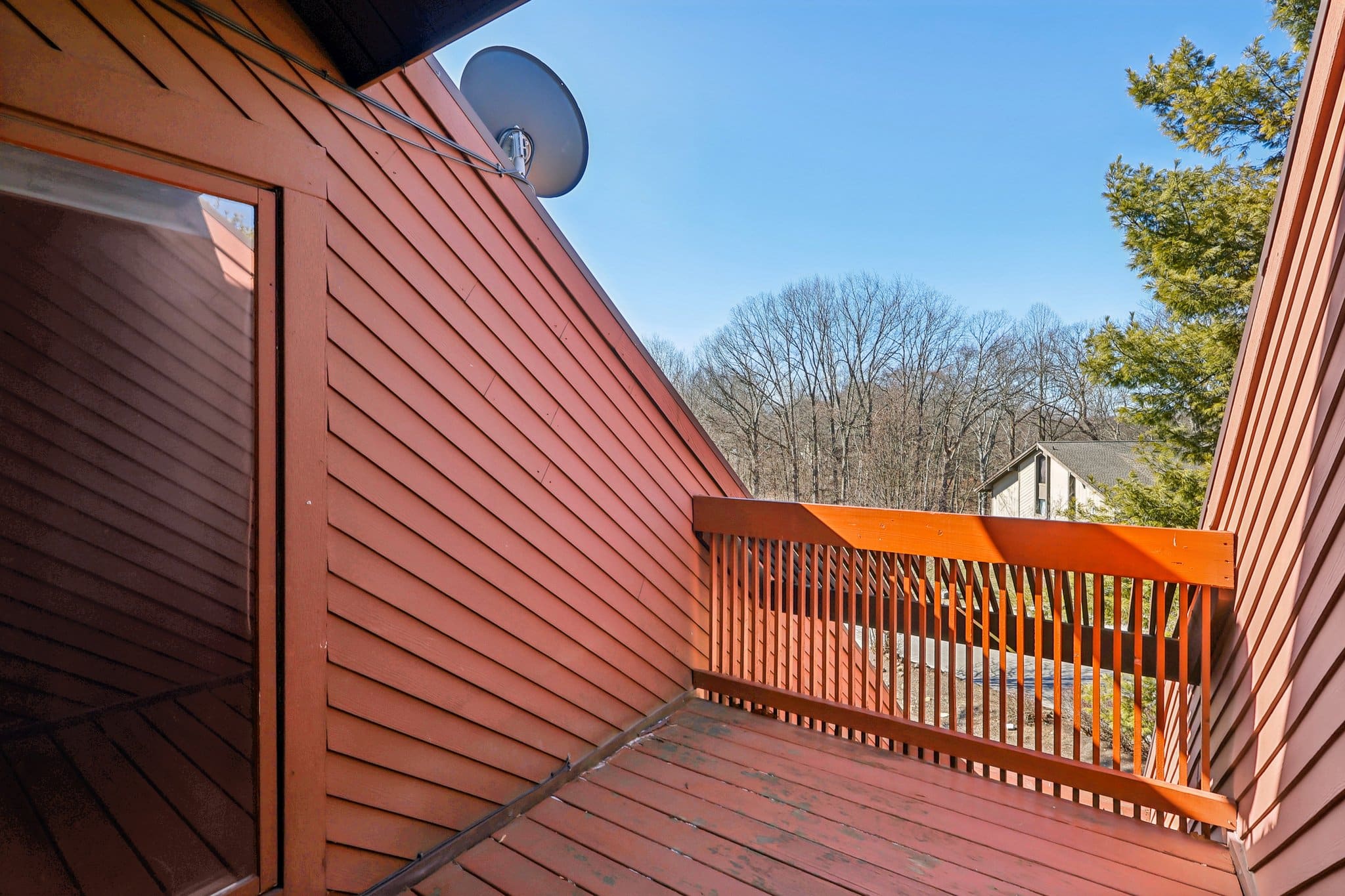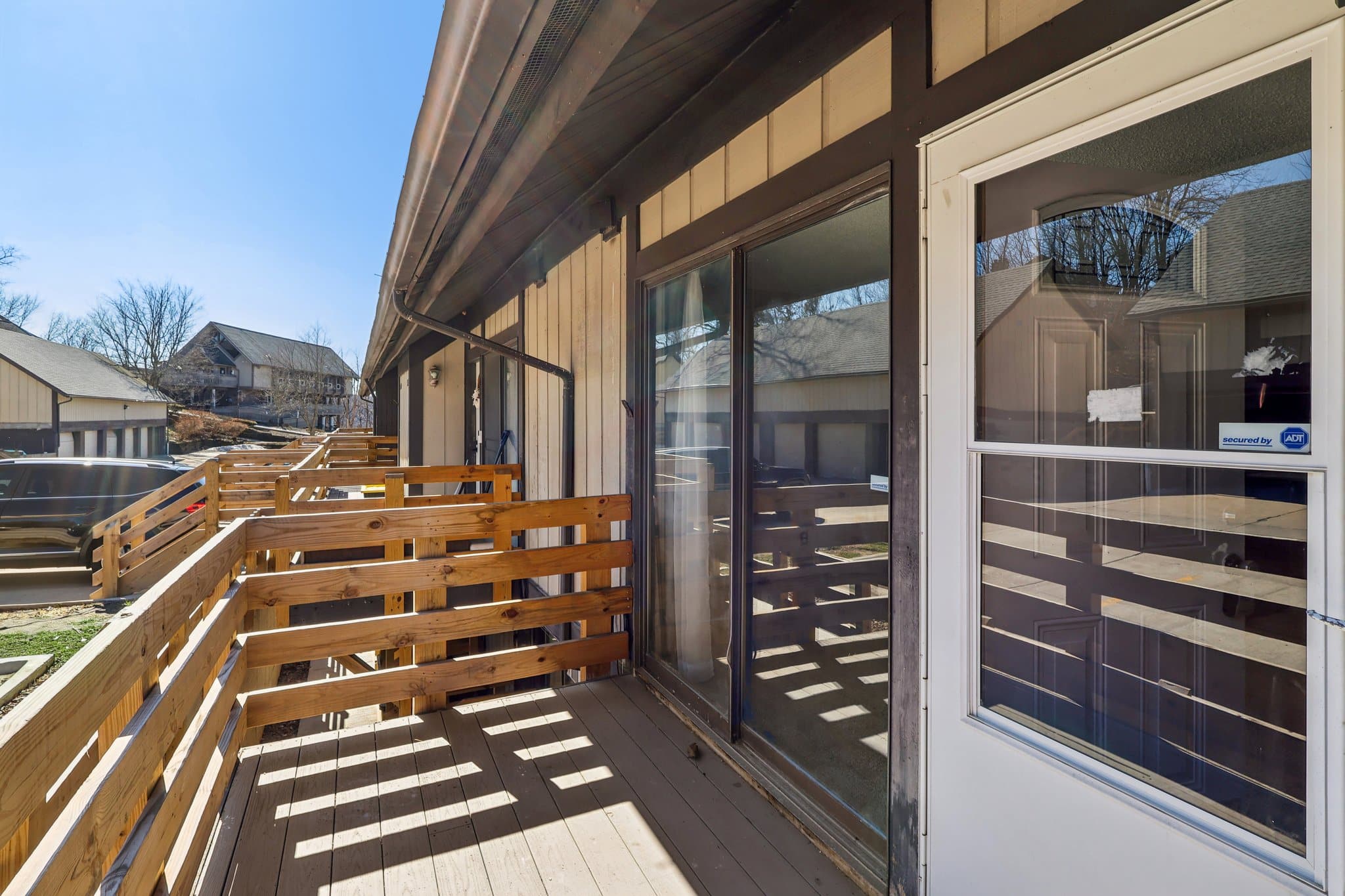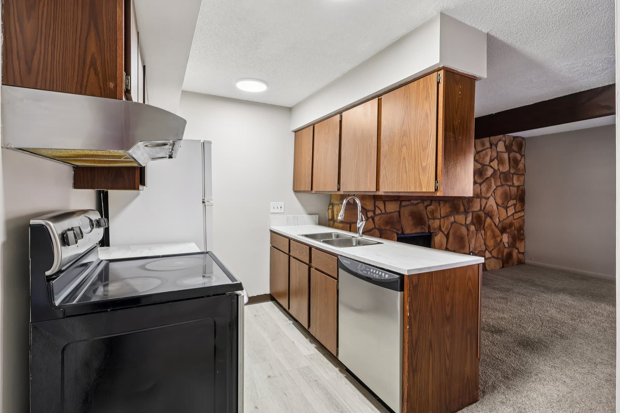 The galley kitchen comes fully equipped with all appliances and overlooks the cozy family room, where a stone fireplace creates a warm focal point. Sliding doors lead to your private balcony deck, ideal for morning coffee or relaxing evenings.