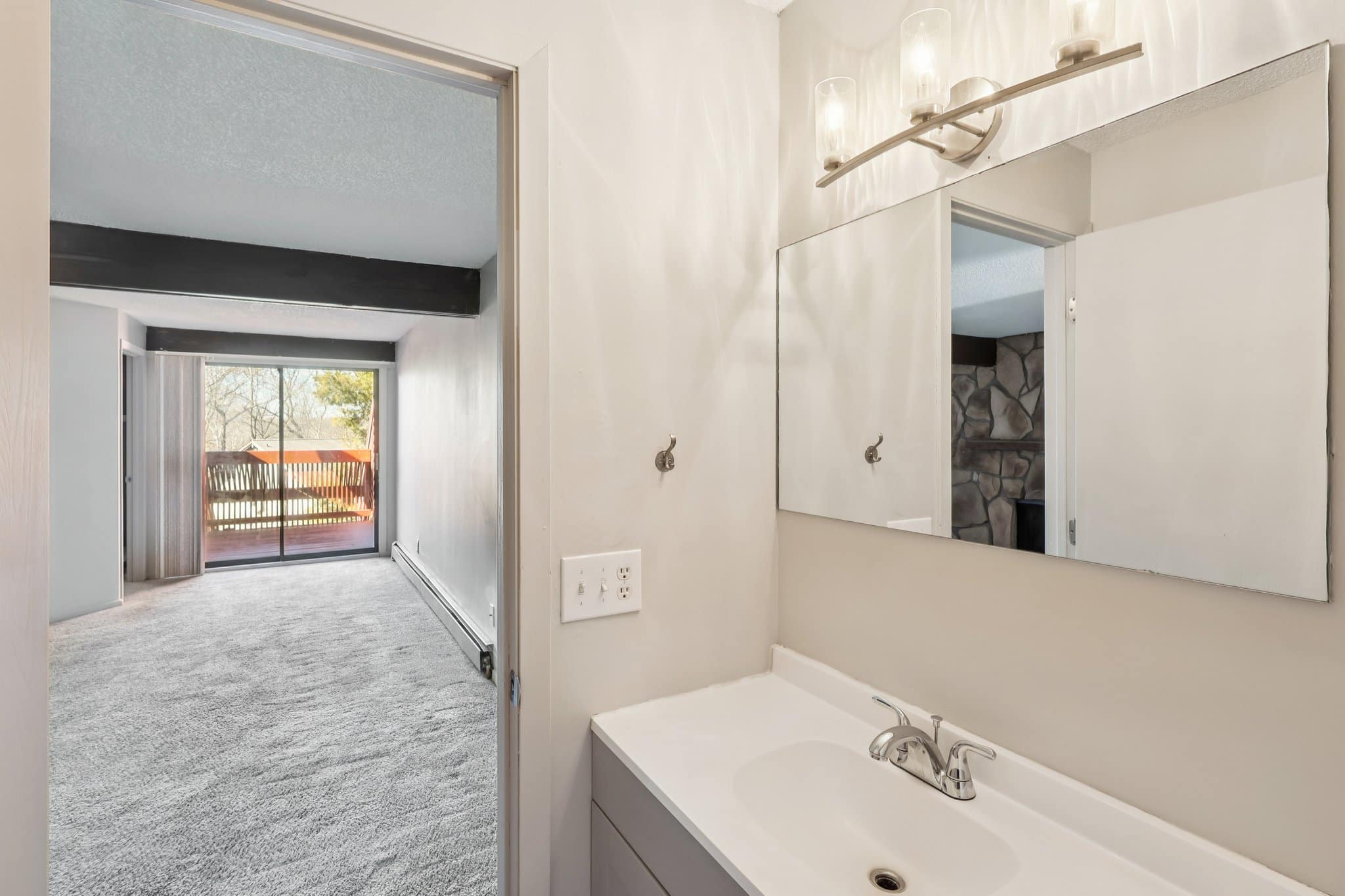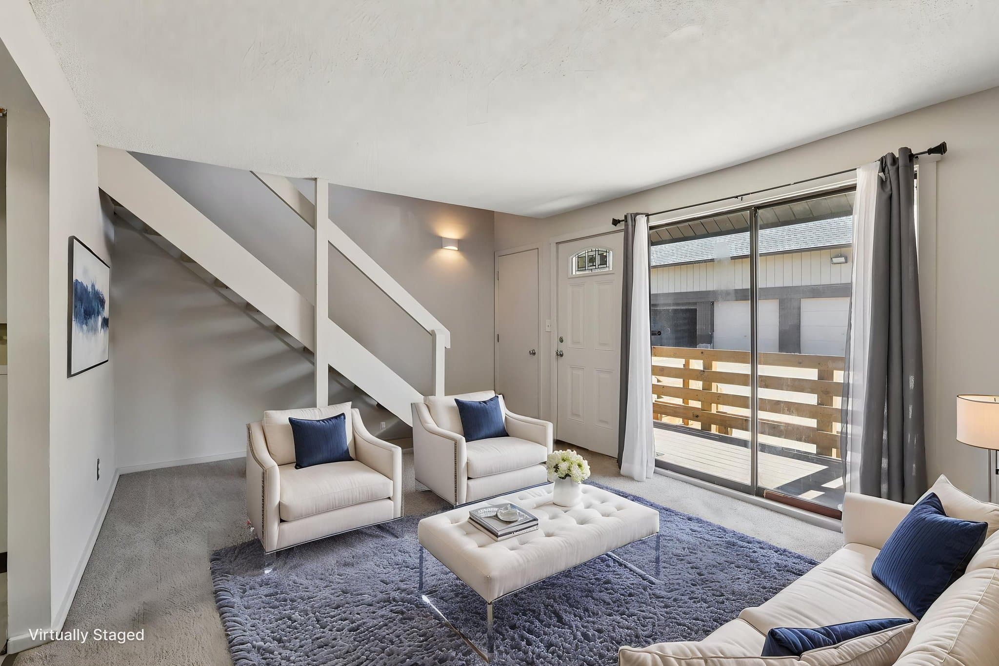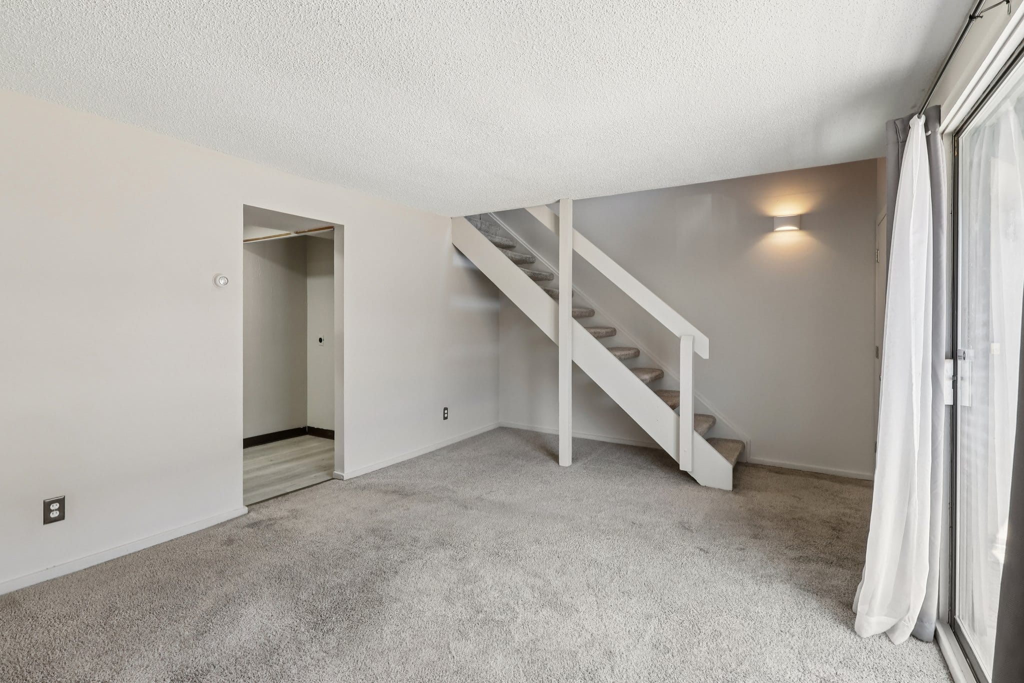 Natural light fills the inviting living room, highlighted by a large sliding door.