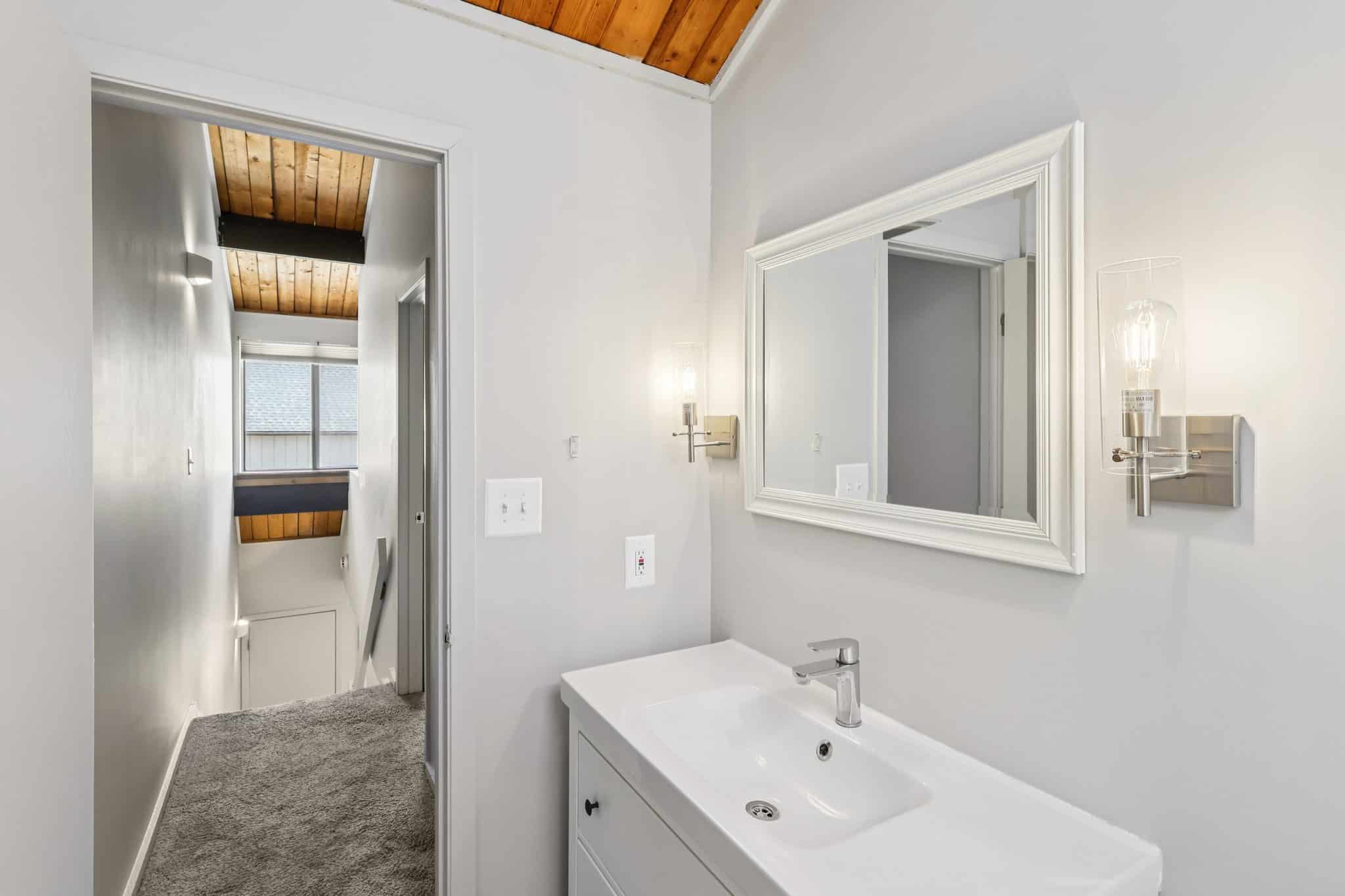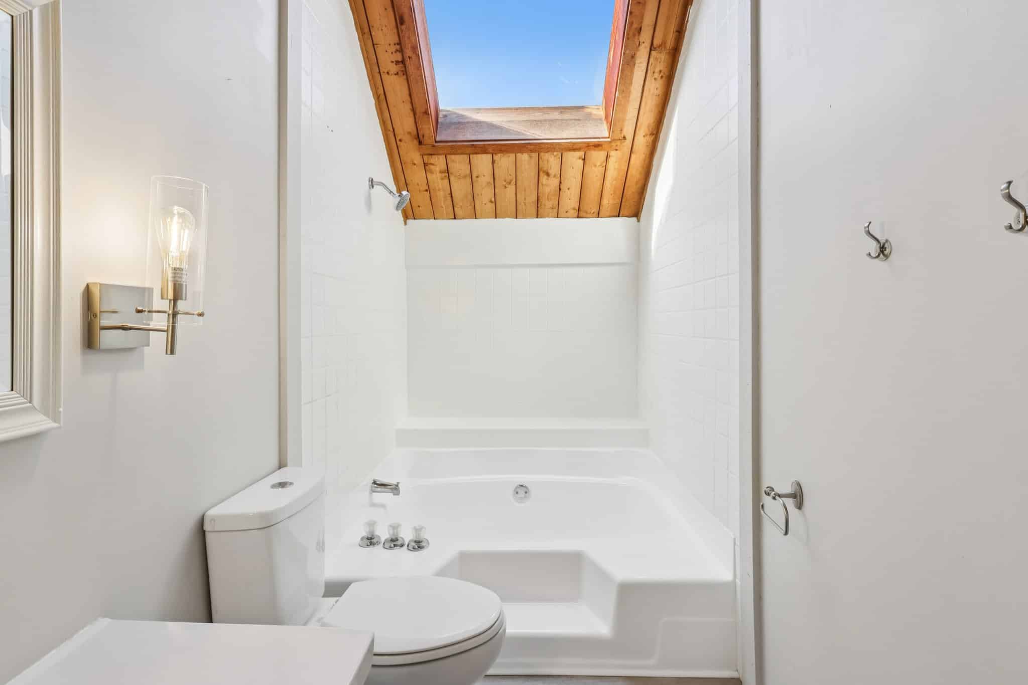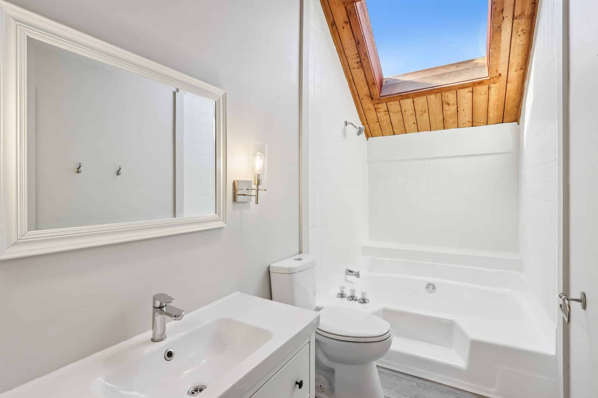 Upstairs, you’ll find two generously sized bedrooms featuring vaulted ceilings and large closets. The full bathroom includes a large tub, skylight, and newer vanity for a fresh, updated touch.