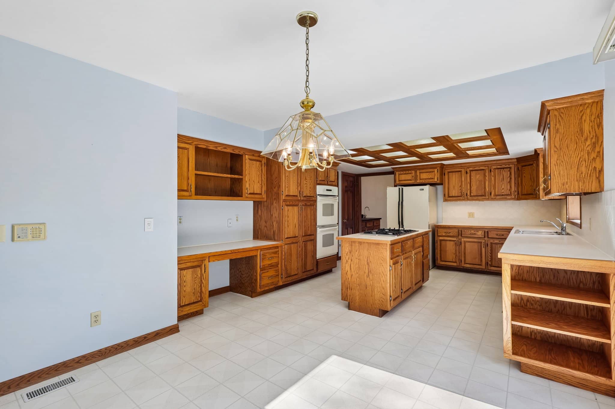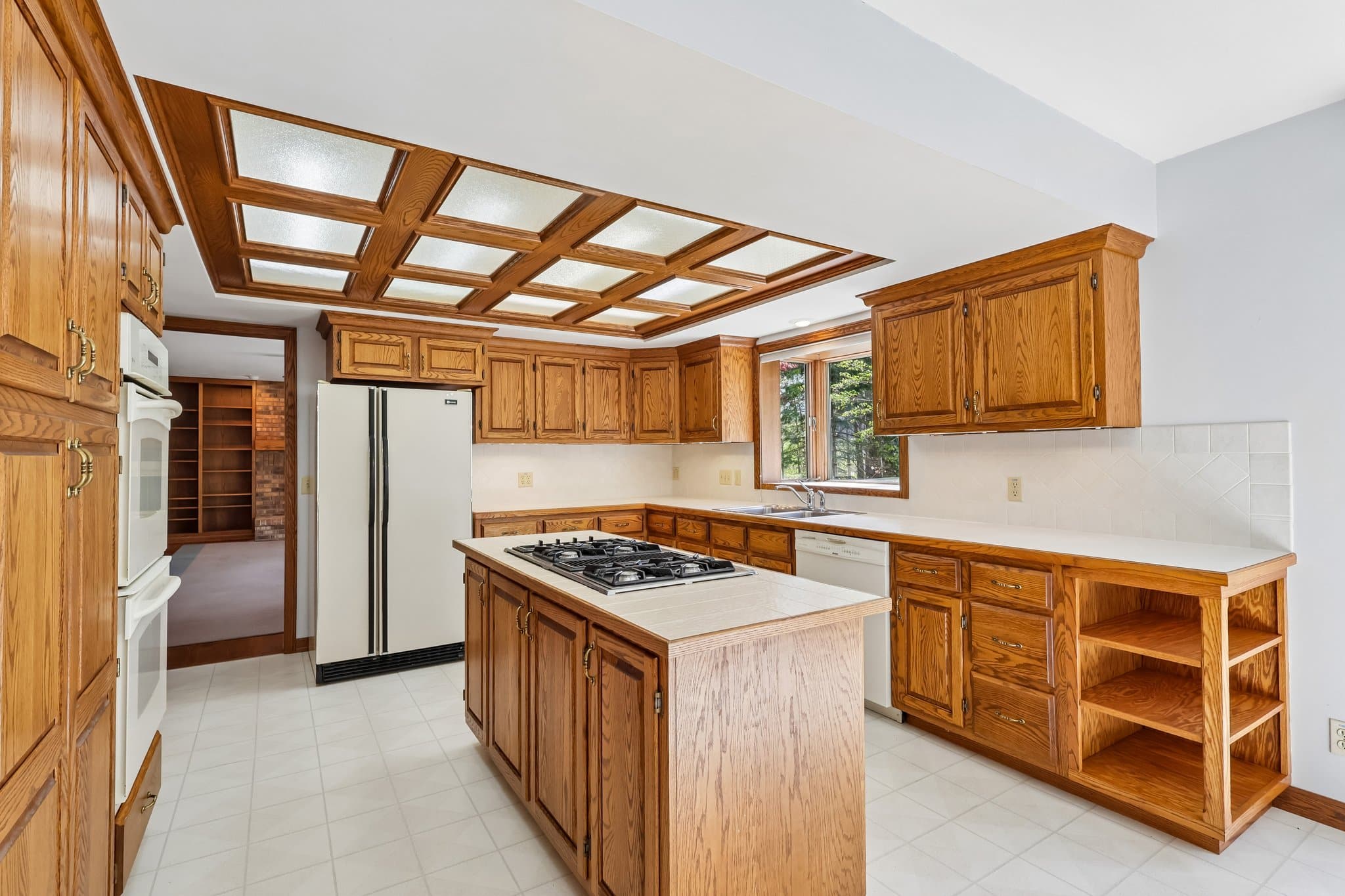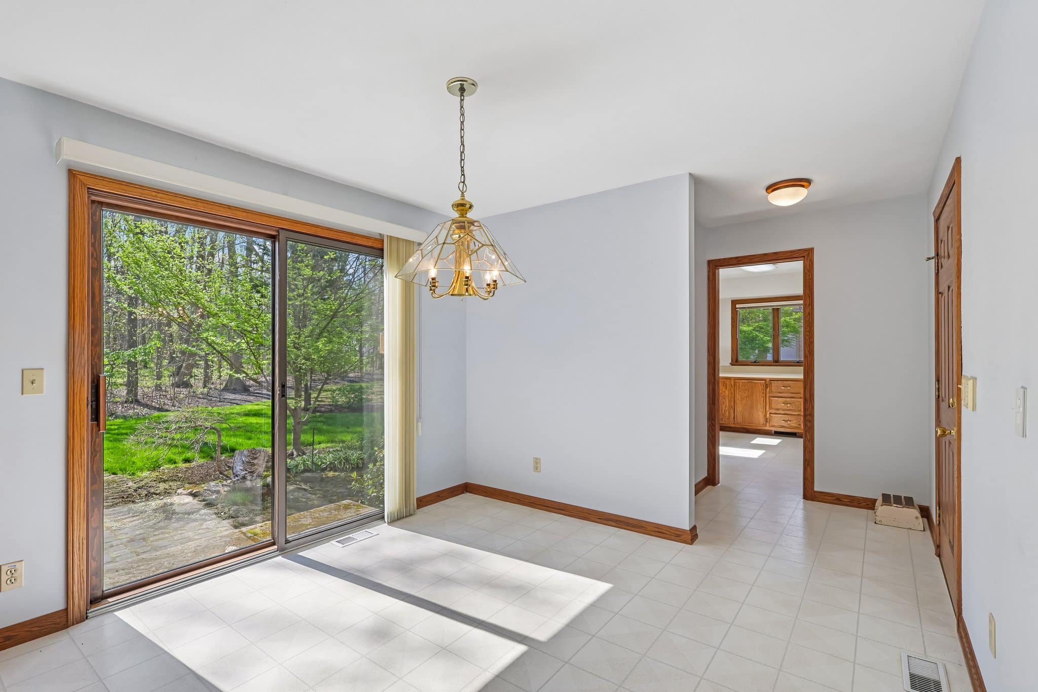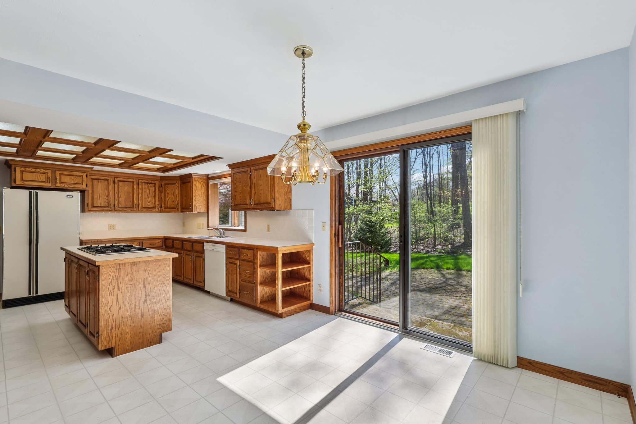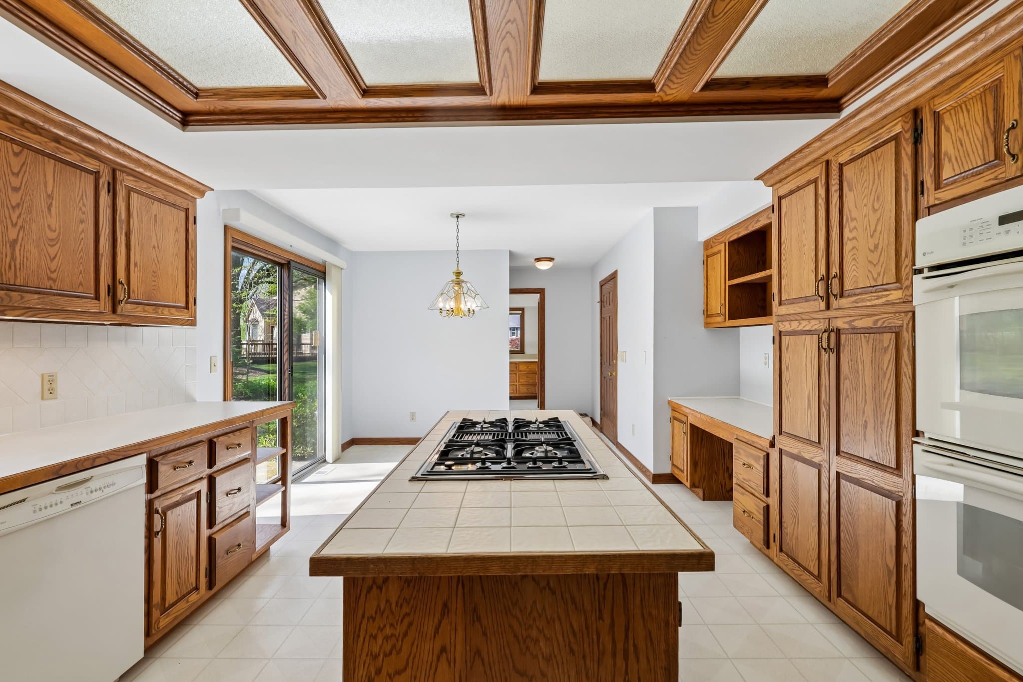 The kitchen is designed for both function and gathering, with extensive cabinetry, a center island, planning station, and an eating area with sliders leading to the brick patio.