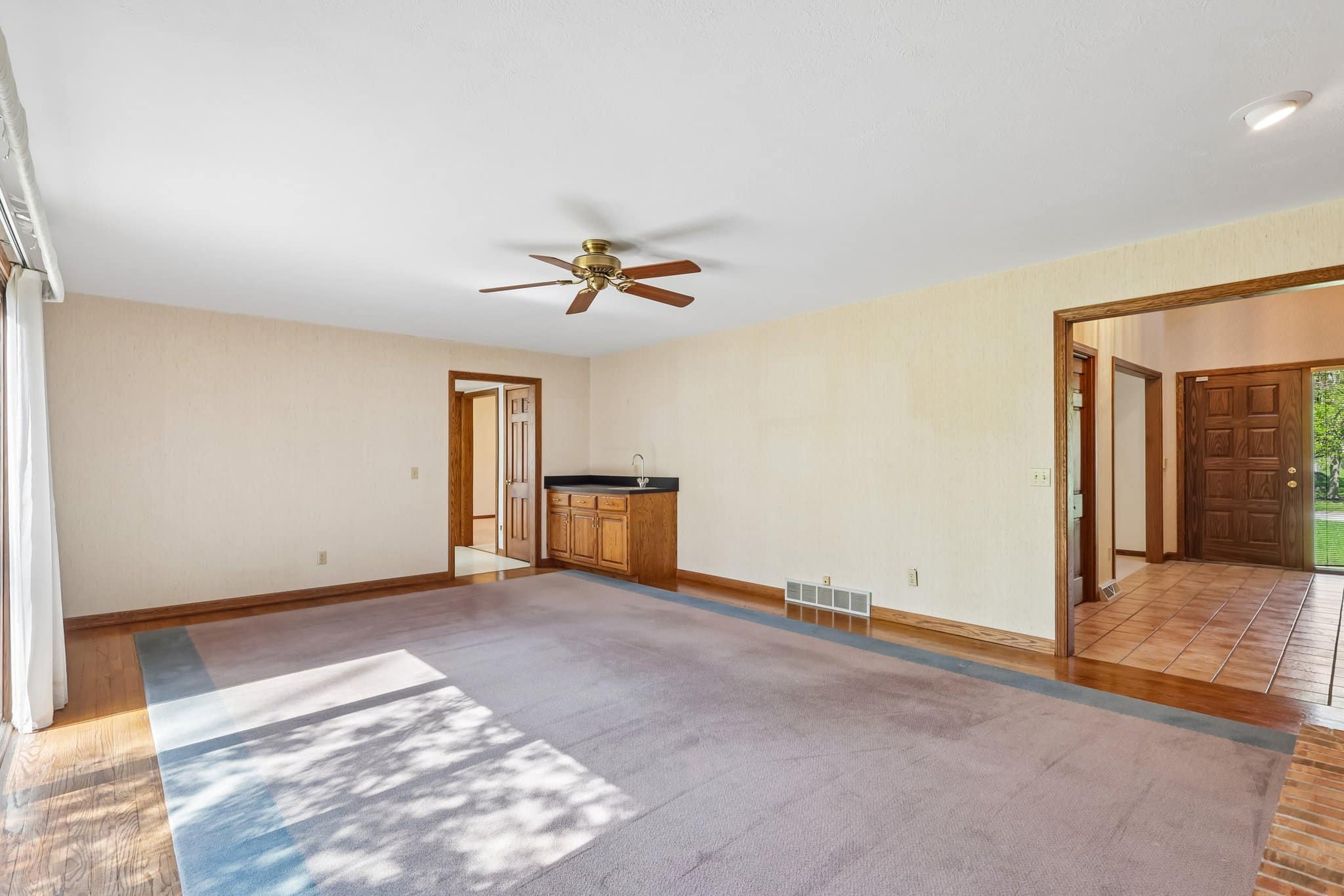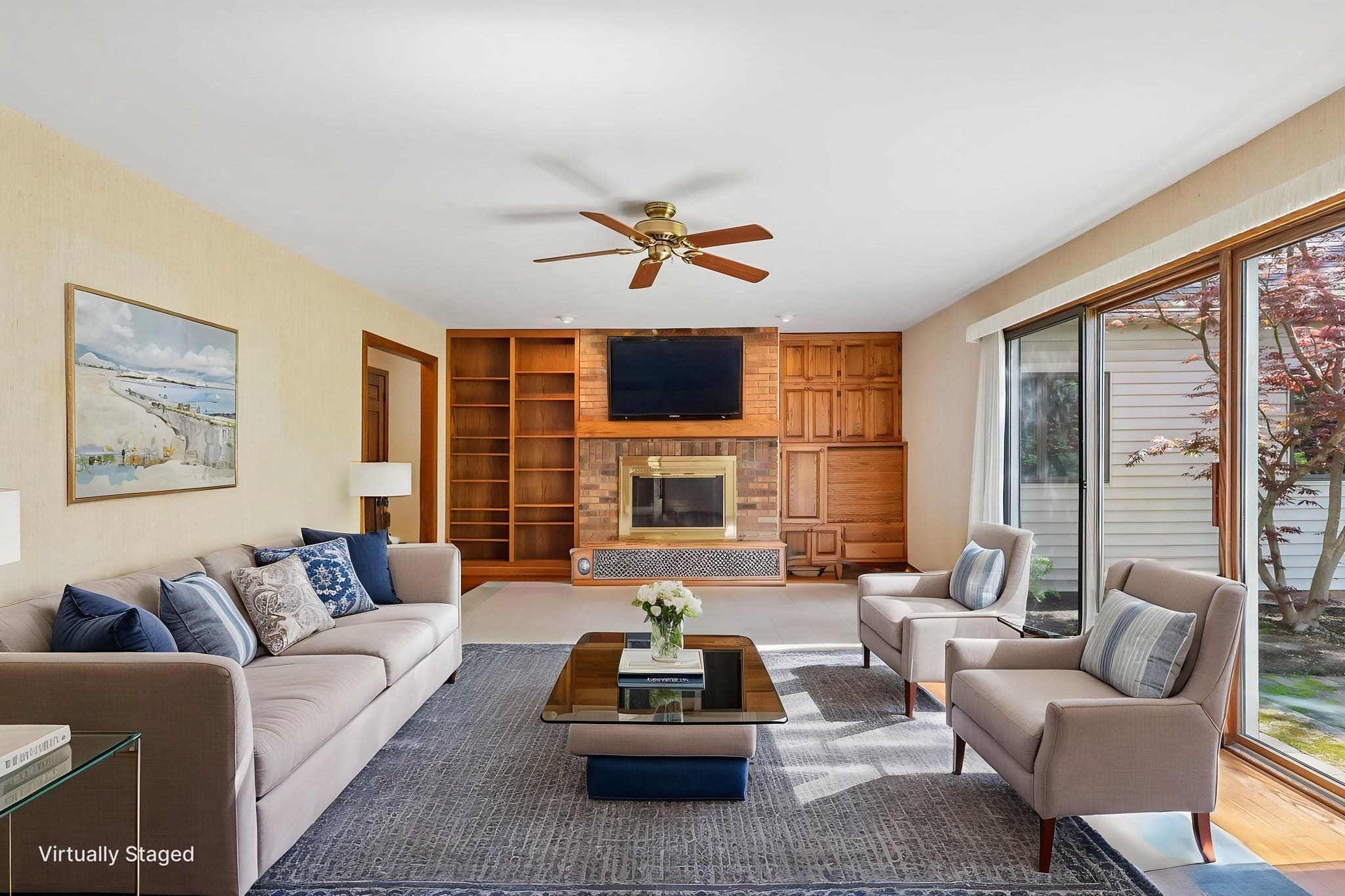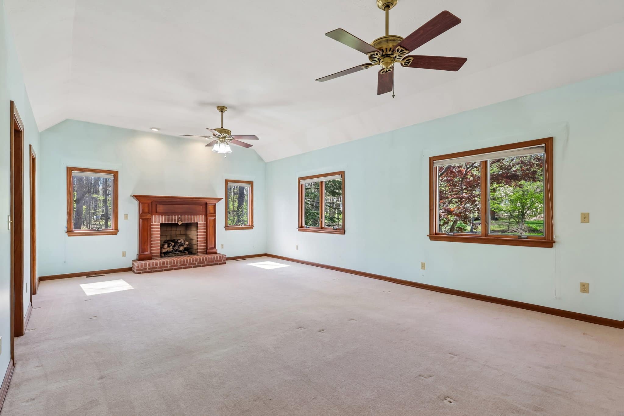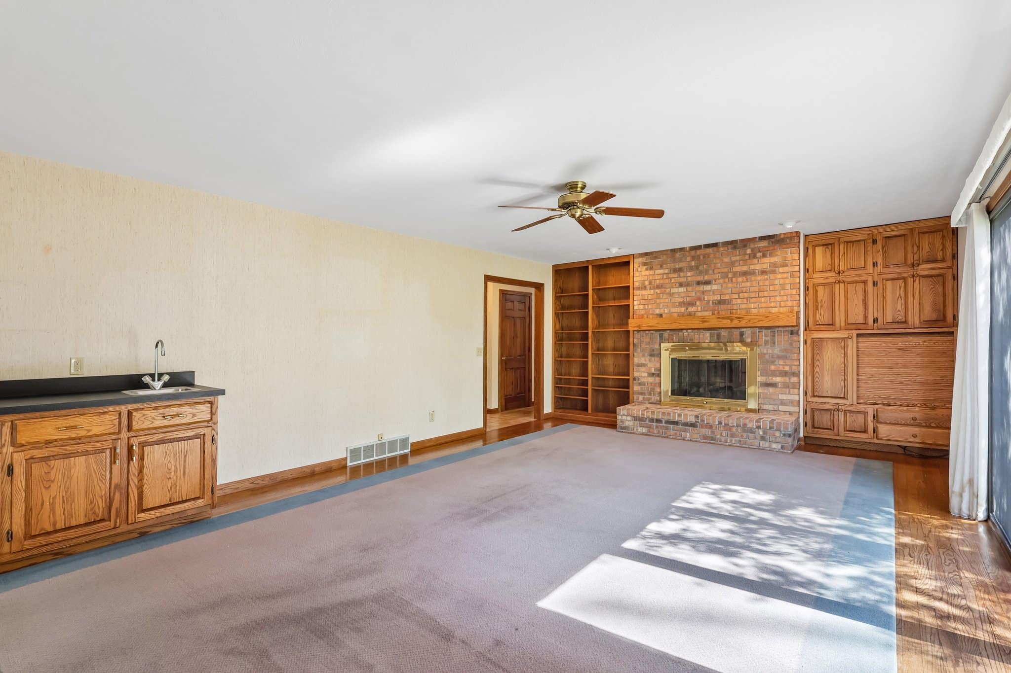 Relax in the inviting family room, showcasing a brick fireplace, flanked by custom built-ins, a wet bar, and additional patio access!