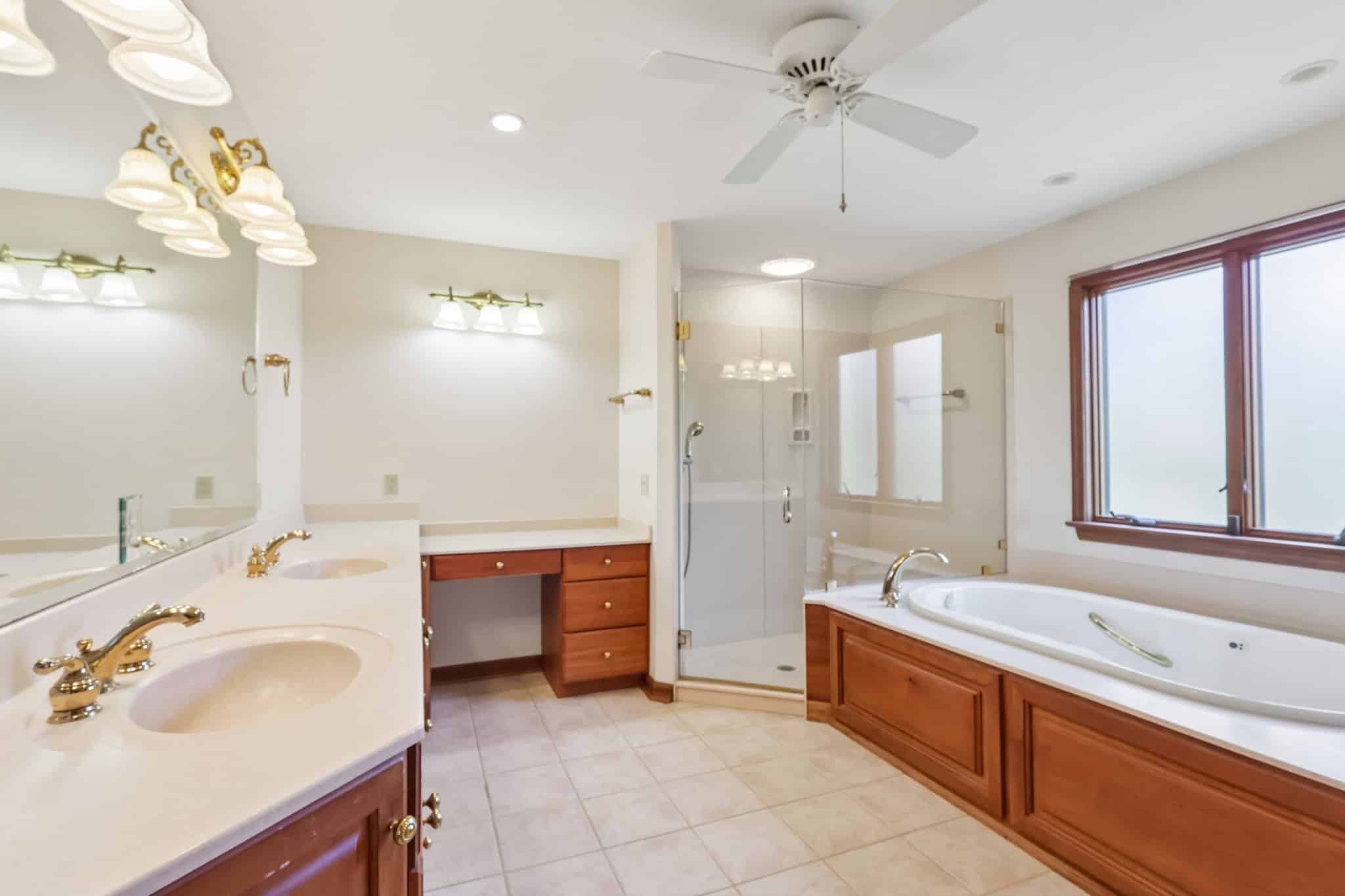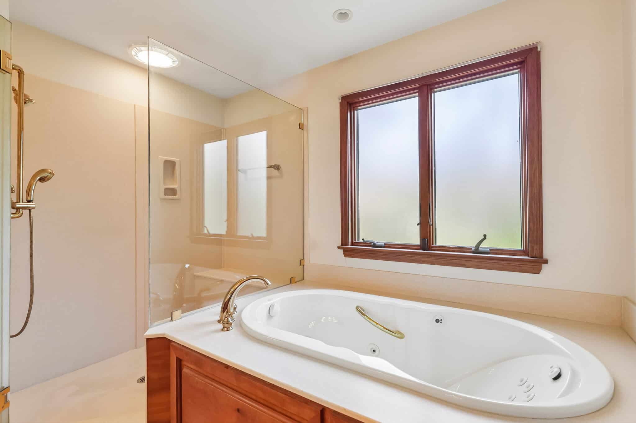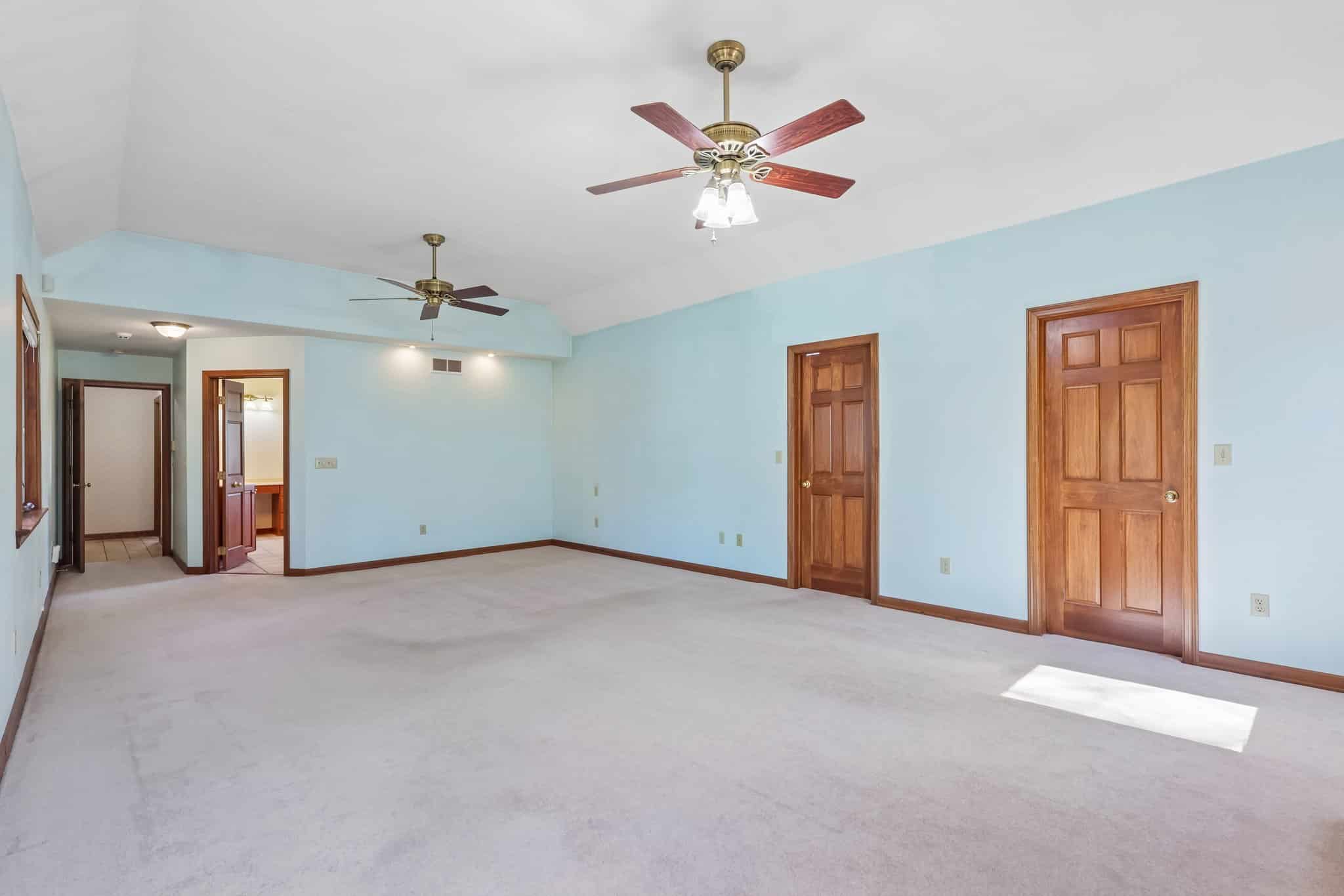 The first-floor primary suite is a true retreat with sweeping ceilings, two walk-in closets, and an ensuite bath featuring a jetted tub, double sinks, and a large shower.