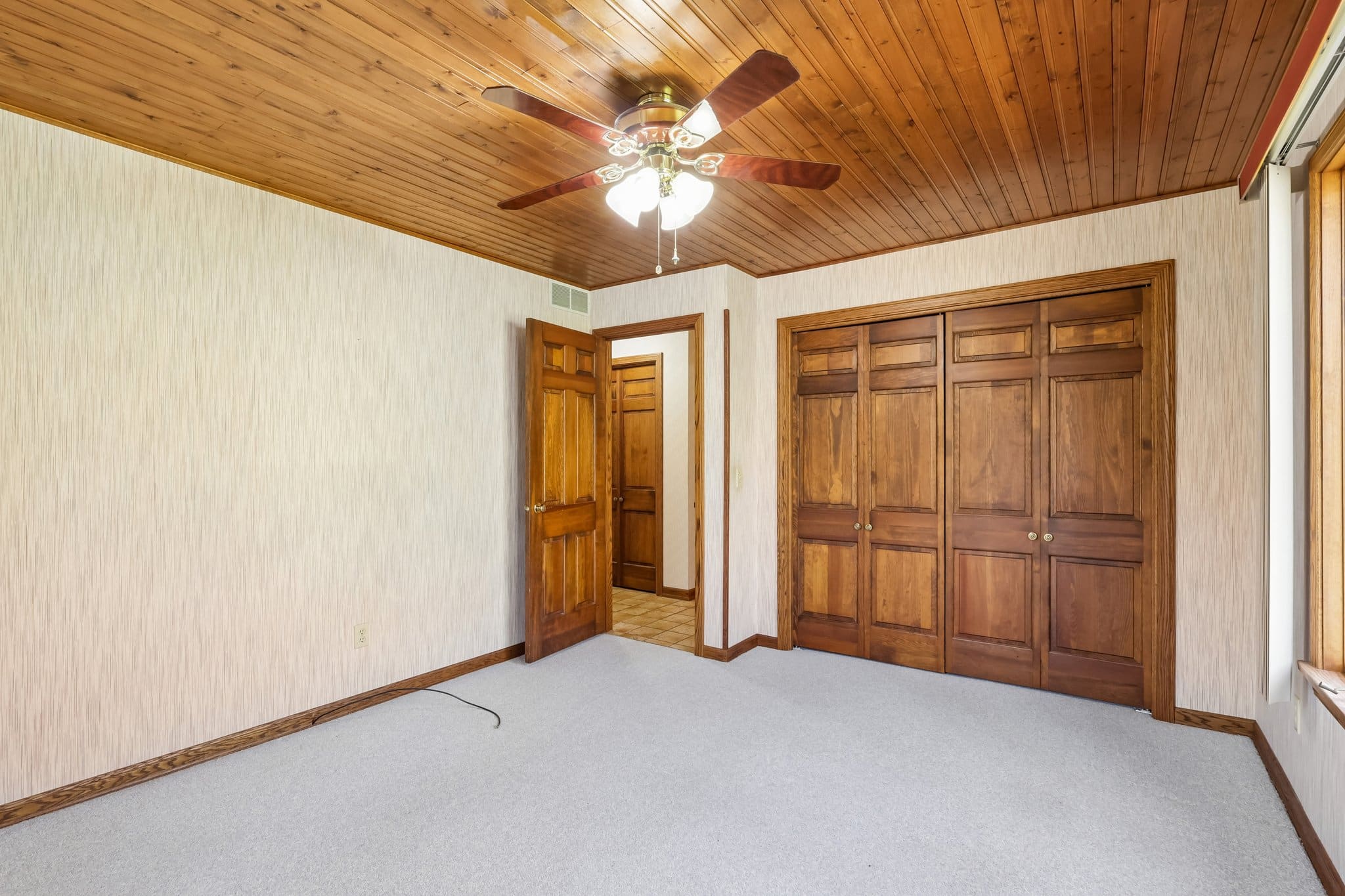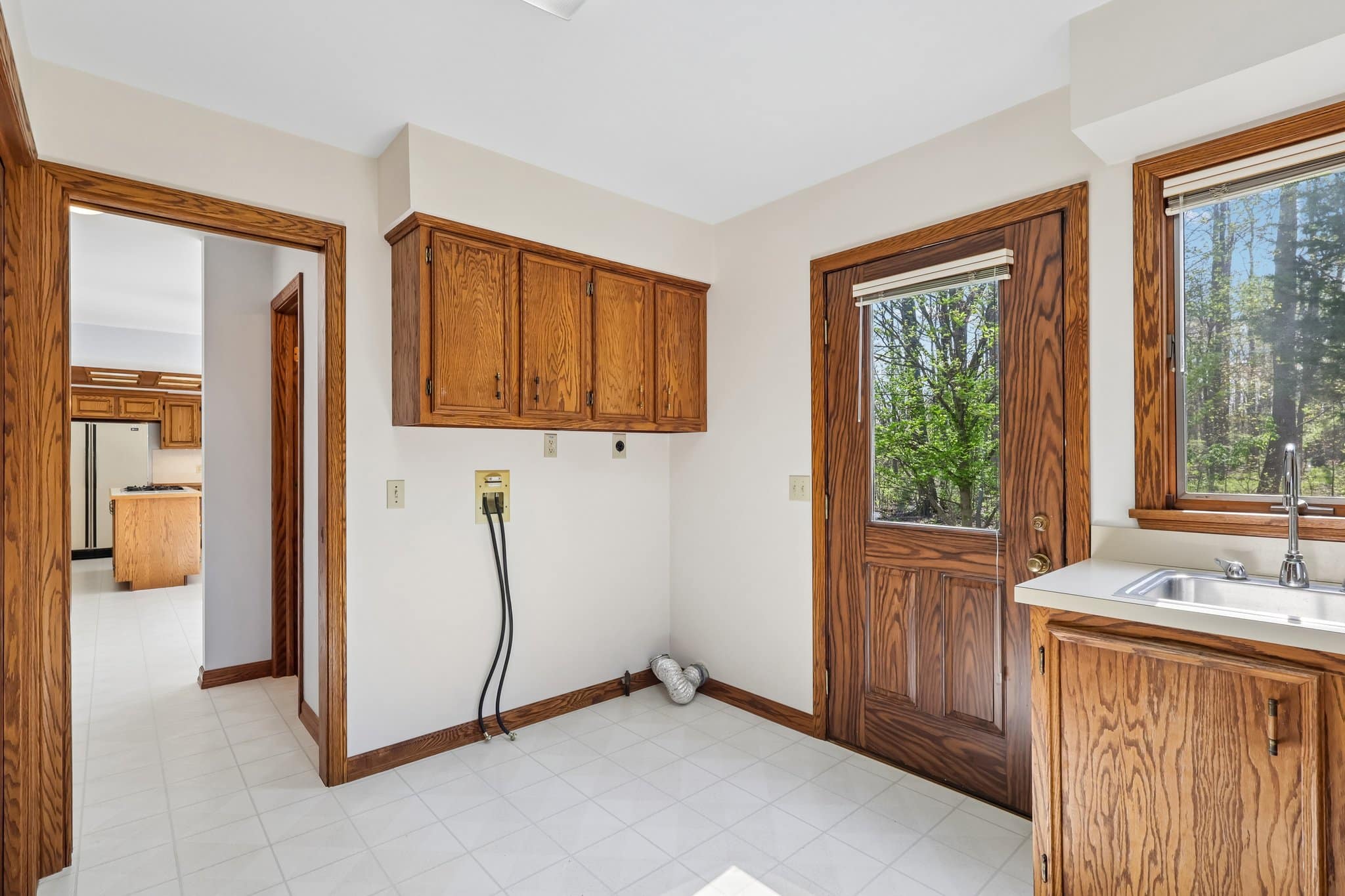A second bedroom with a stunning wood ceiling, a generous laundry room with built-ins and outdoor access, and a half bath complete the main level.