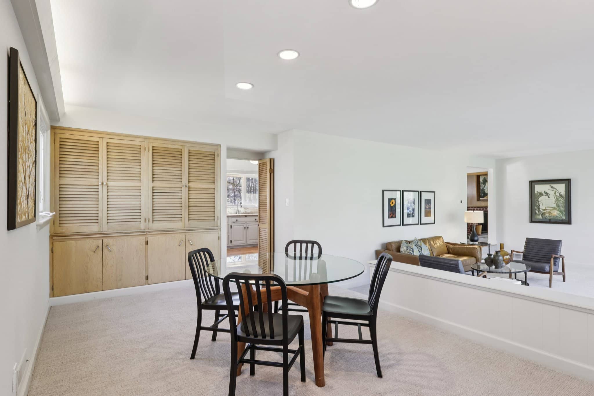 A welcoming entry leads to the dramatic sunken living room, where a striking wall of glass fills the space with natural light. The formal dining room sits just off the living area, creating an ideal flow for gatherings. The kitchen features granite countertops, stainless steel appliances, extensive cabinetry, and a breakfast nook with additional storage and counterspace.