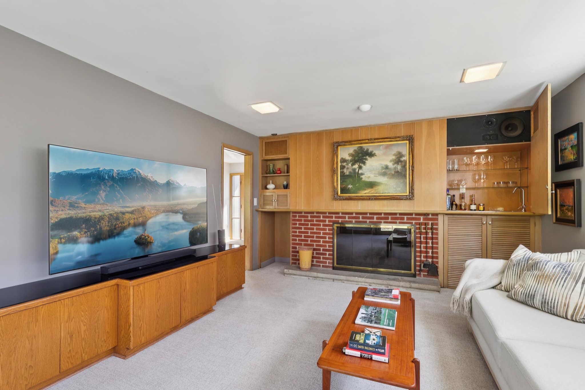 The handsome den offers a fireplace, custom built-ins, a wet bar, and direct patio access—perfect for relaxing or entertaining. A spacious laundry room and guest bath complete the main level.