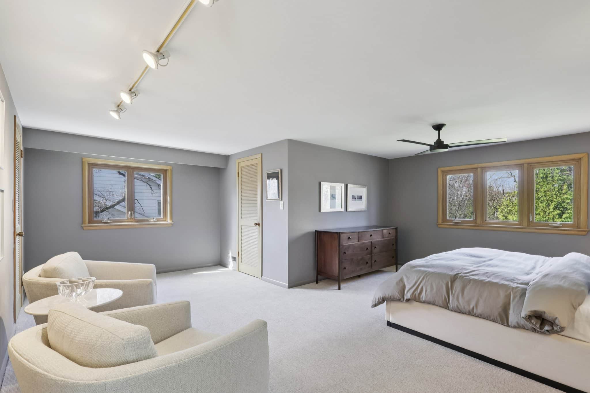 Upstairs, the serene primary suite includes four closets and a fully renovated, ensuite bath with a walk-in shower. Two additional, generous-sized bedrooms and an updated full bath provide comfortable accommodations.