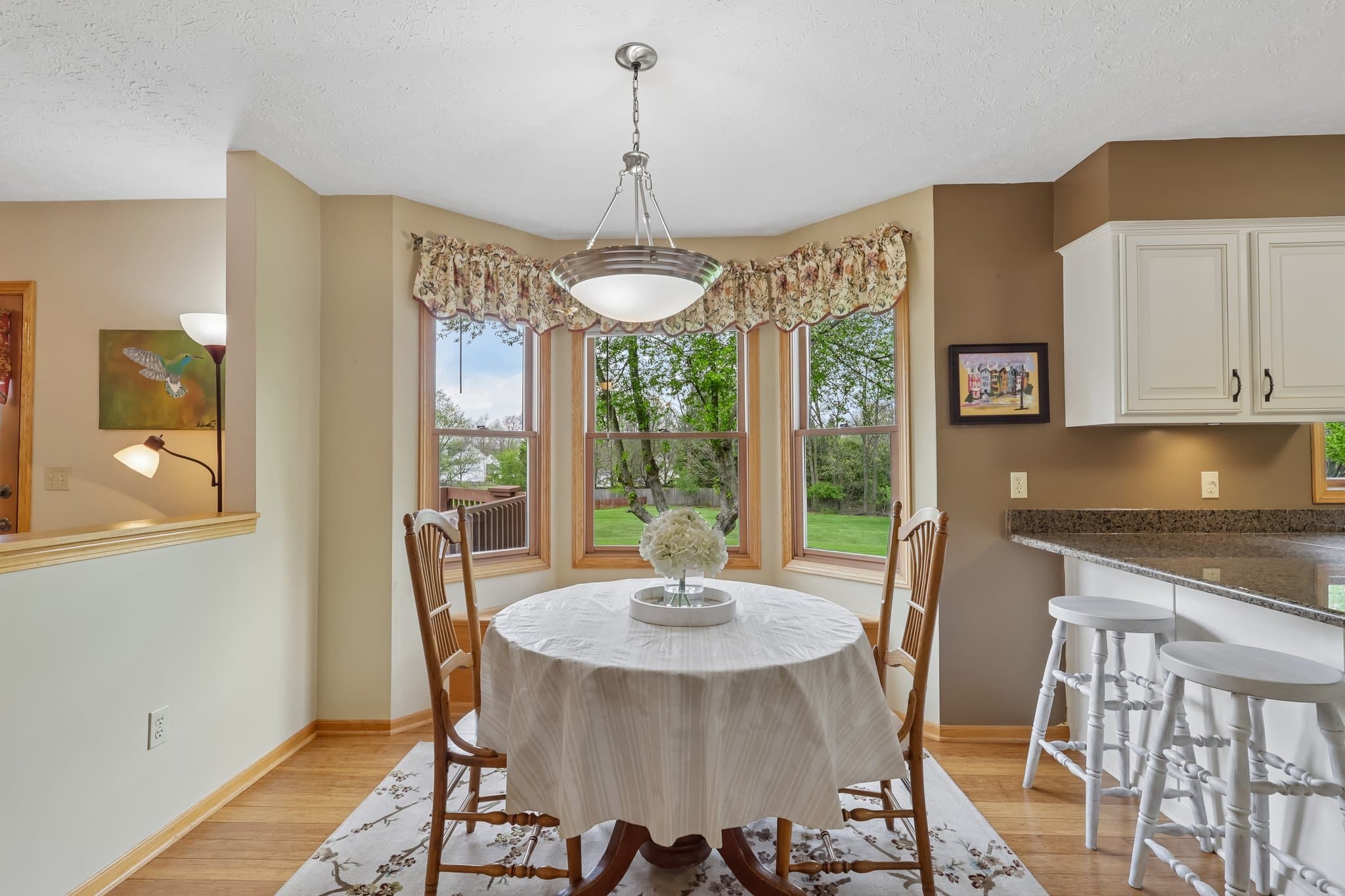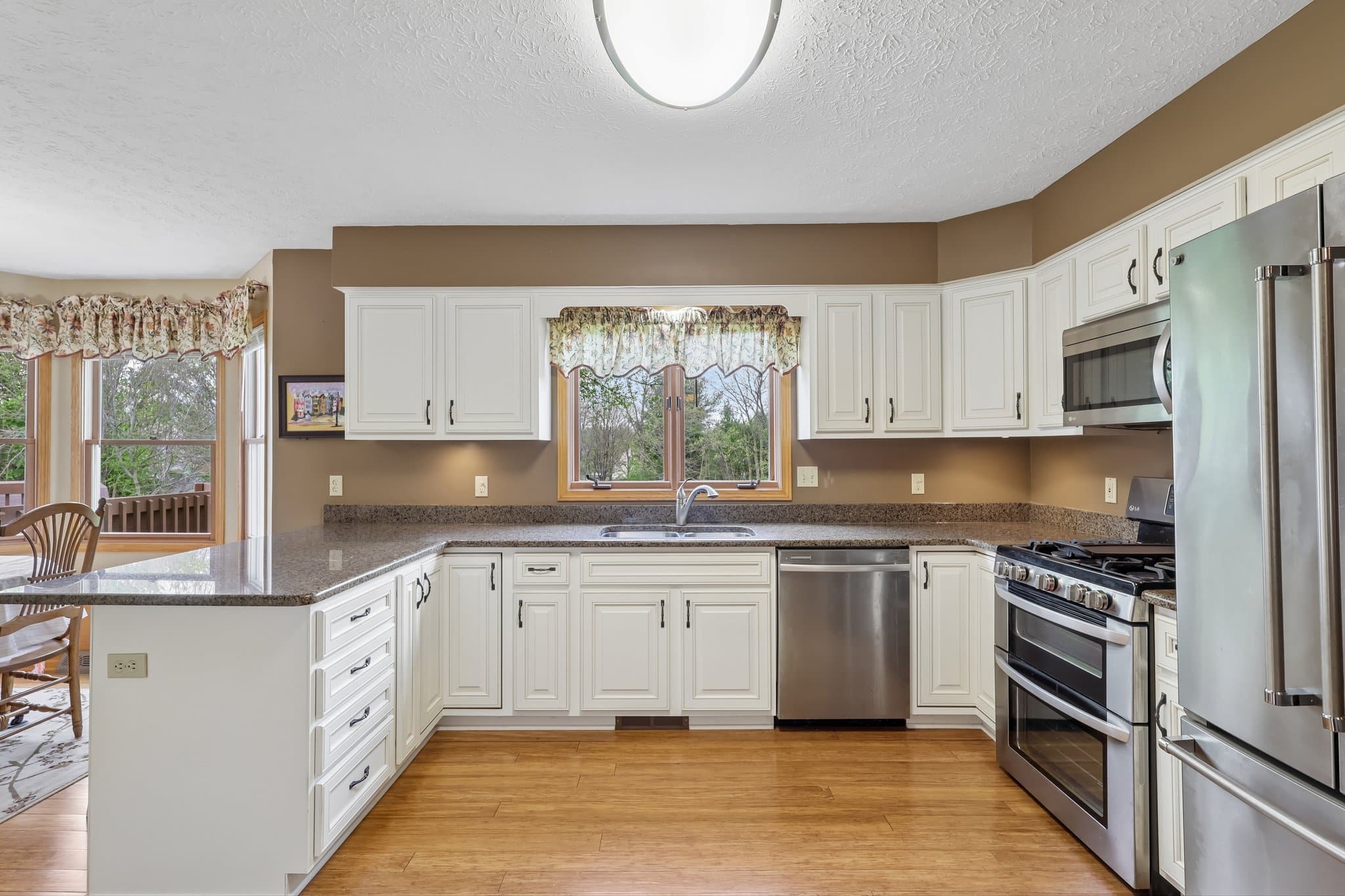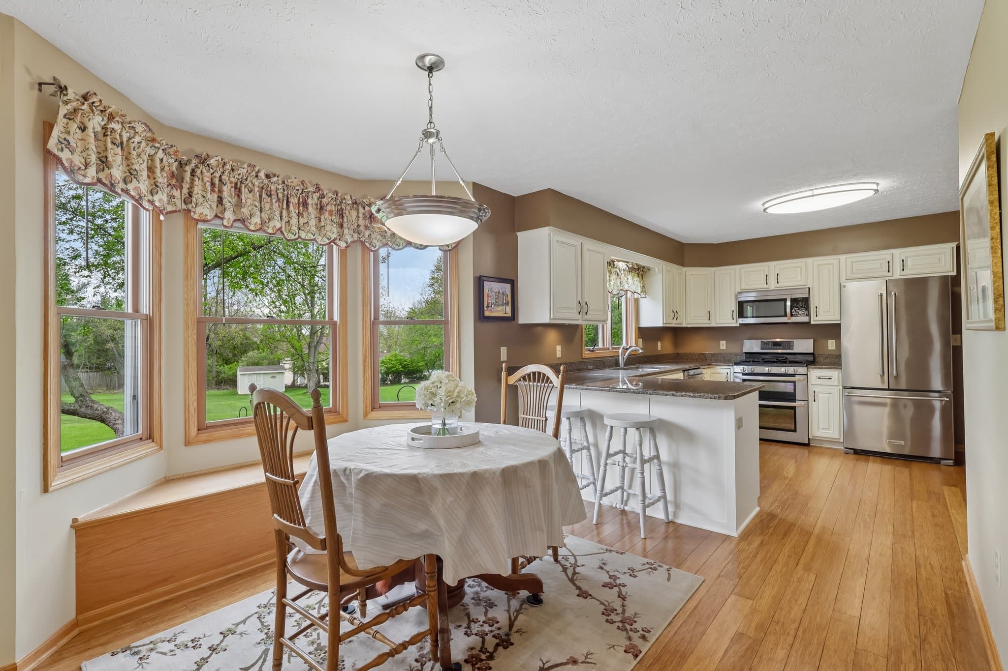 The kitchen is designed for both function and gathering, with extensive cabinetry, granite countertops, stainless steel appliances, and an eating area with a bayed window with built-in seating.