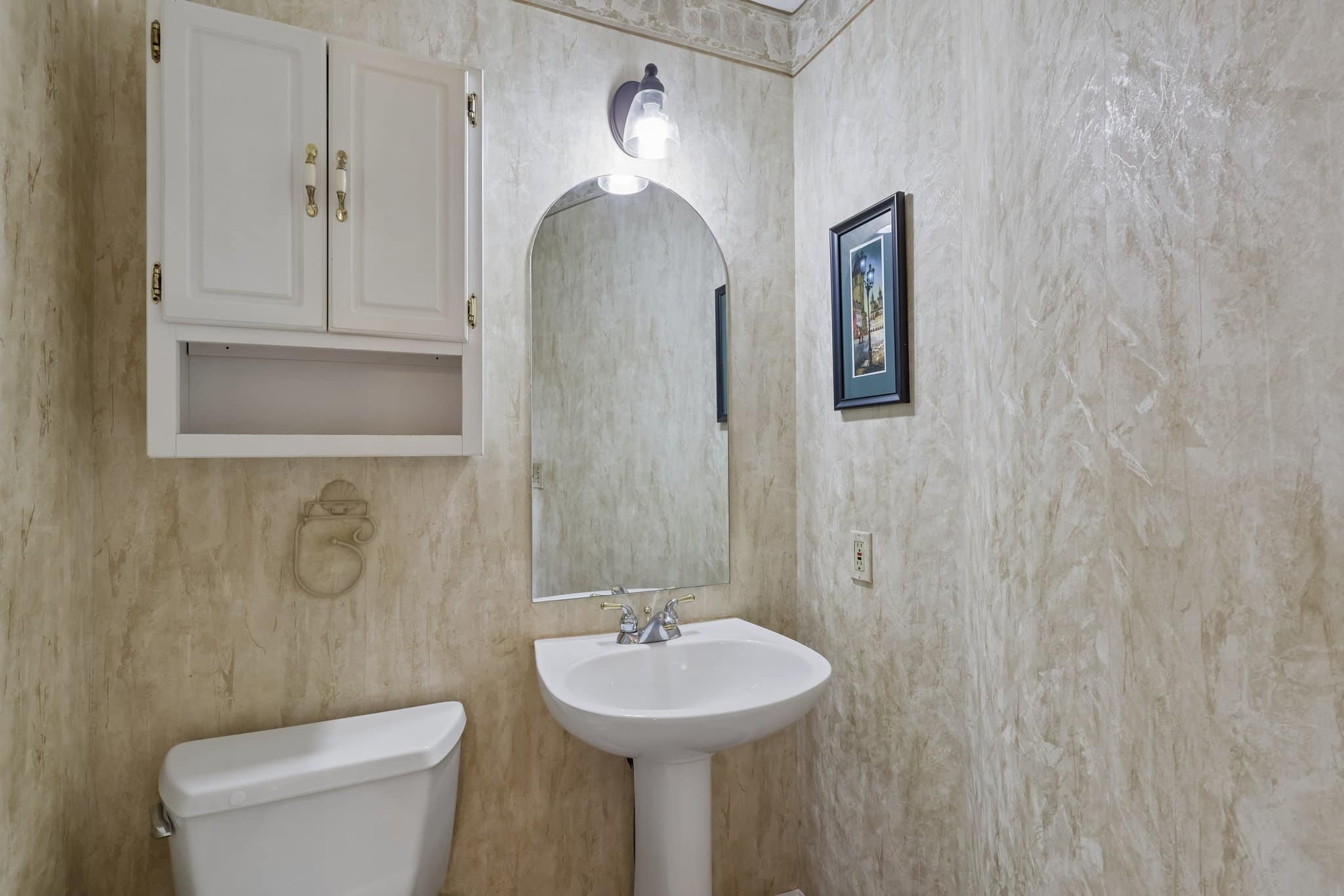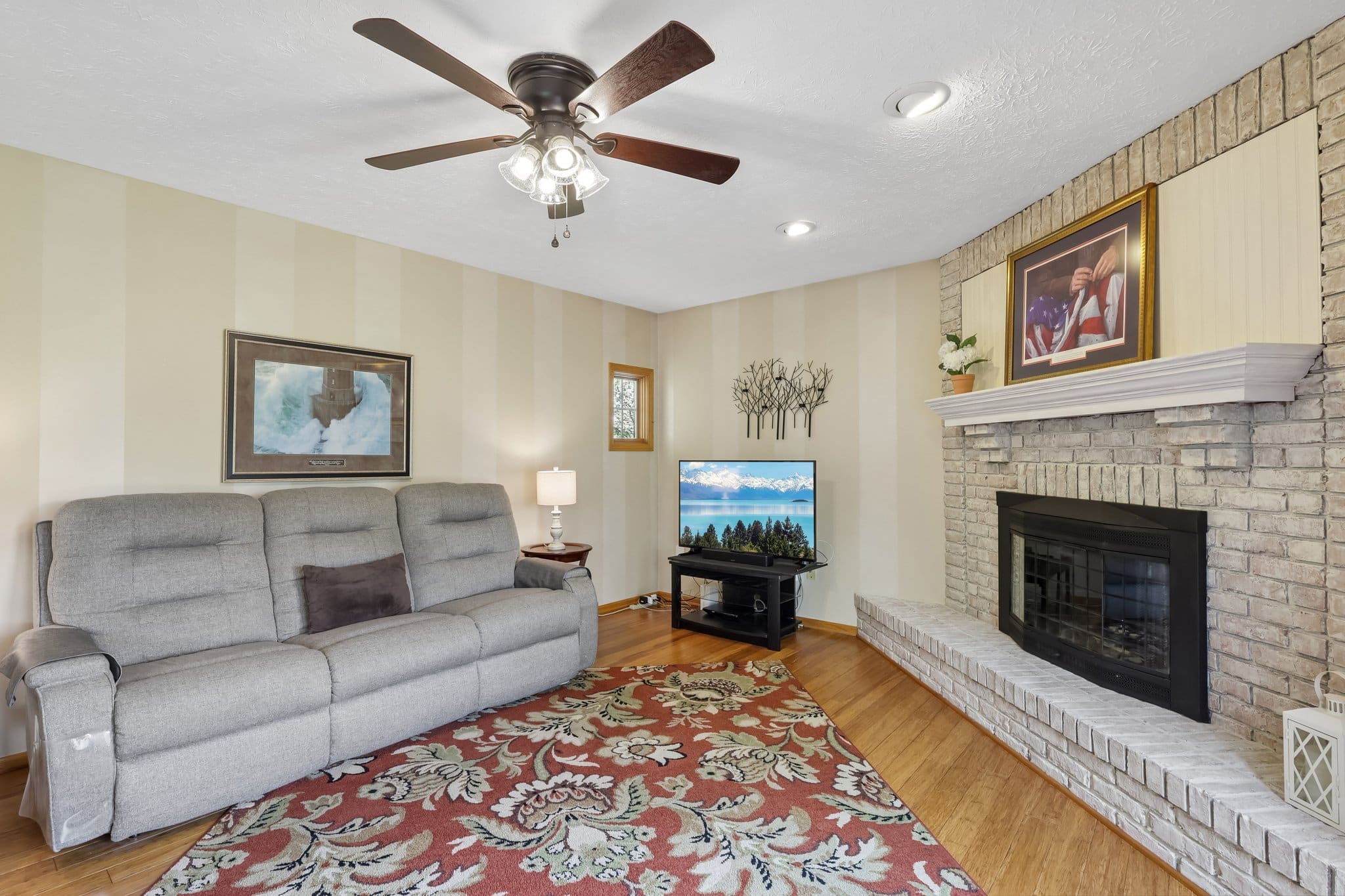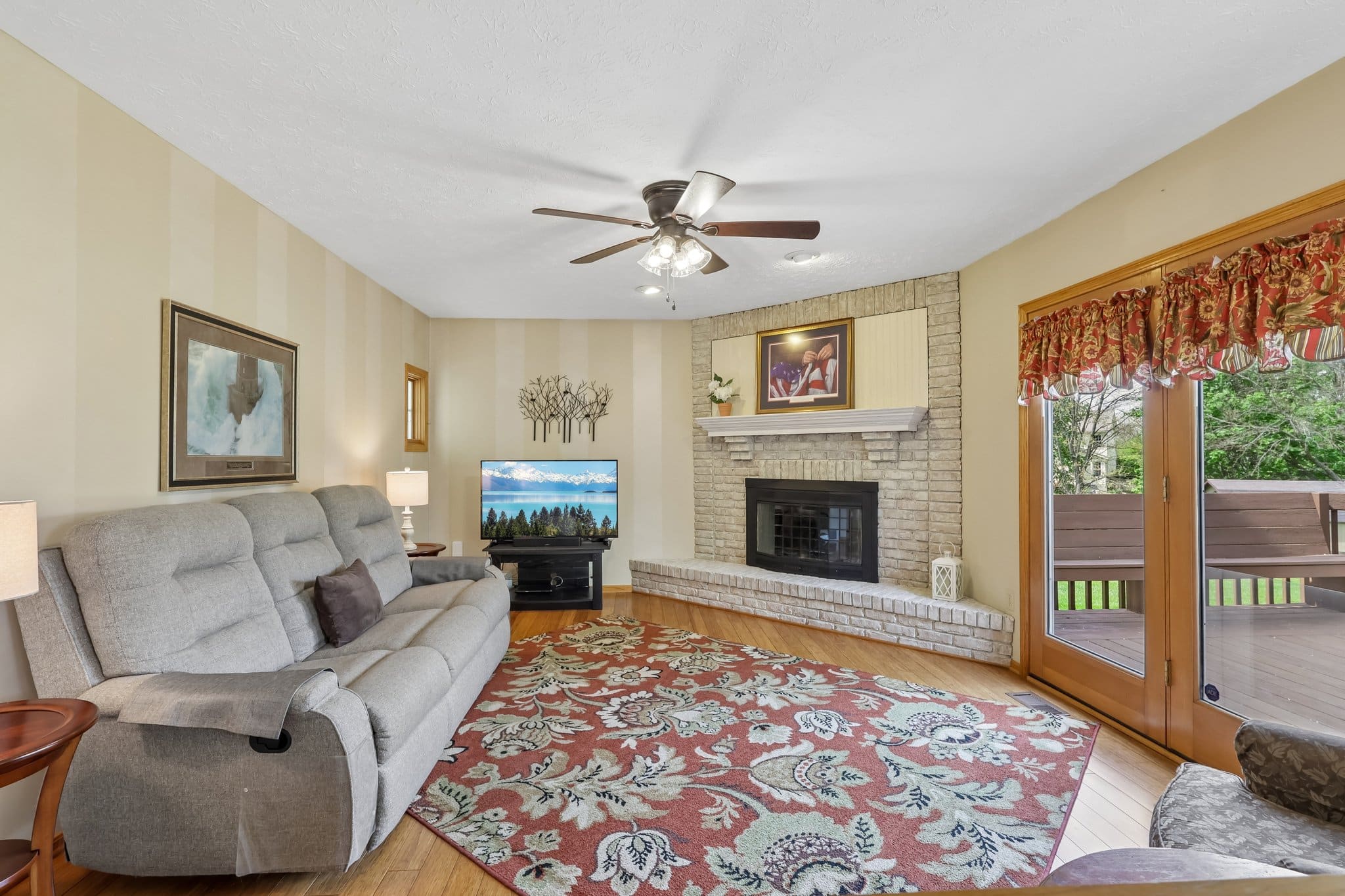 Relax in the inviting family room, showcasing a brick fireplace, hardwood flooring, a ceiling fan, and deck access! There is a half bath located nearby.