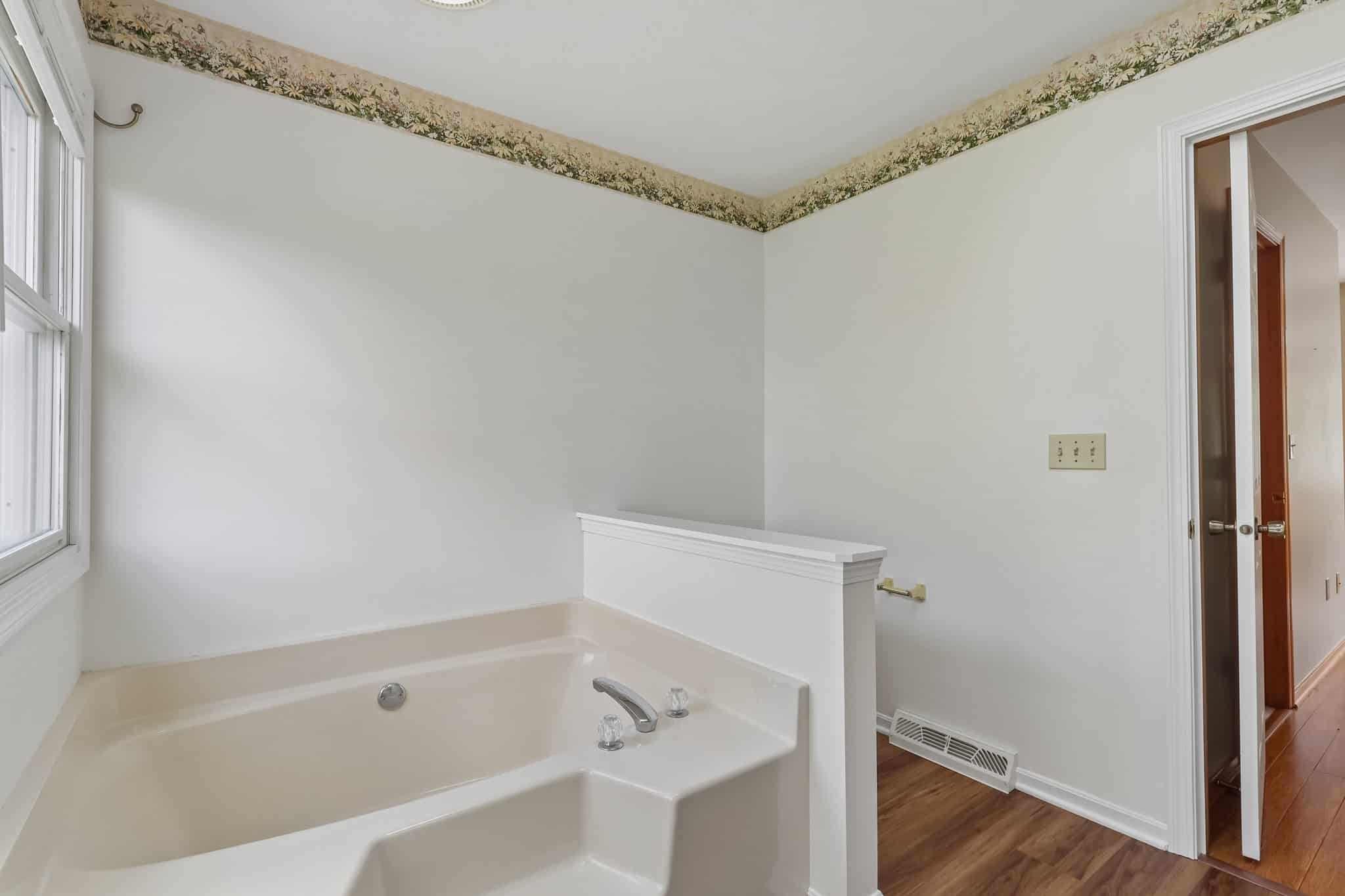 Retreat to the primary suite, which features a bayed window, landing access, and an ensuite bath with double sinks and a large soaking tub.