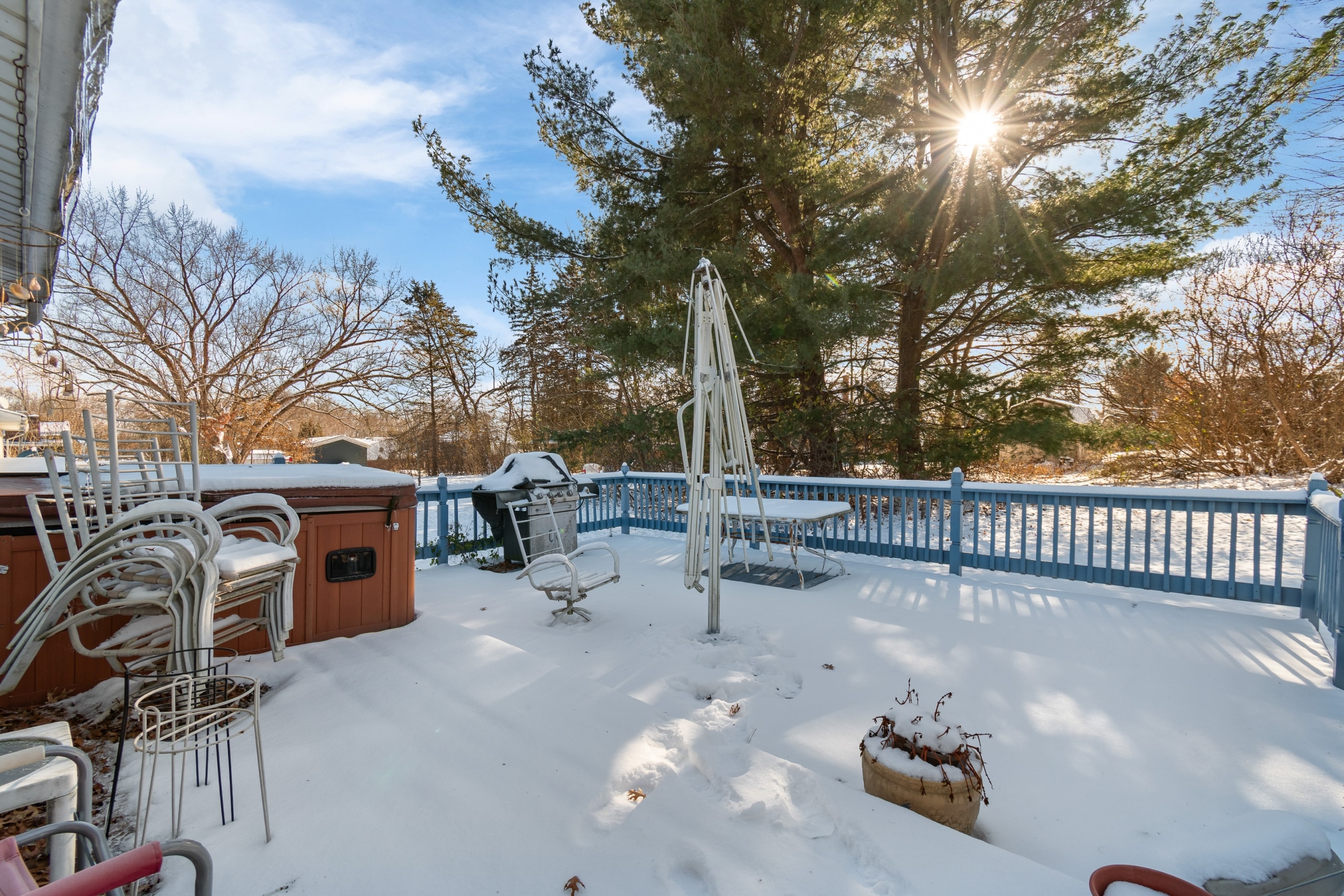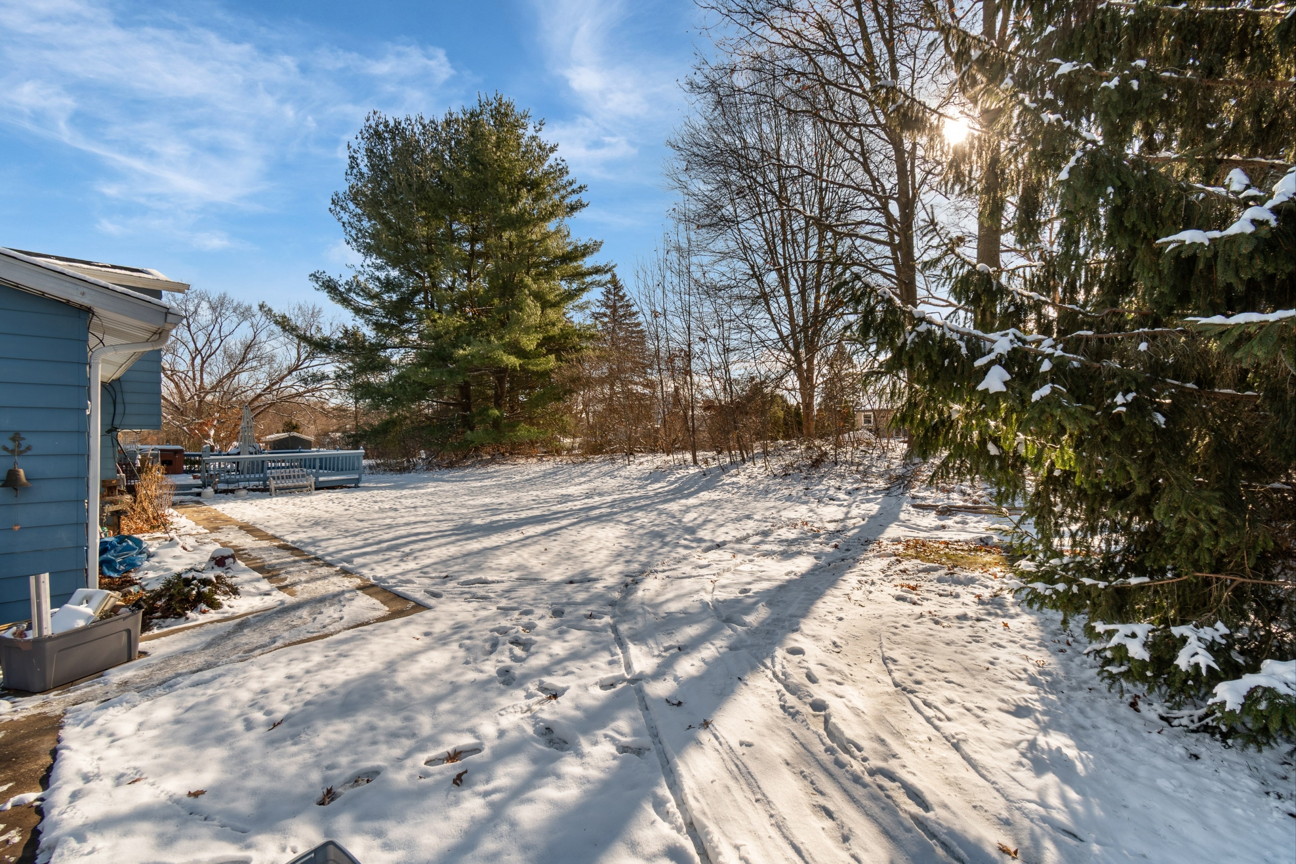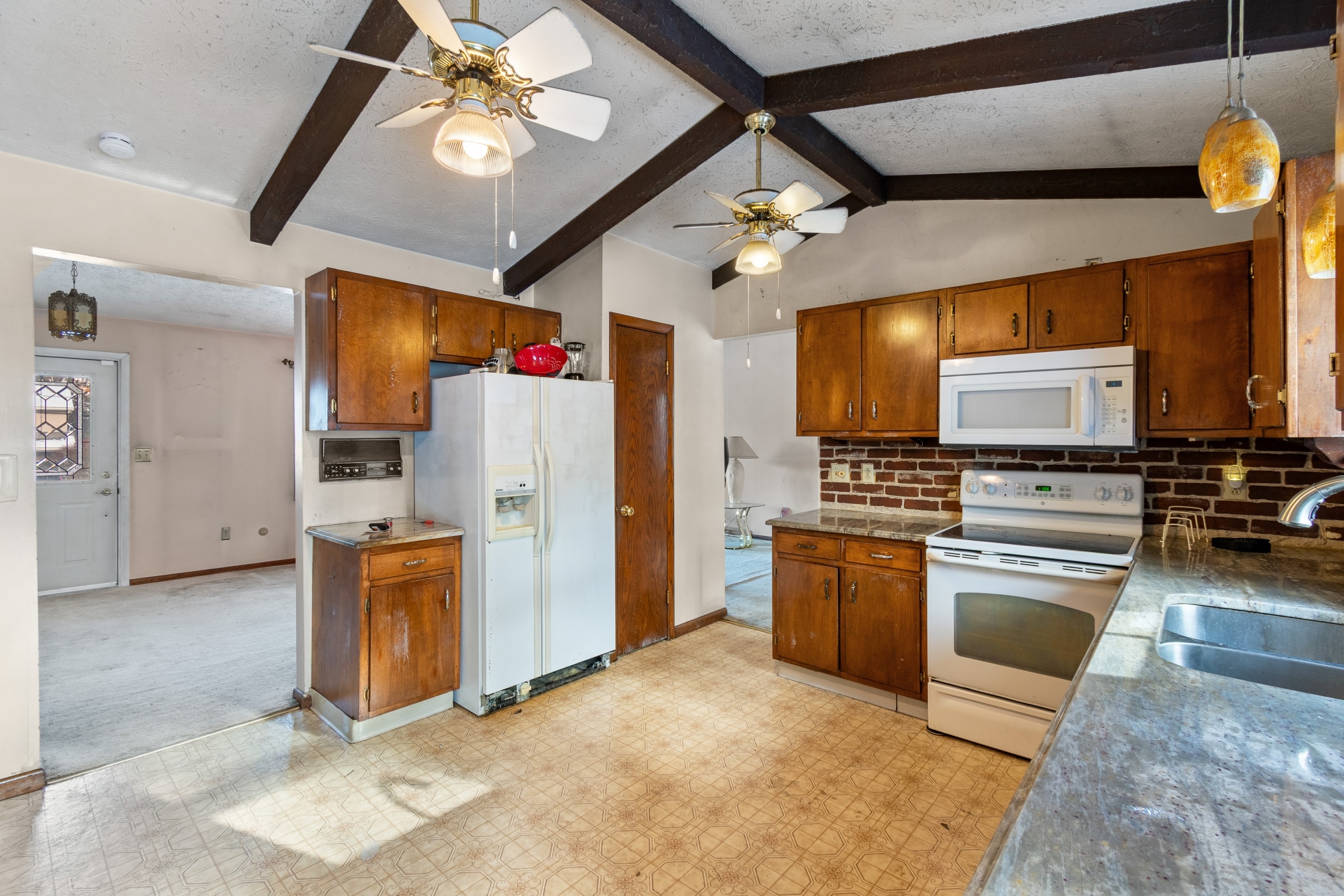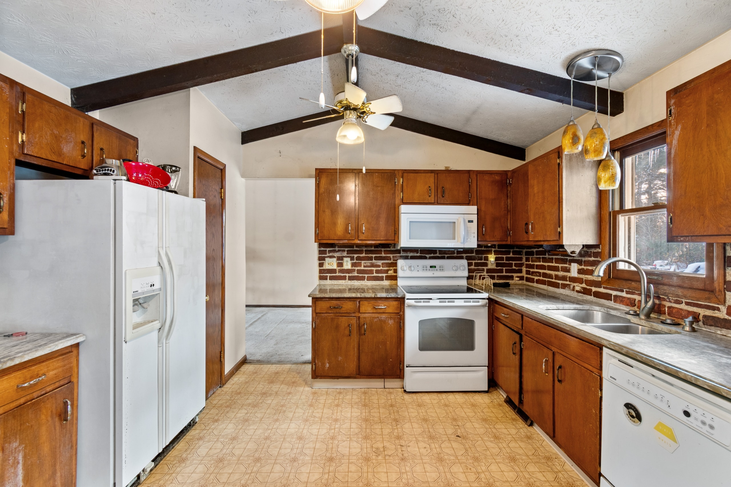The kitchen offers vaulted ceilings, all appliances, ample cabinet storage, and outdoor access to the deck and large .48-acre yard.