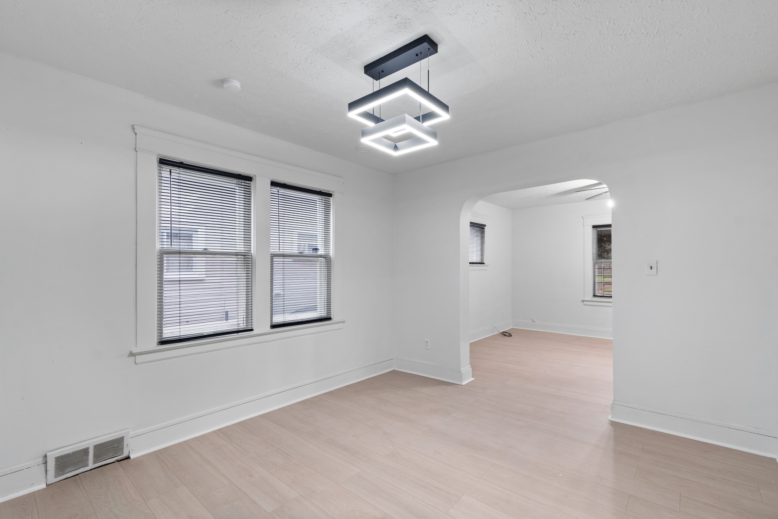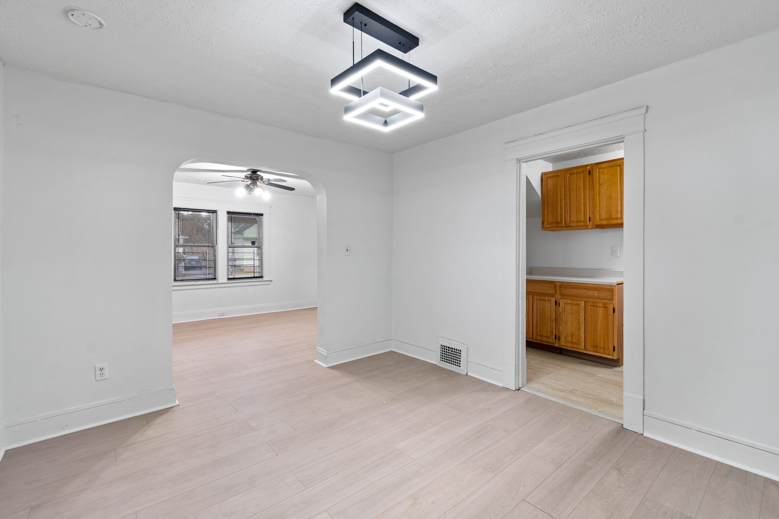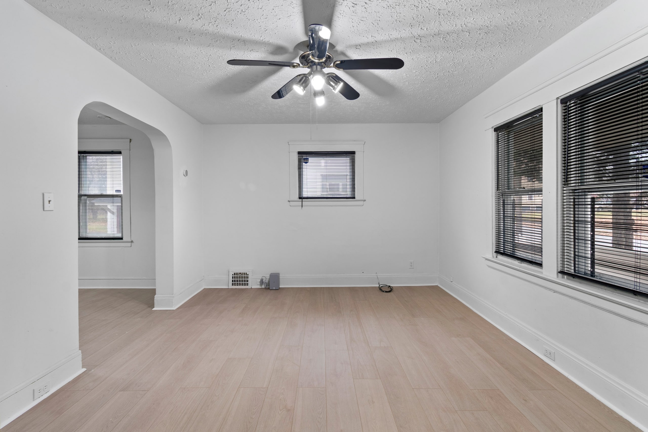 Inside, you’re welcomed by a bright living room filled with natural light, highlighted by multiple windows, durable brand new LVT flooring, arched entryways, and ceiling fans.