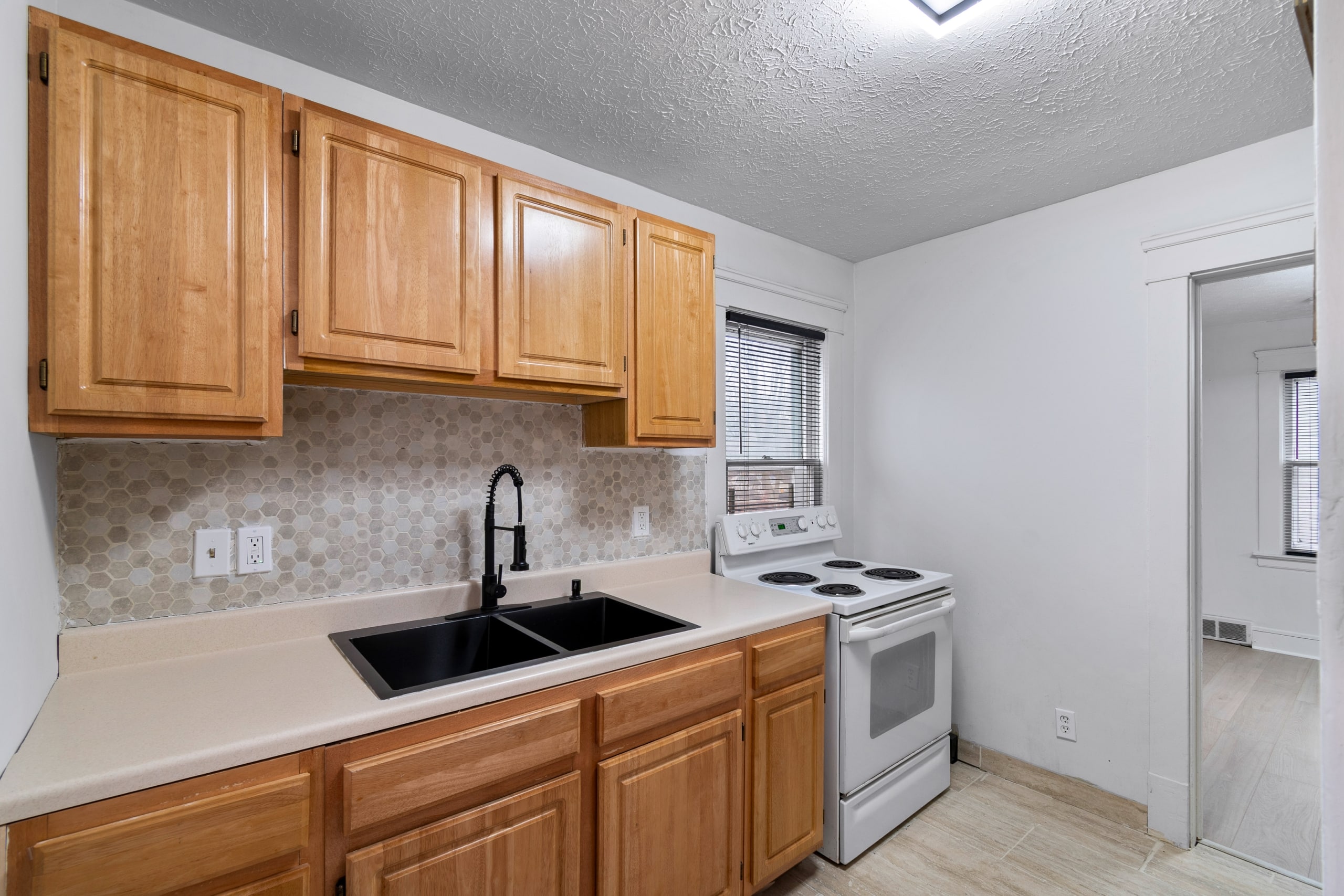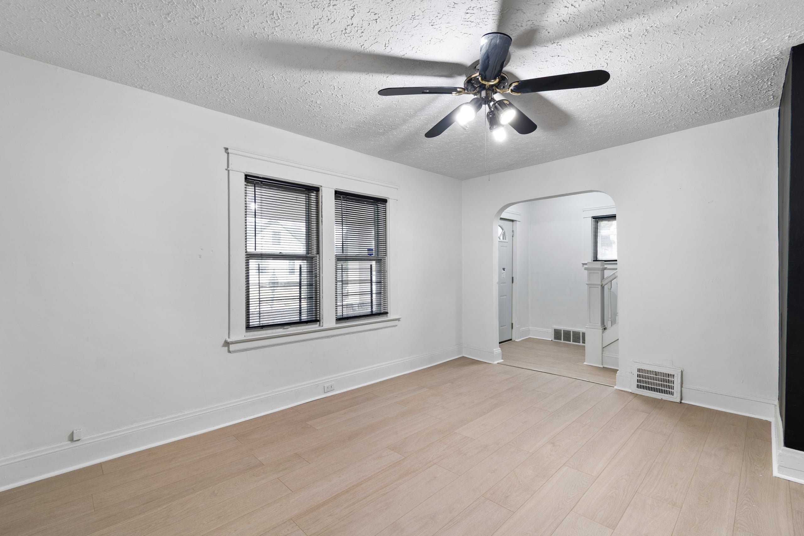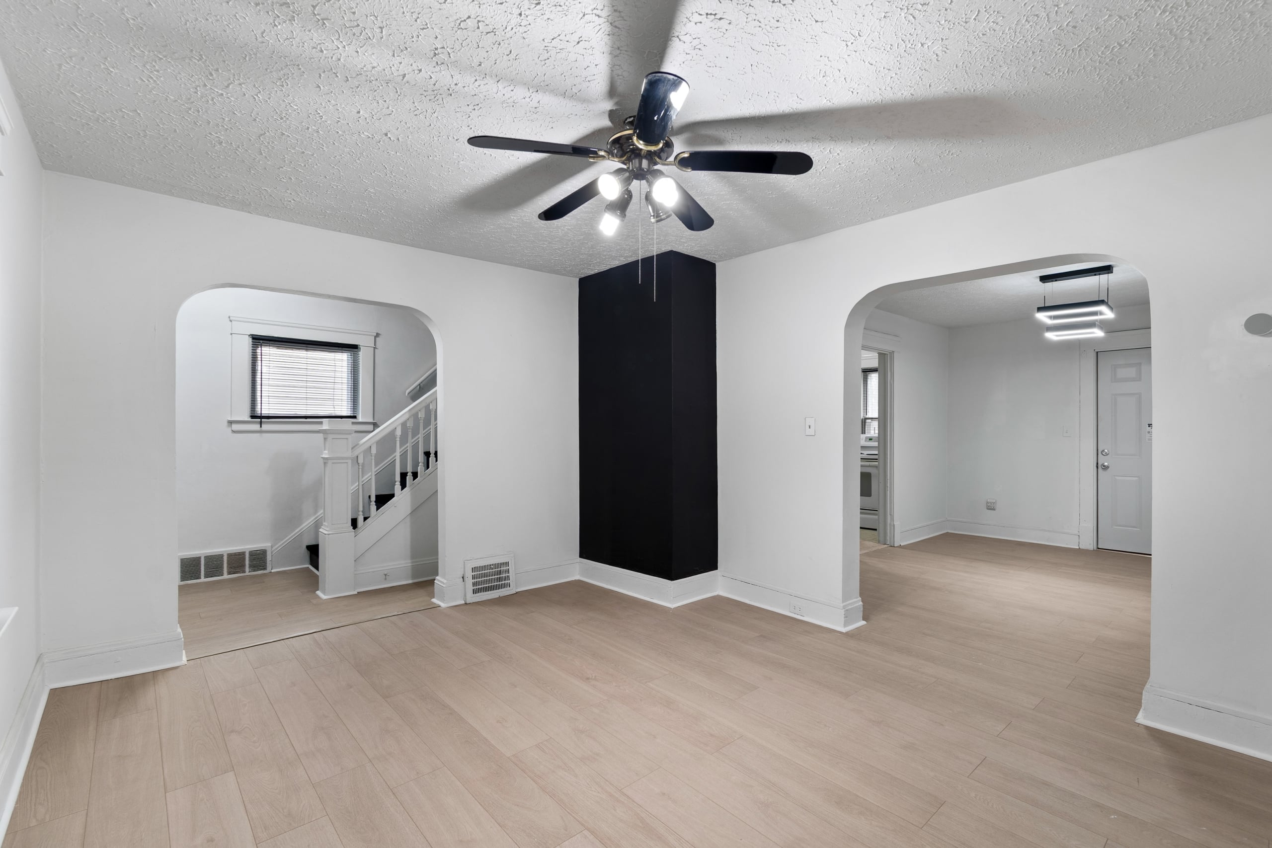 Inside, you’re welcomed by a bright living room filled with natural light, highlighted by multiple windows, durable brand new LVT flooring, arched entryways, and ceiling fans.