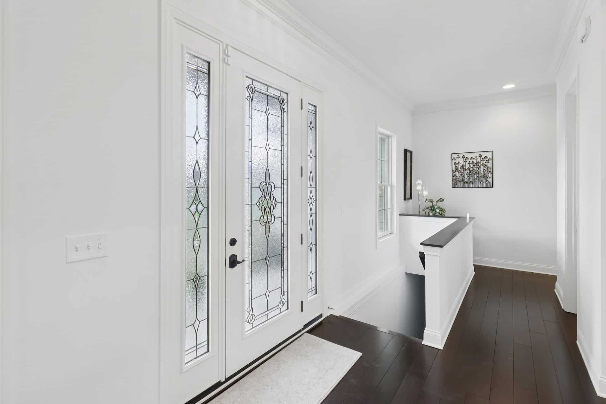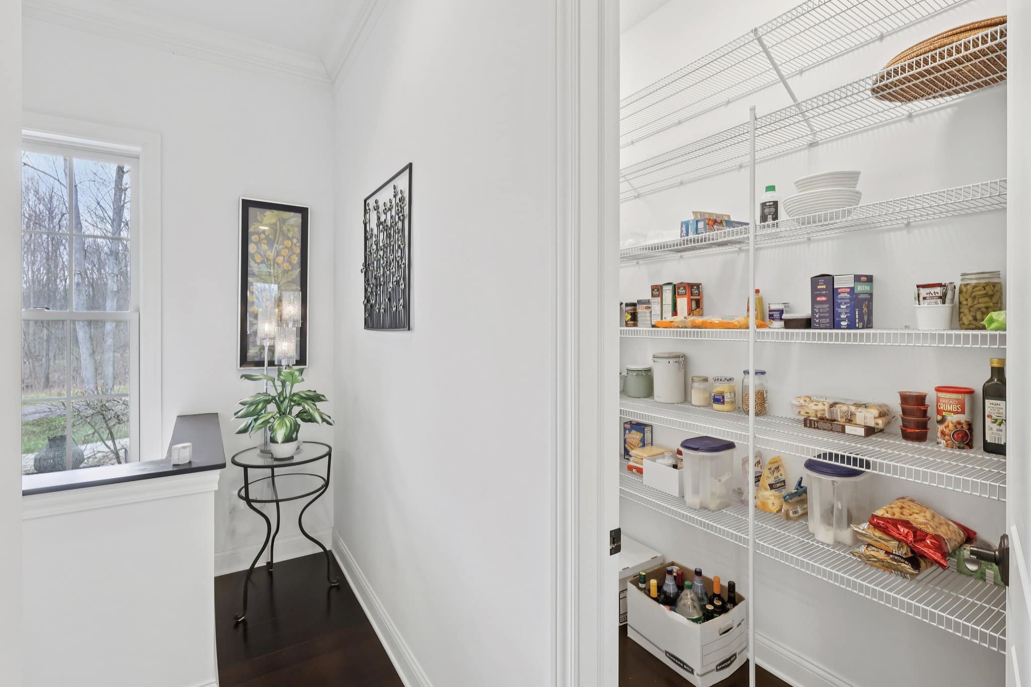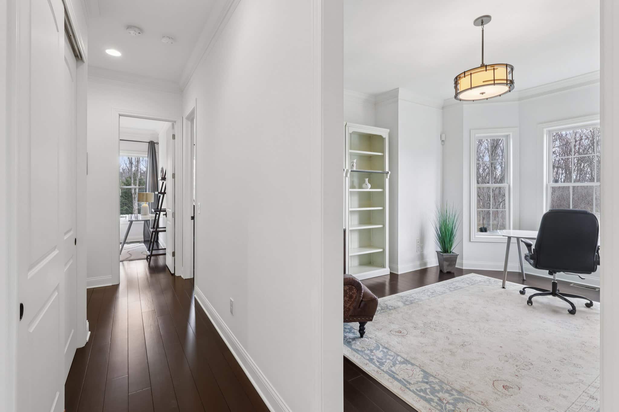 The private office features elegant crown molding and a bayed window, perfect for working from home, and can be easily converted into a fourth bedroom.