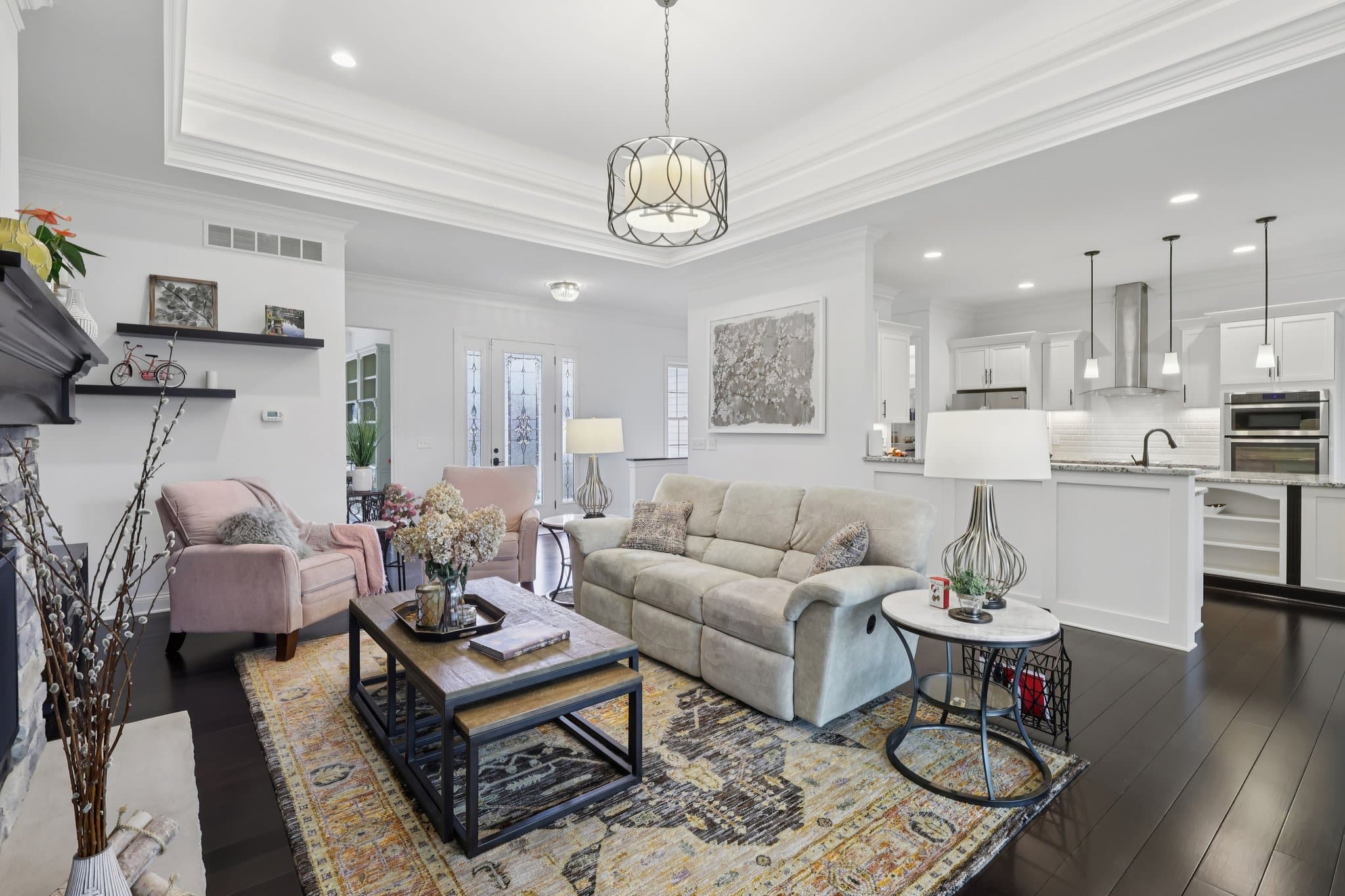 Gather in the stunning living room, showcasing a dramatic tray ceiling with stacked crown molding, and a striking stone fireplace, with direct access to the covered porch.