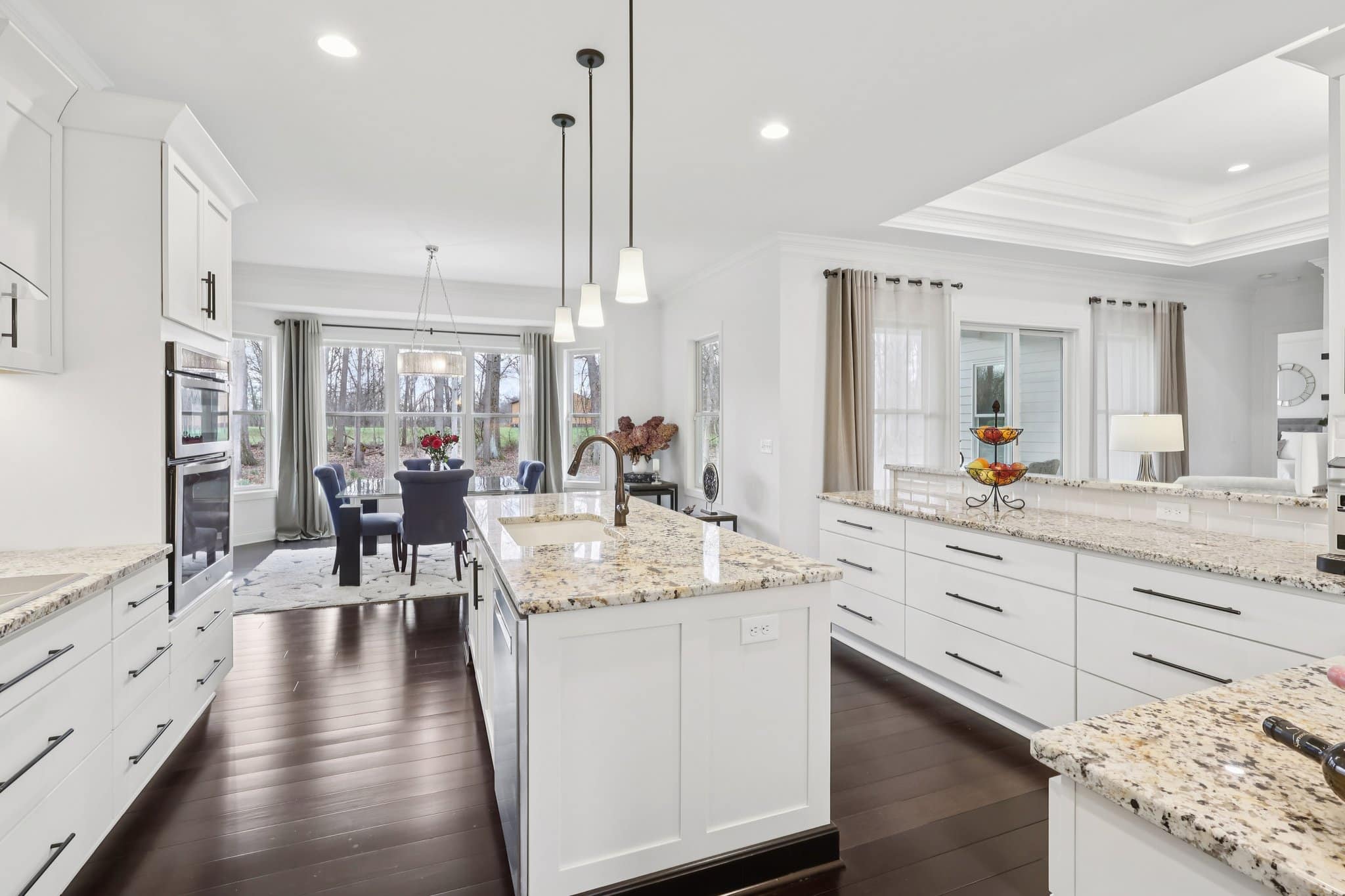 Designed for both function and style, prepare culinary delights in the fabulous chef’s kitchen, complete with extensive cabinetry, granite countertops, a center island, stainless steel appliances, and a spacious dining area with panoramic backyard views.