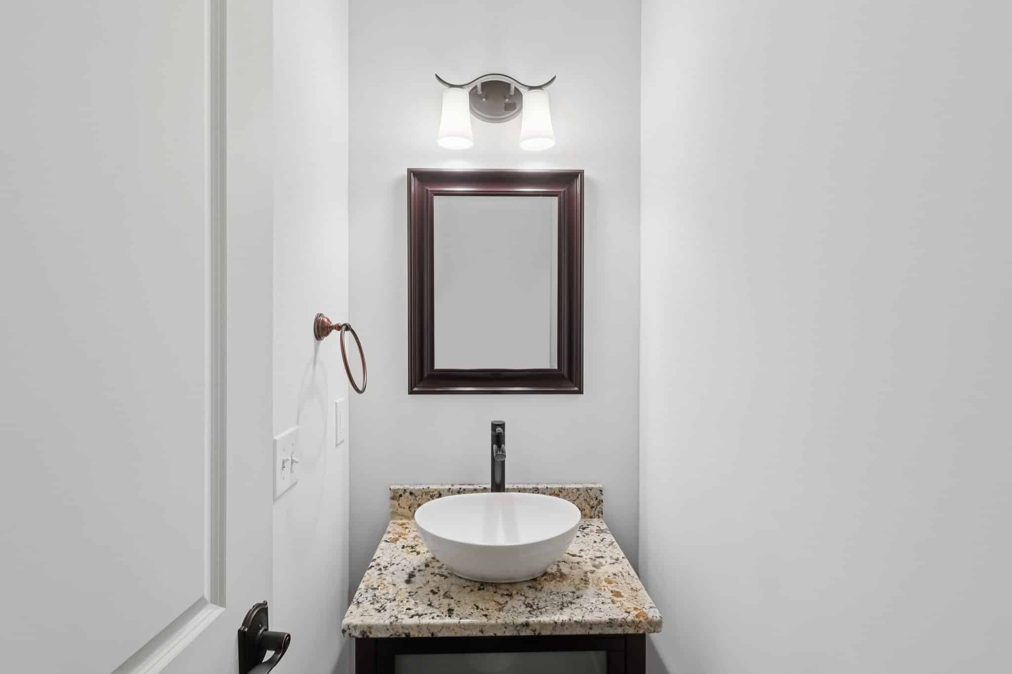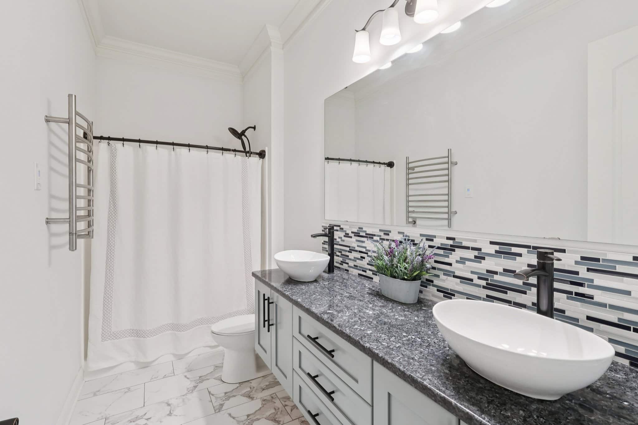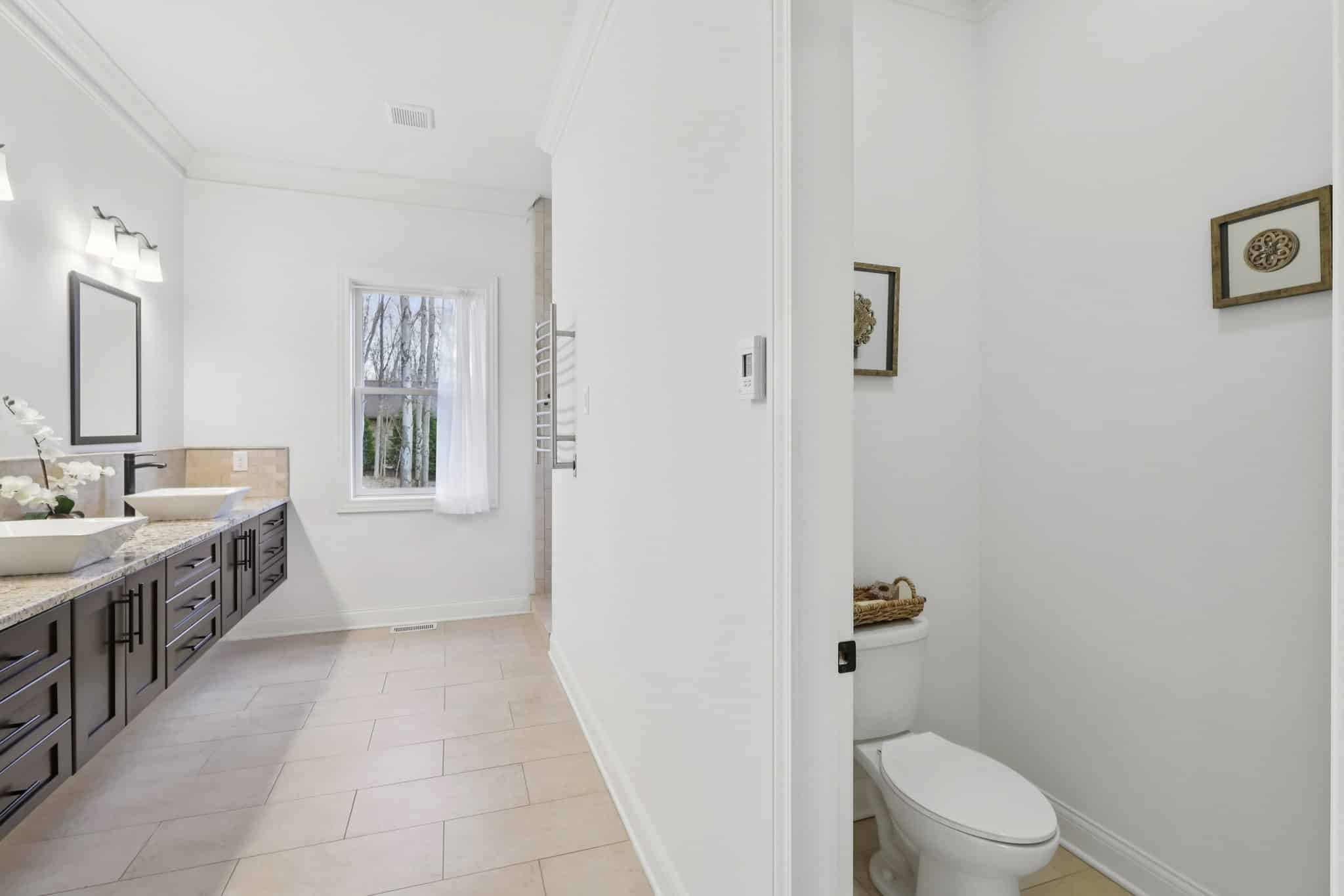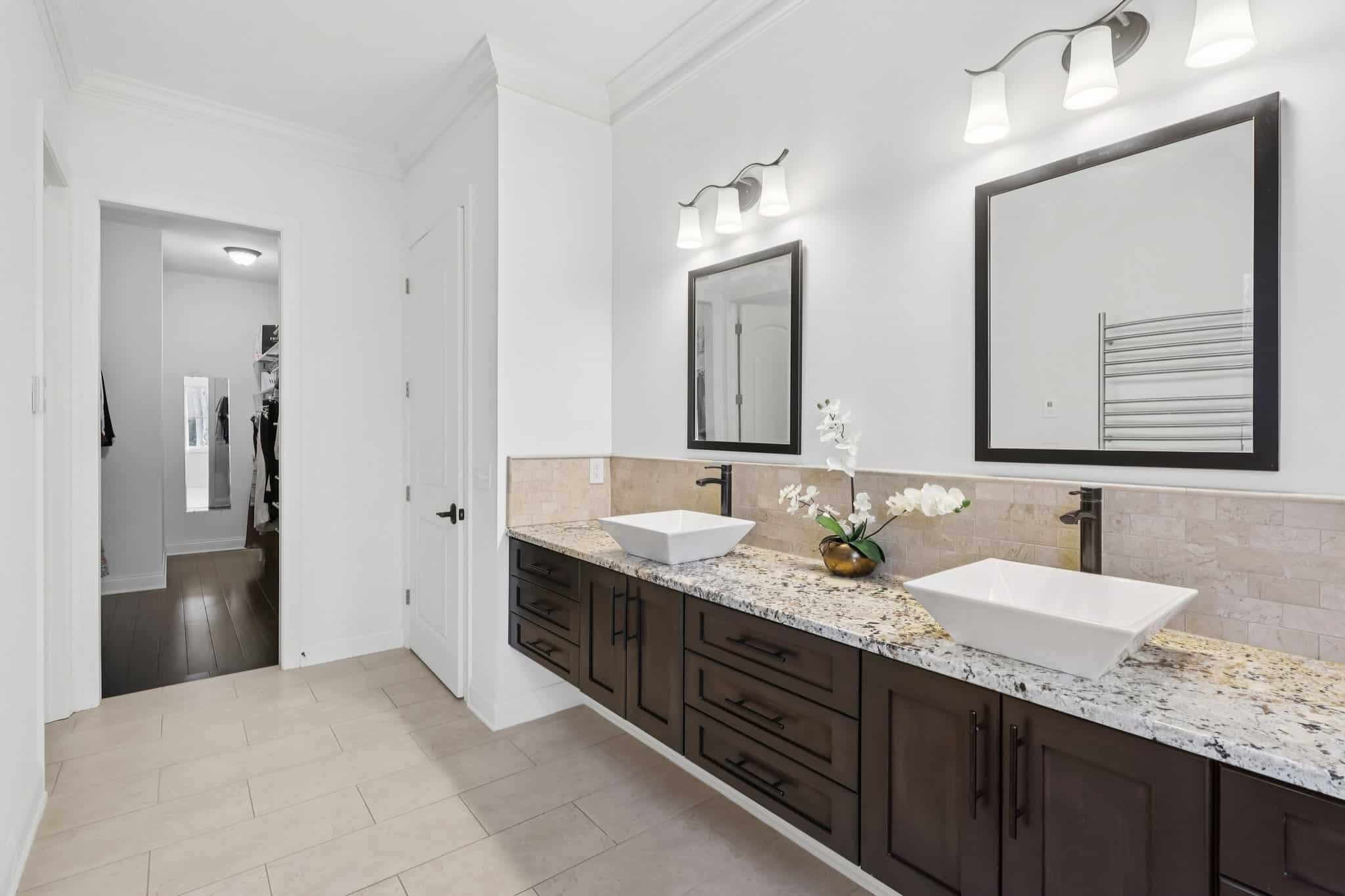 Two additional bedrooms and a full bathroom with double sinks complete the main level.