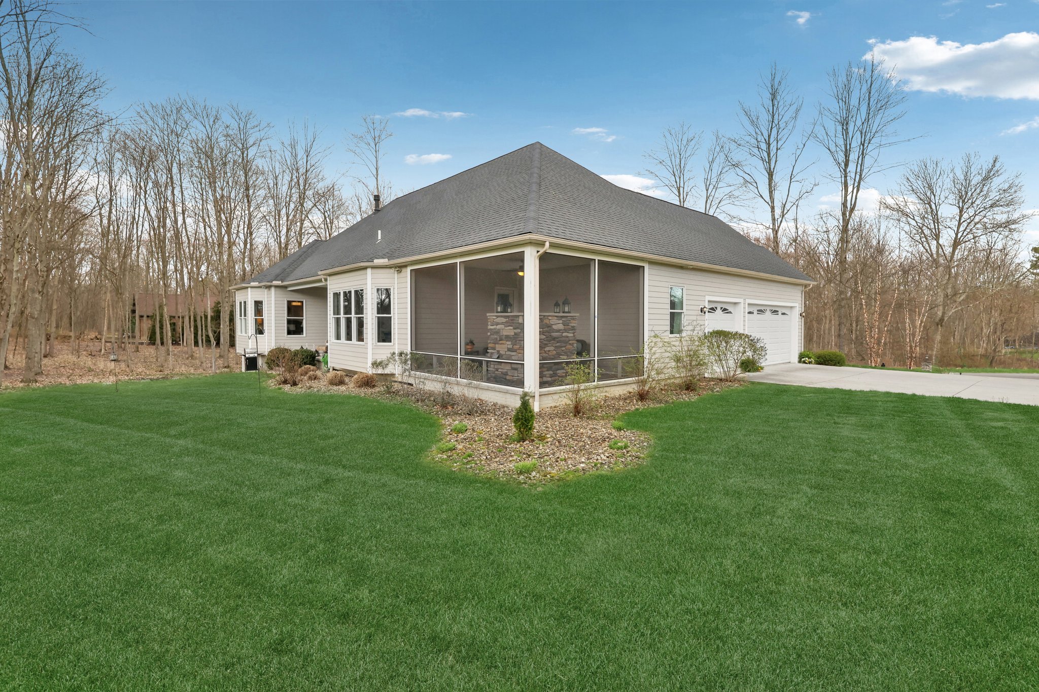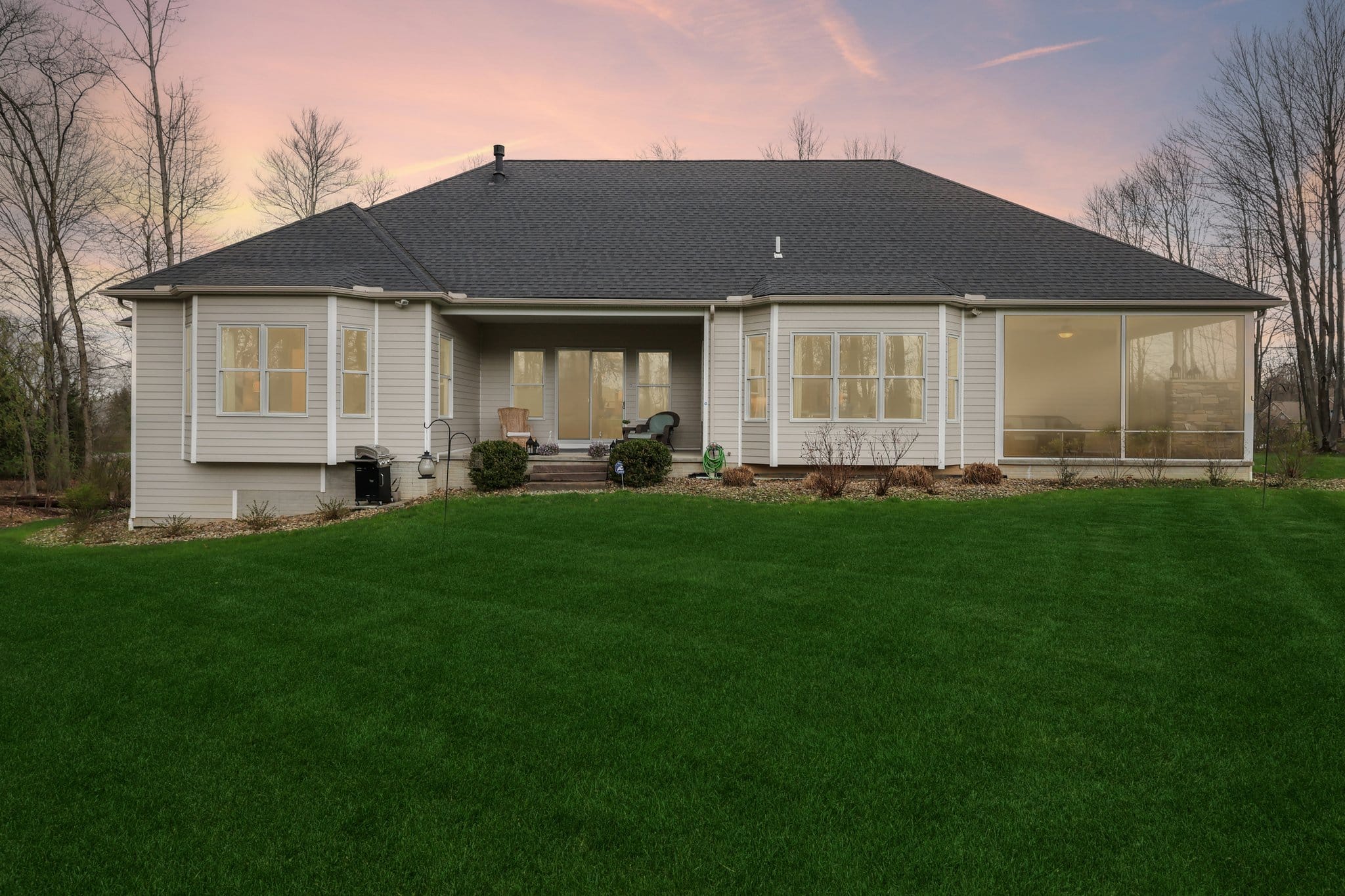 Enjoy crisp evenings on the screened-in, three-season room with a cozy, gas fireplace and ceiling fan.
