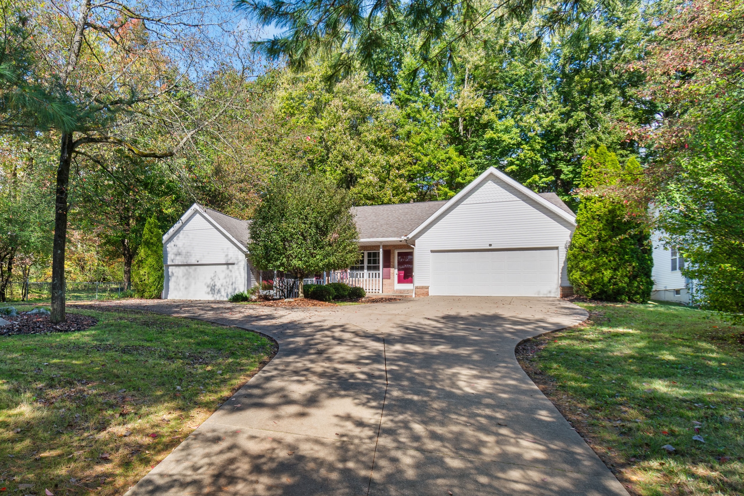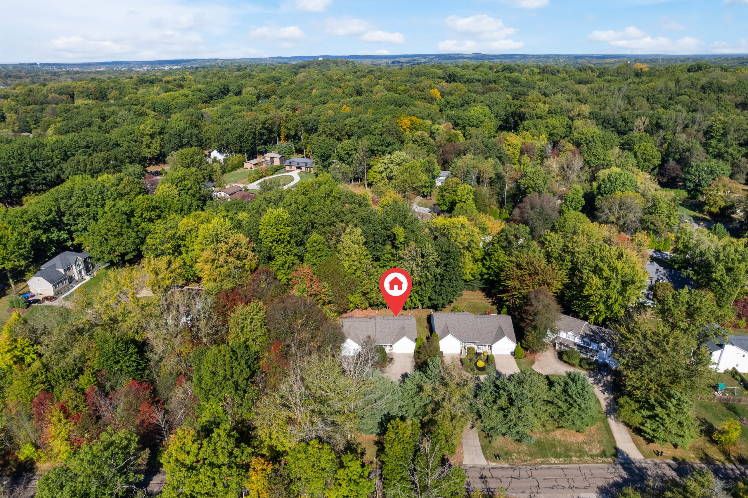 Welcome to this beautifully maintained ranch-style condo in Akron, offering effortless one-floor living and tasteful modern updates throughout. This inviting home features soaring vaulted ceilings, an expansive private deck, an attached two-car garage, and a serene wooded backdrop that enhances privacy and tranquility.