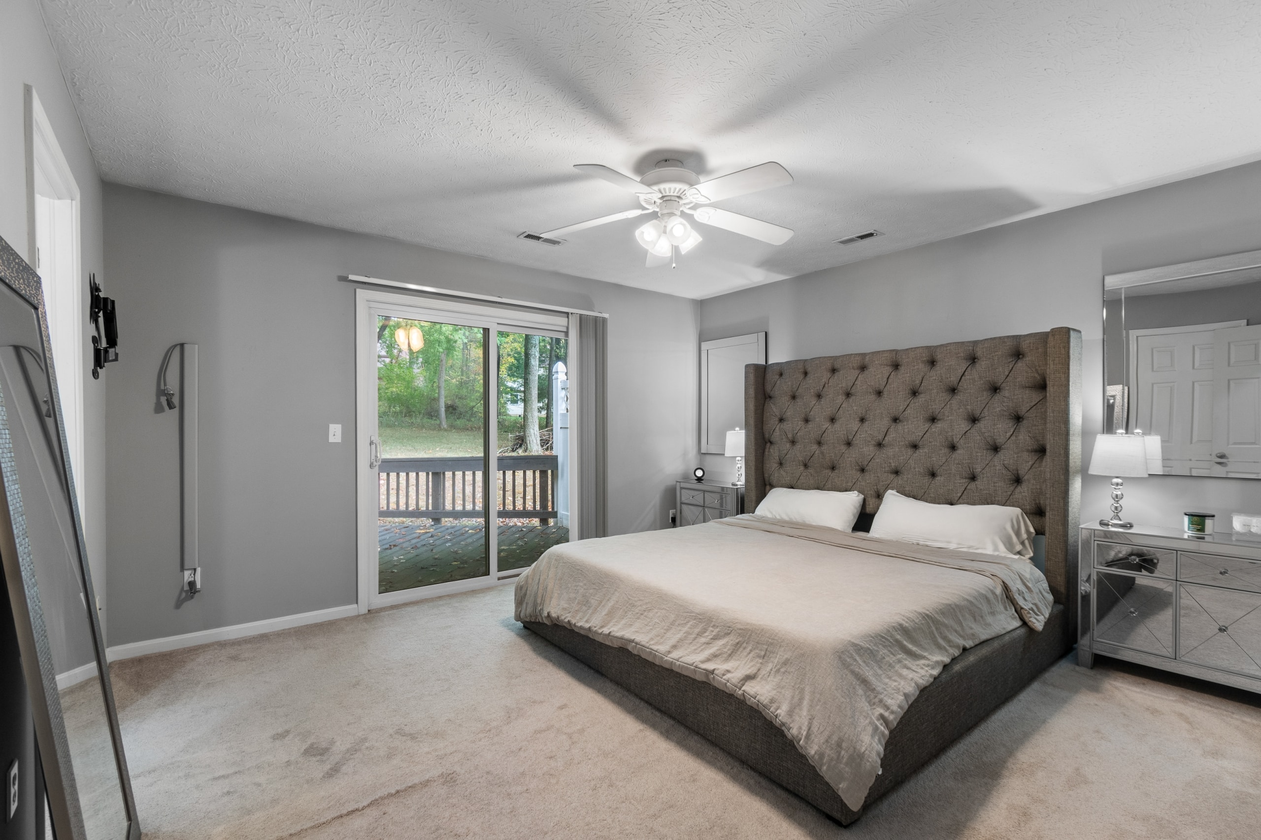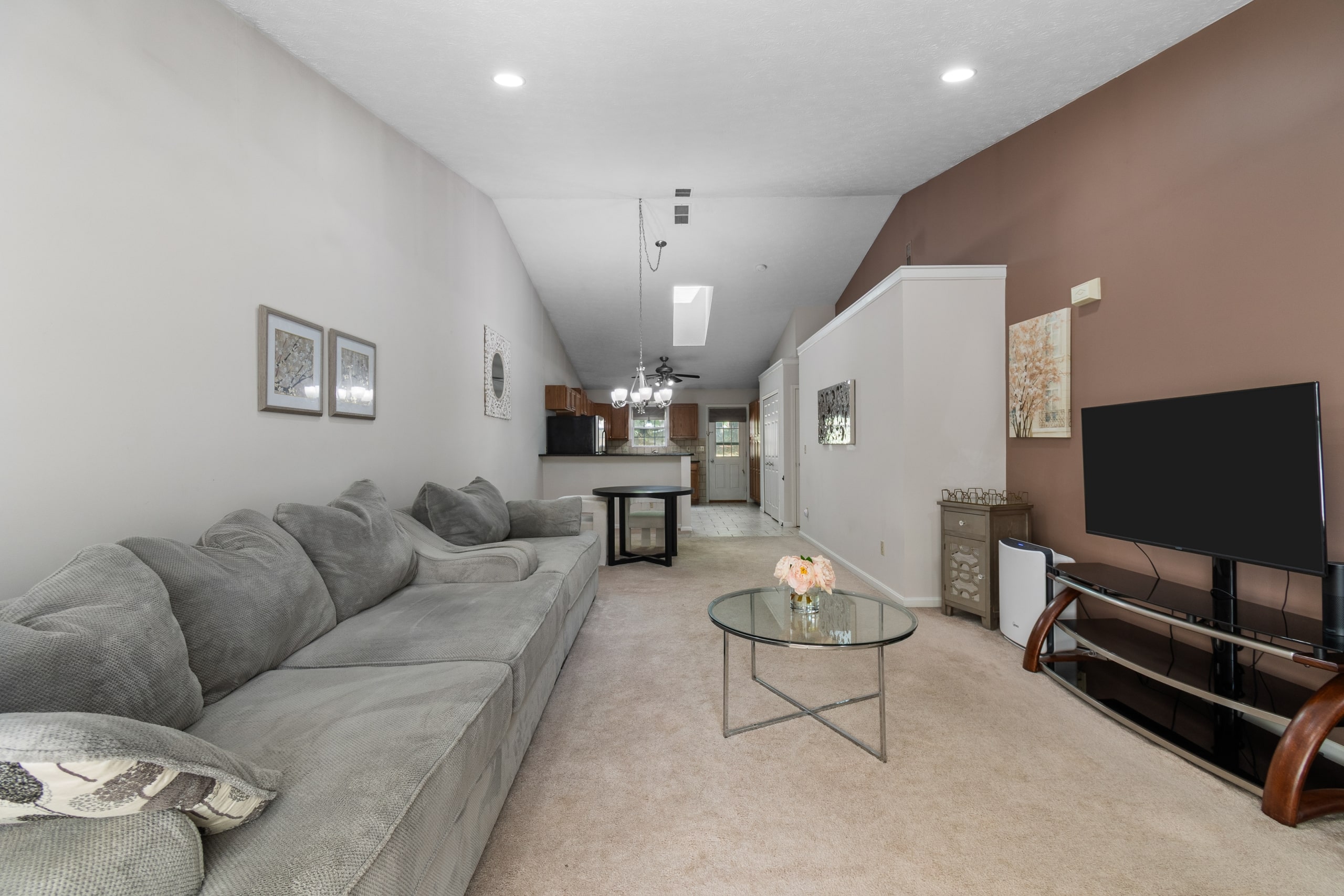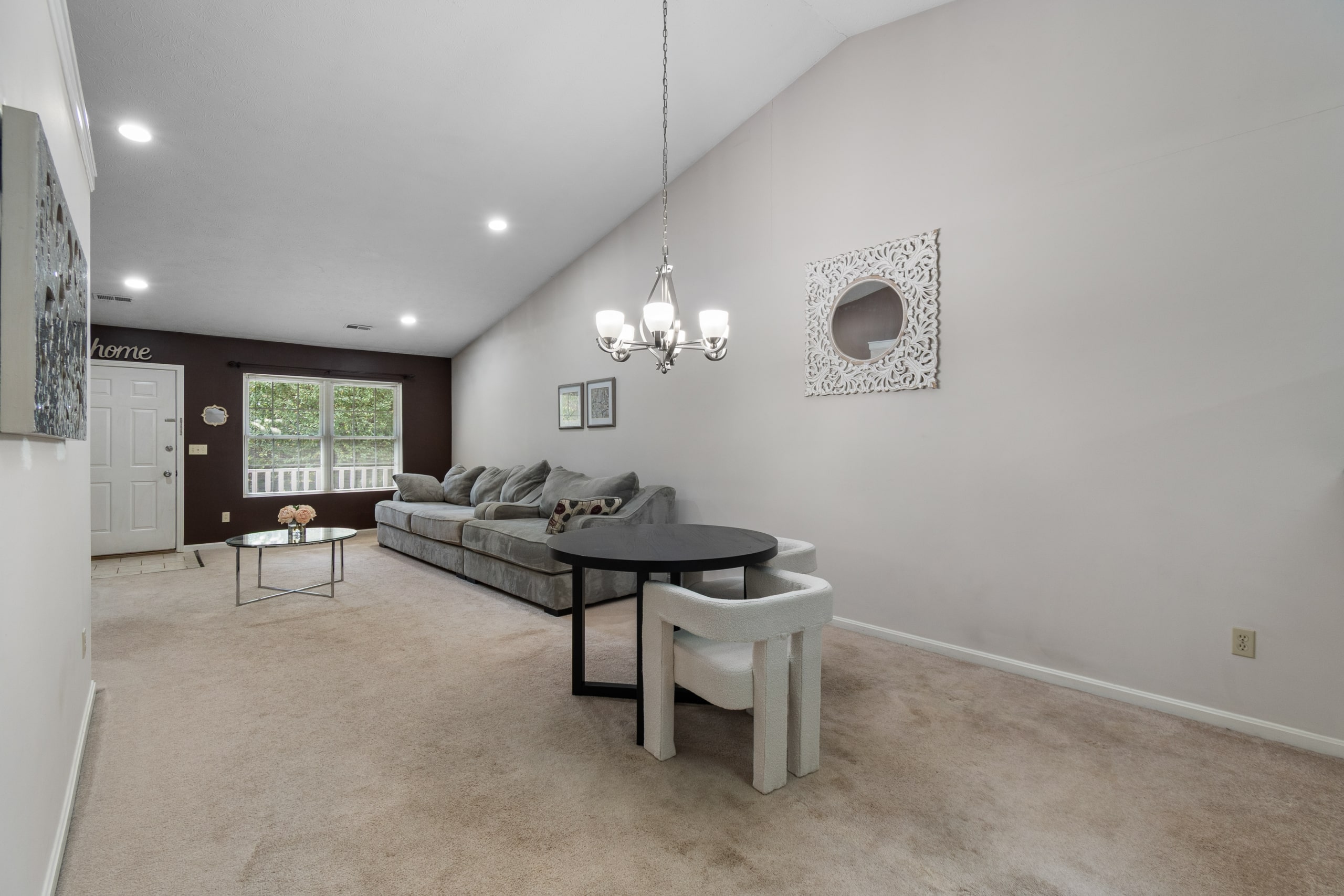 Enjoy your morning coffee on the covered front porch, surrounded by mature trees and peaceful views. Inside, the spacious living room feels bright and open with its high ceiling and natural light, while the adjoining dining area provides the perfect space for entertaining.