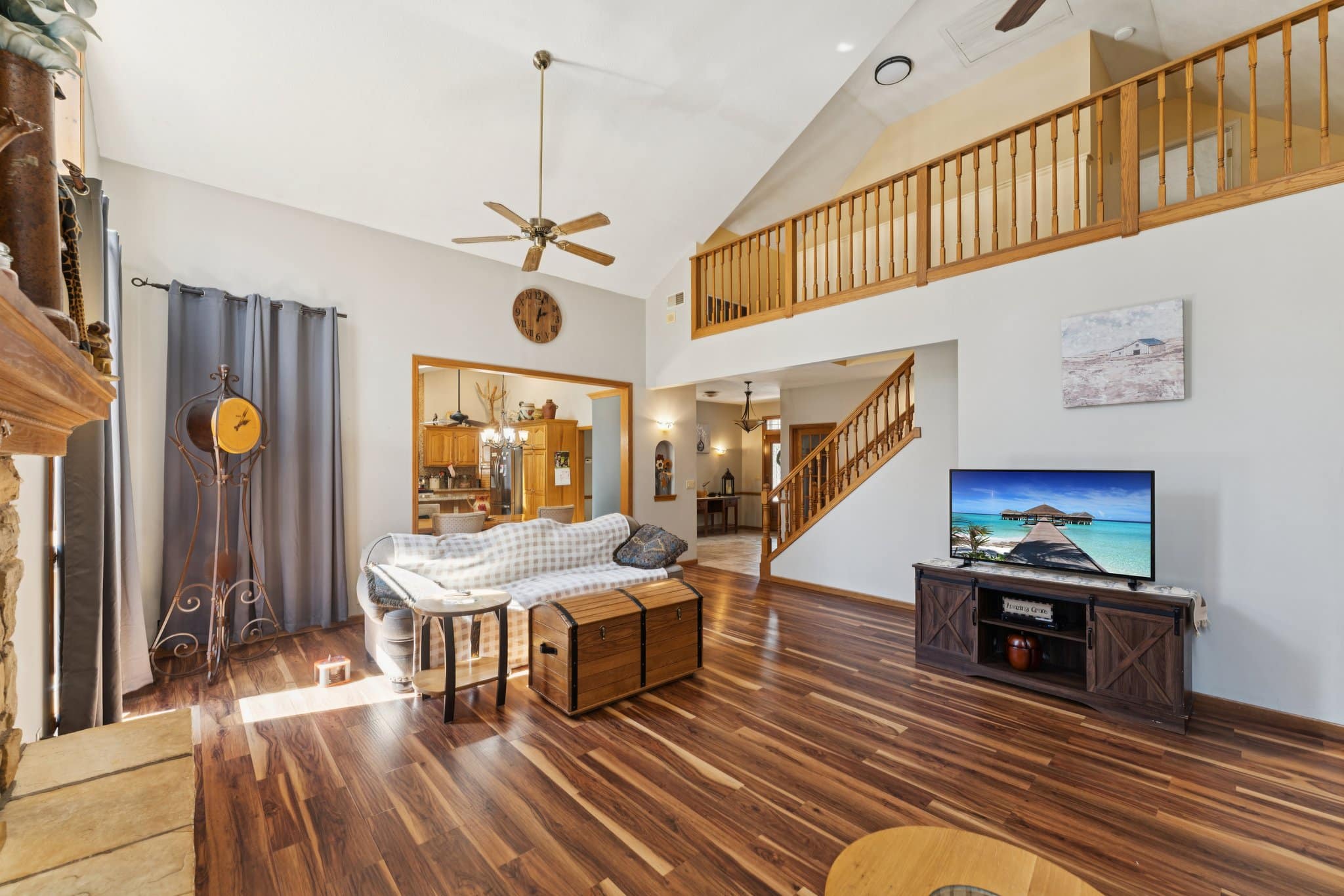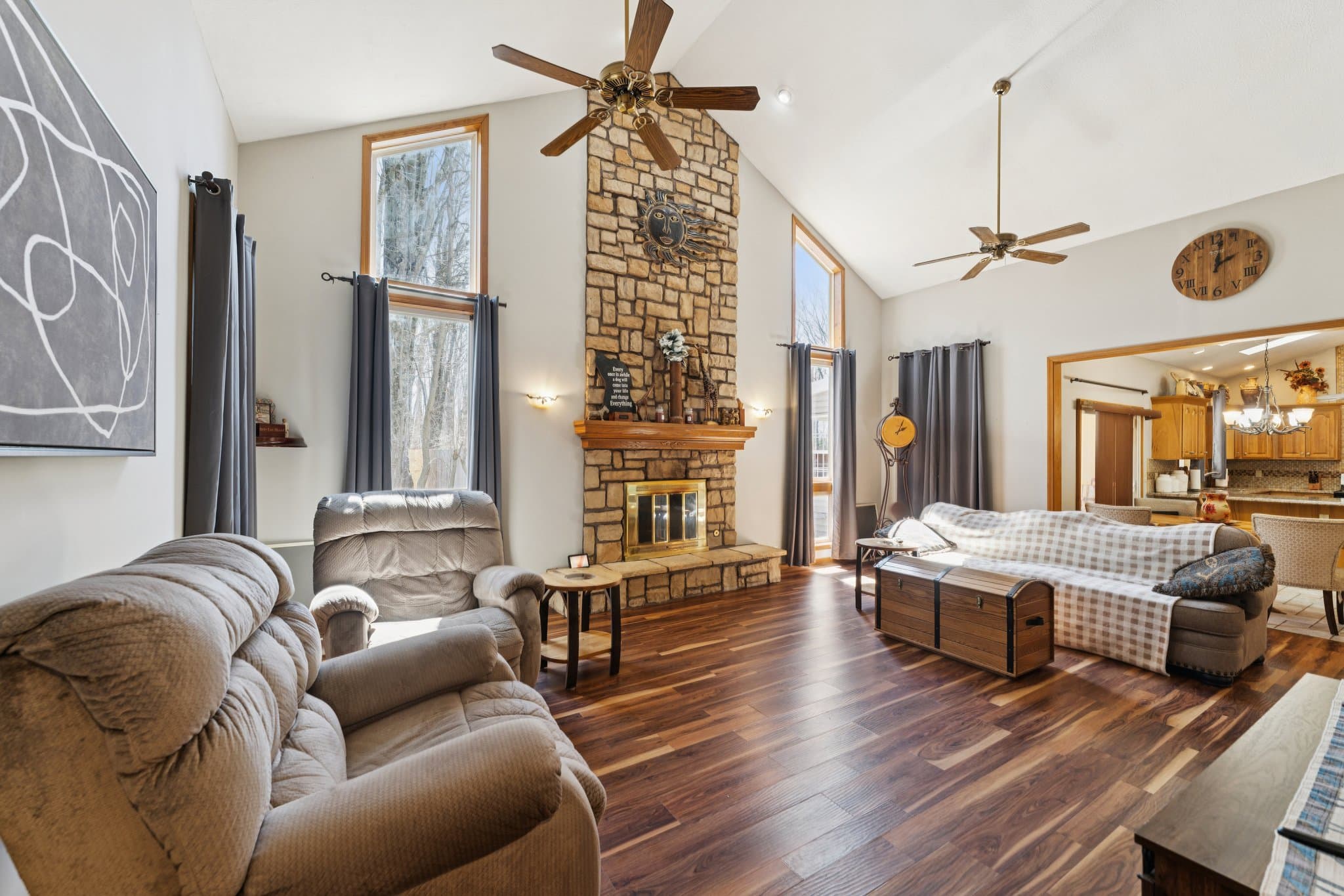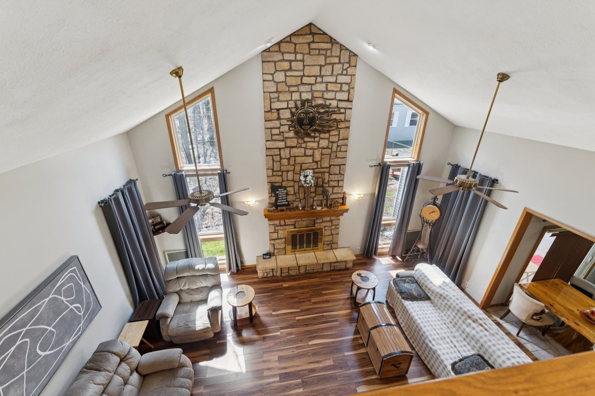 The inviting foyer welcomes you into a dramatic, two-story great room featuring vaulted ceilings, a floor-to-ceiling stone fireplace, and expansive windows that flood the space with natural light.