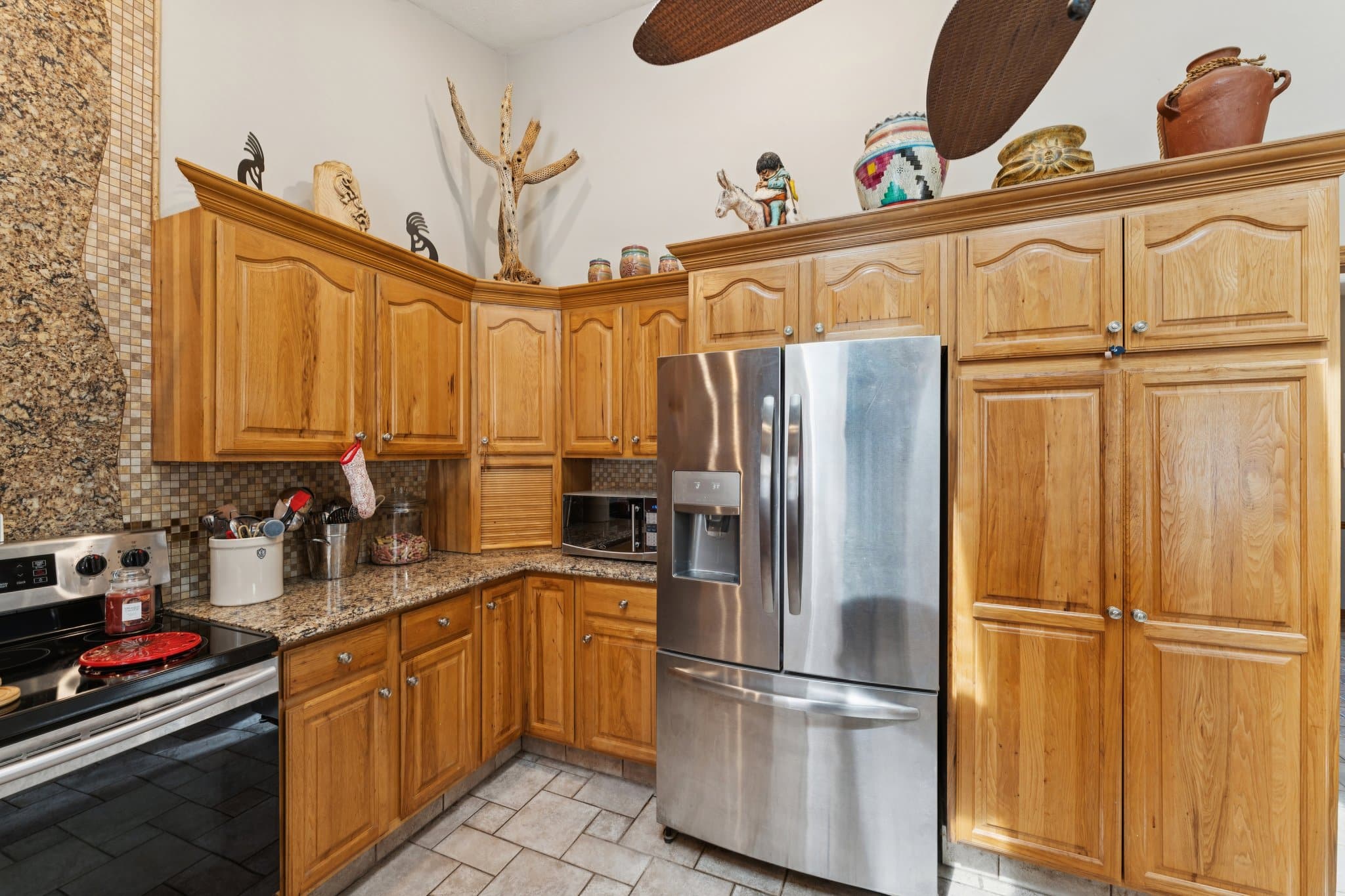 The beautifully designed, vaulted kitchen boasts skylights, extensive cabinetry, Cambria countertops, stainless steel appliances, and a dining area with direct access to the sunroom—perfect for enjoying panoramic views of the serene backyard.