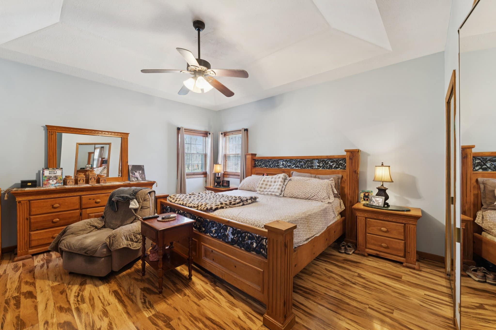The primary suite is a private retreat with a tray ceiling, walk-in closet, and ensuite bath complete with double sinks, a Jacuzzi tub, and separate shower.