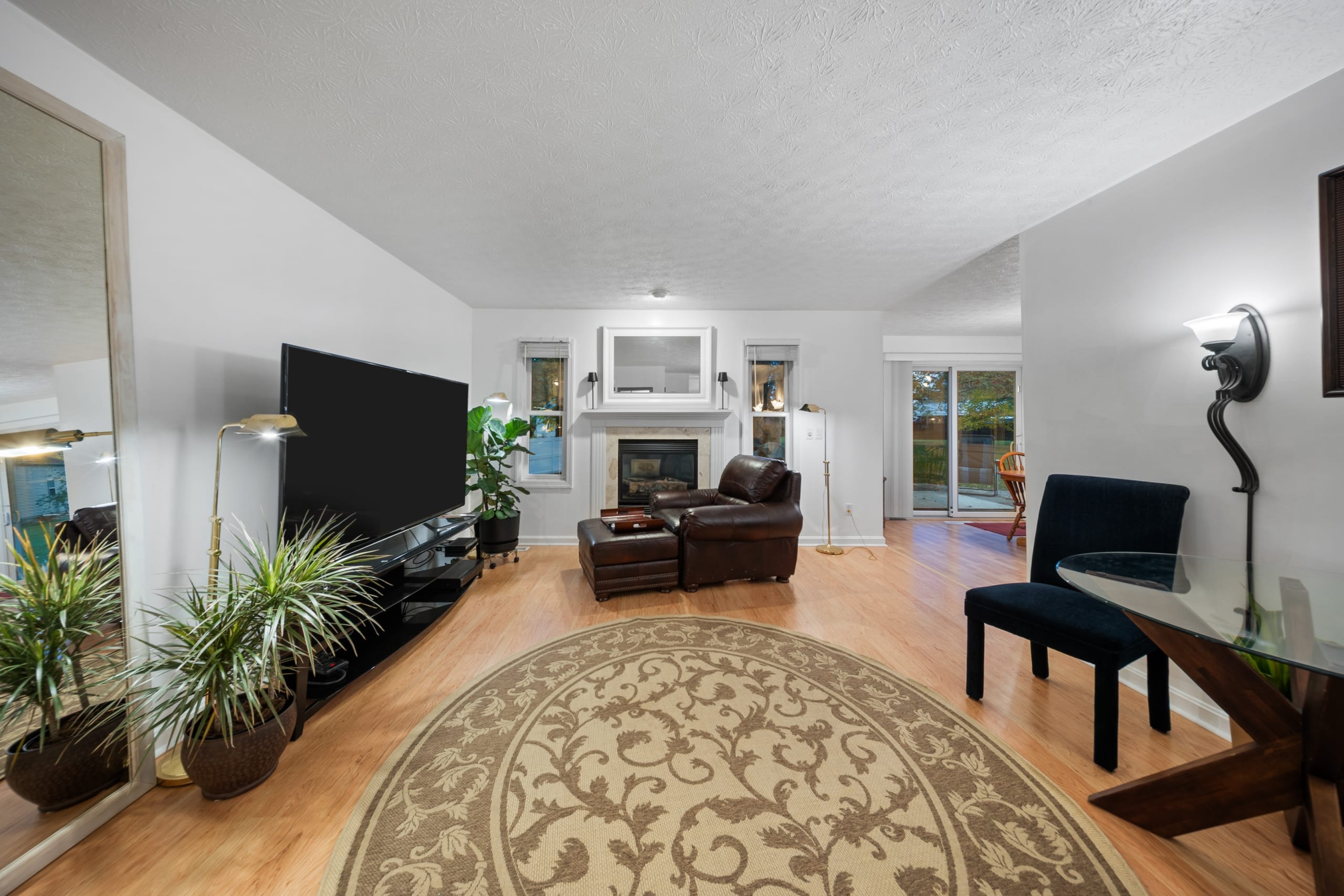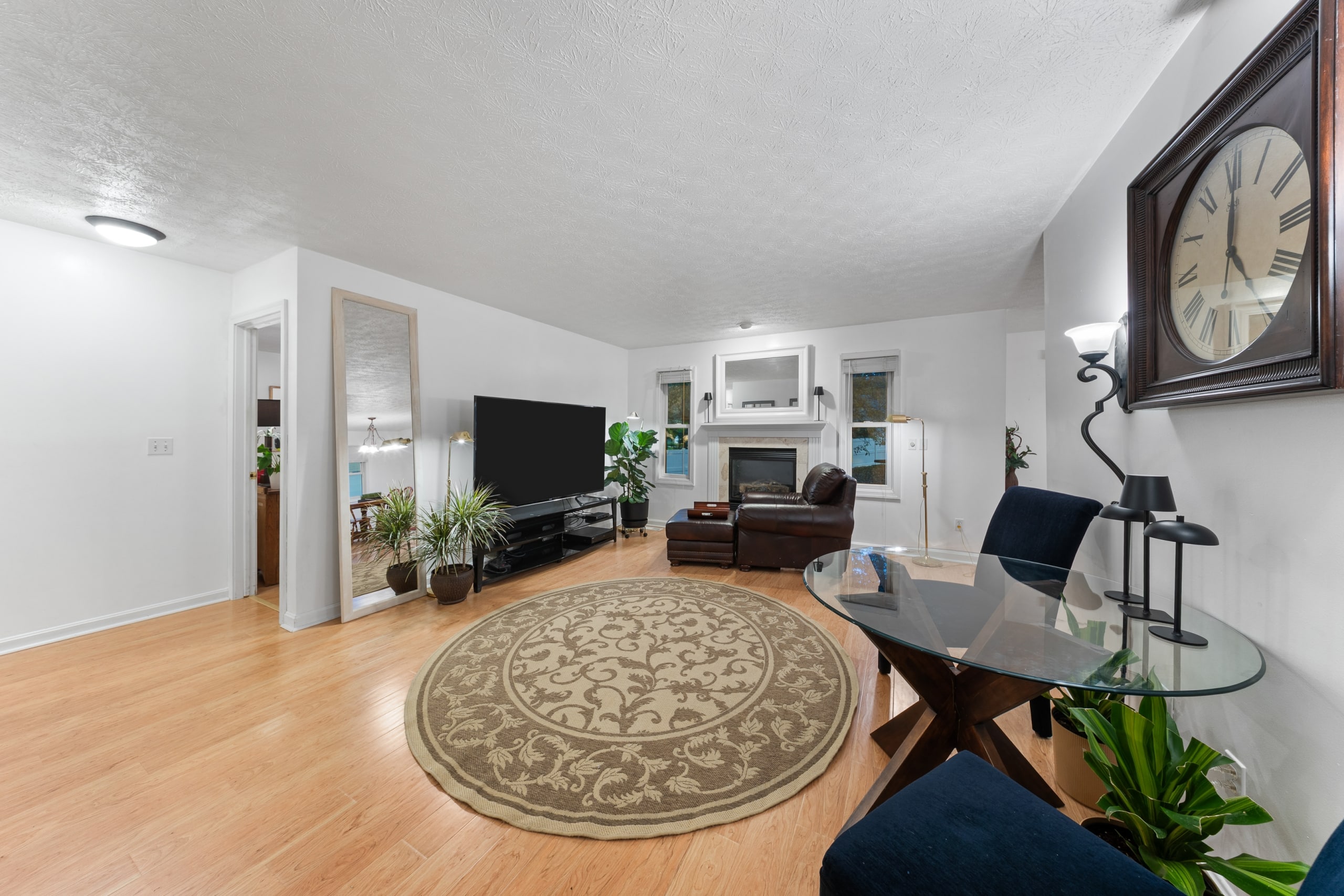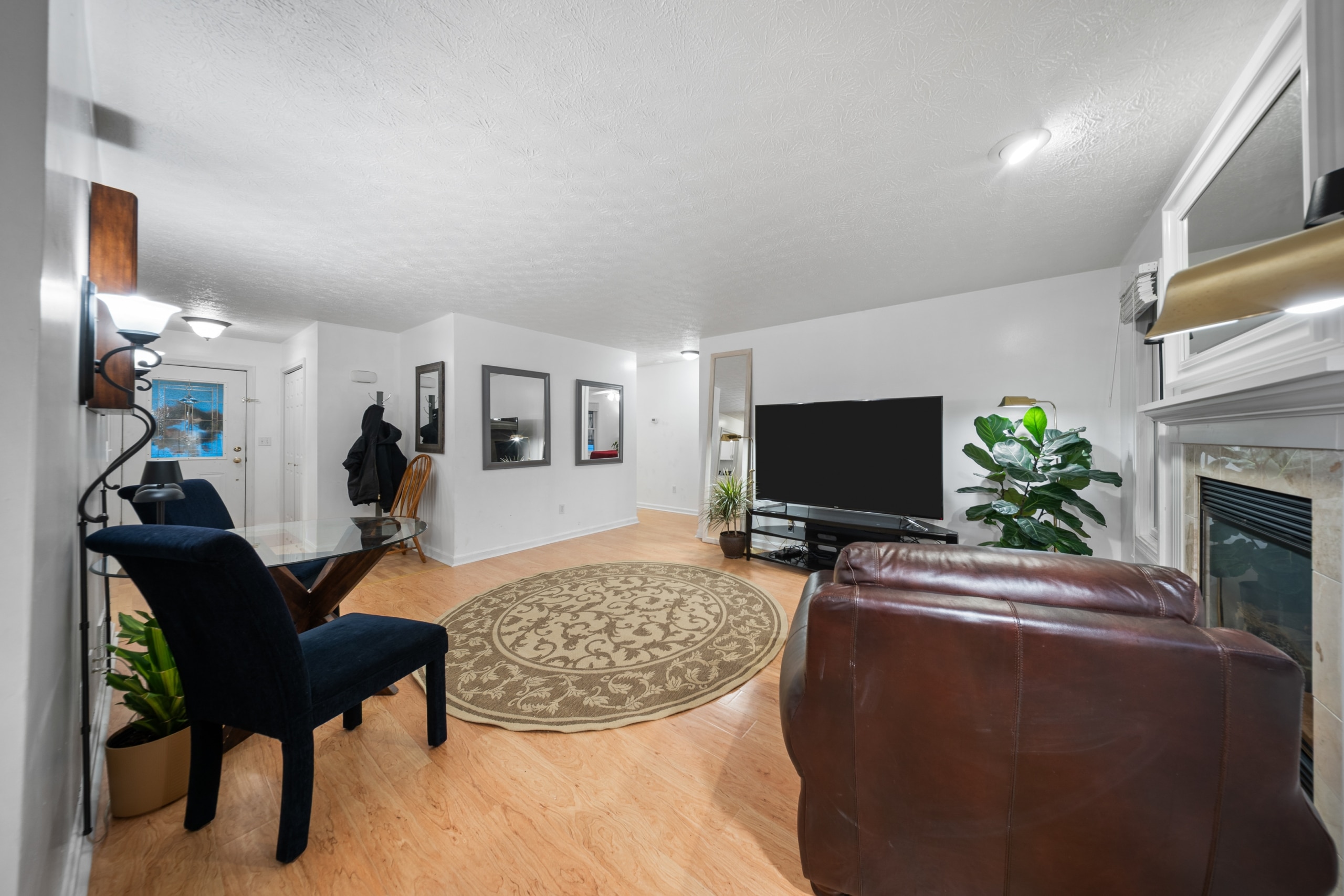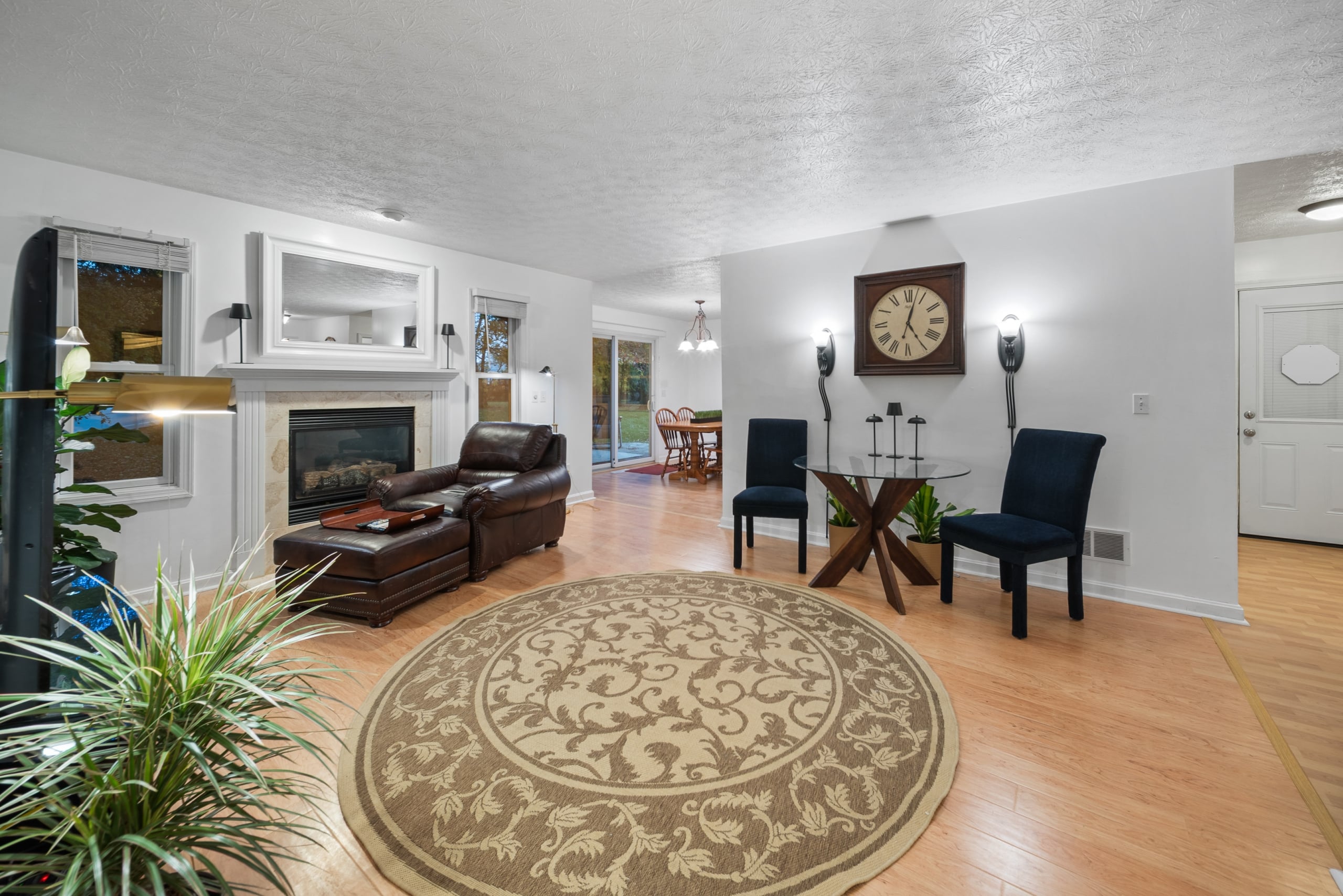 Step inside to a bright and inviting living room featuring a cozy gas fireplace, flanked by windows that fill the space with natural light.
