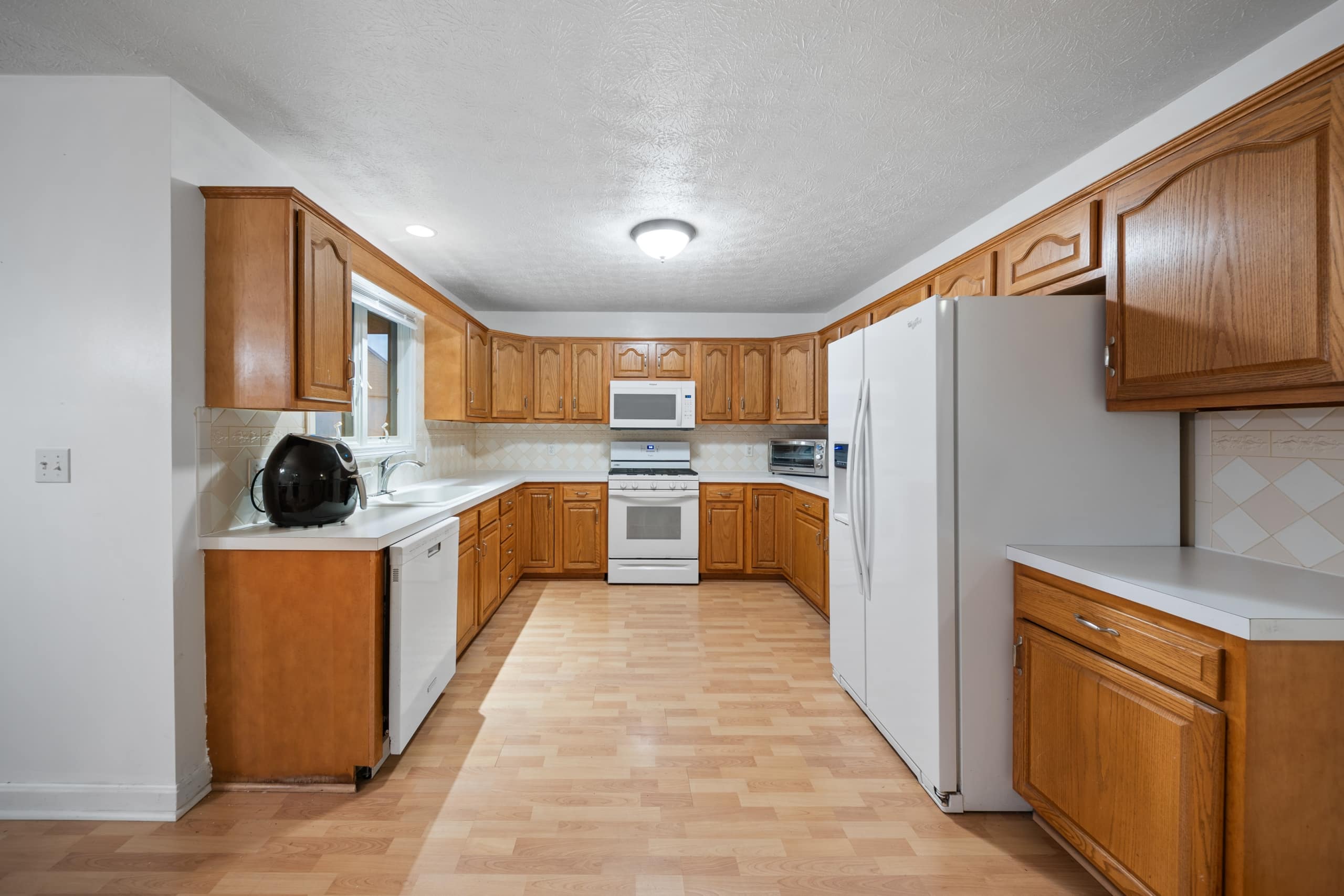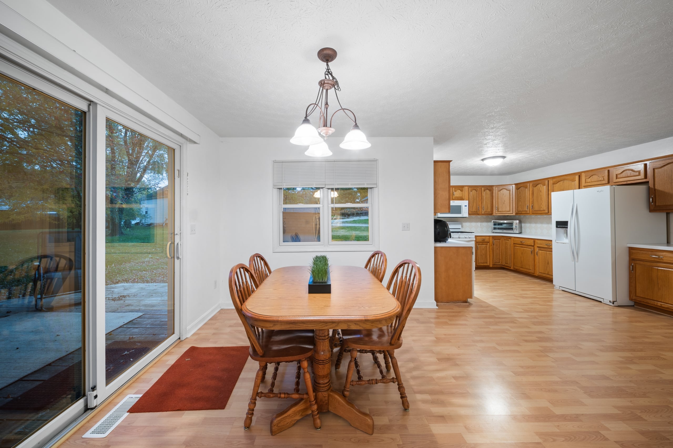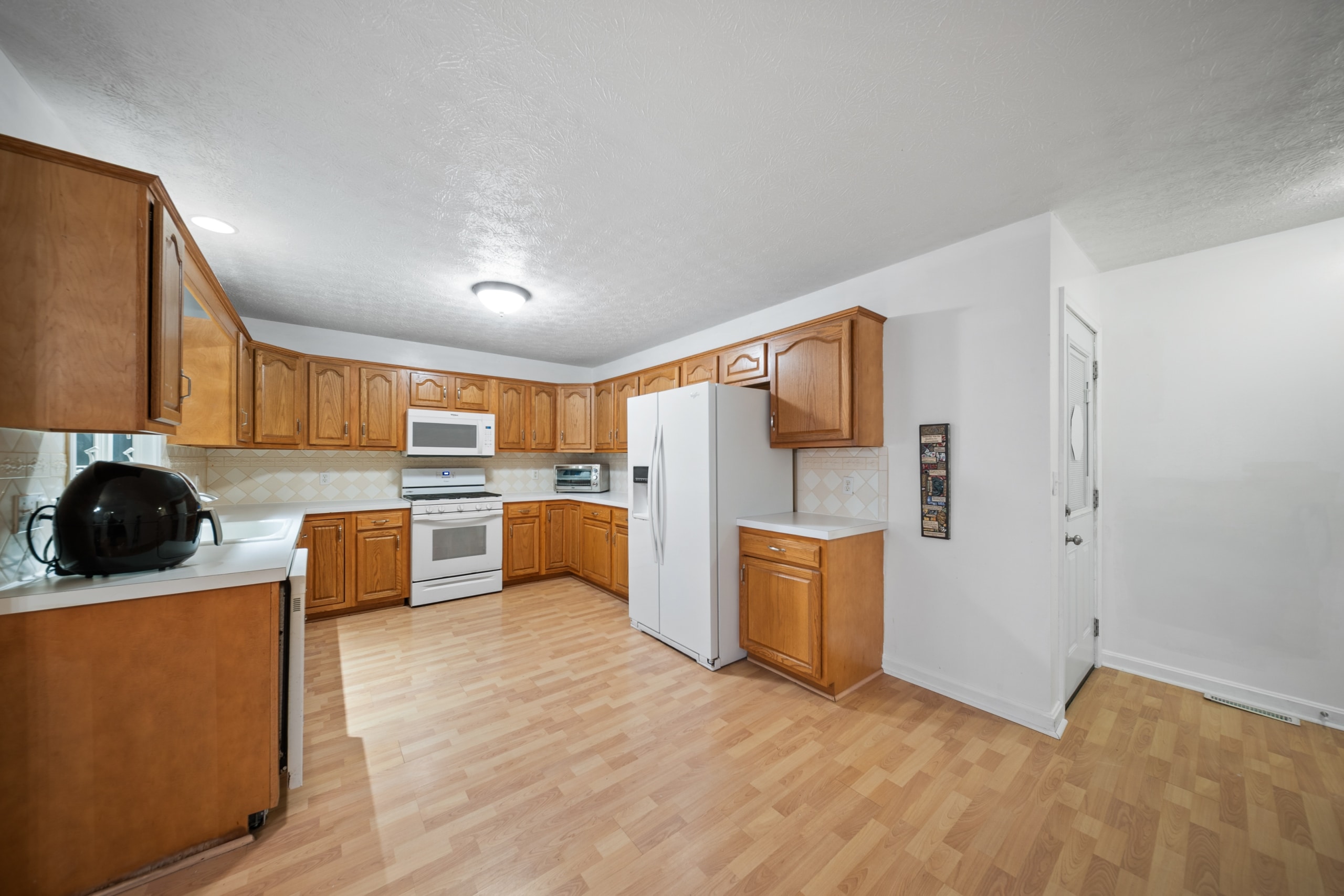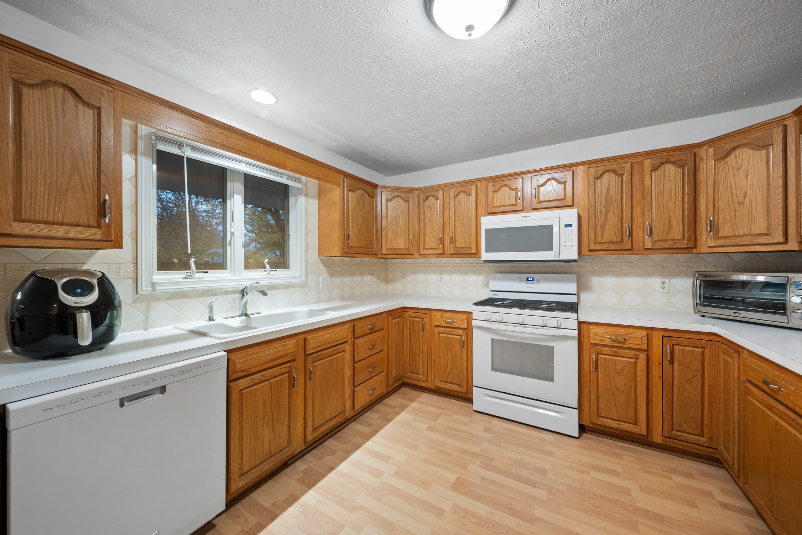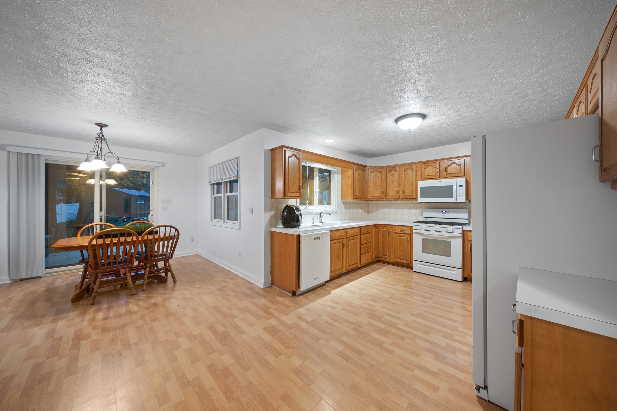 The spacious kitchen offers extensive cabinetry, generous counter space, and all appliances. There is an adjacent dining area with sliders to the deck.